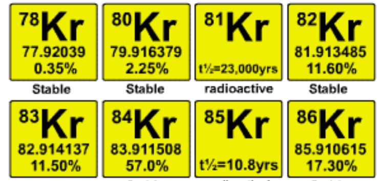 There are six stable isotopes of krypton that occur in nature (shown above). (http://www.softschools.com/facts/periodic_table/krypton_facts/214/)