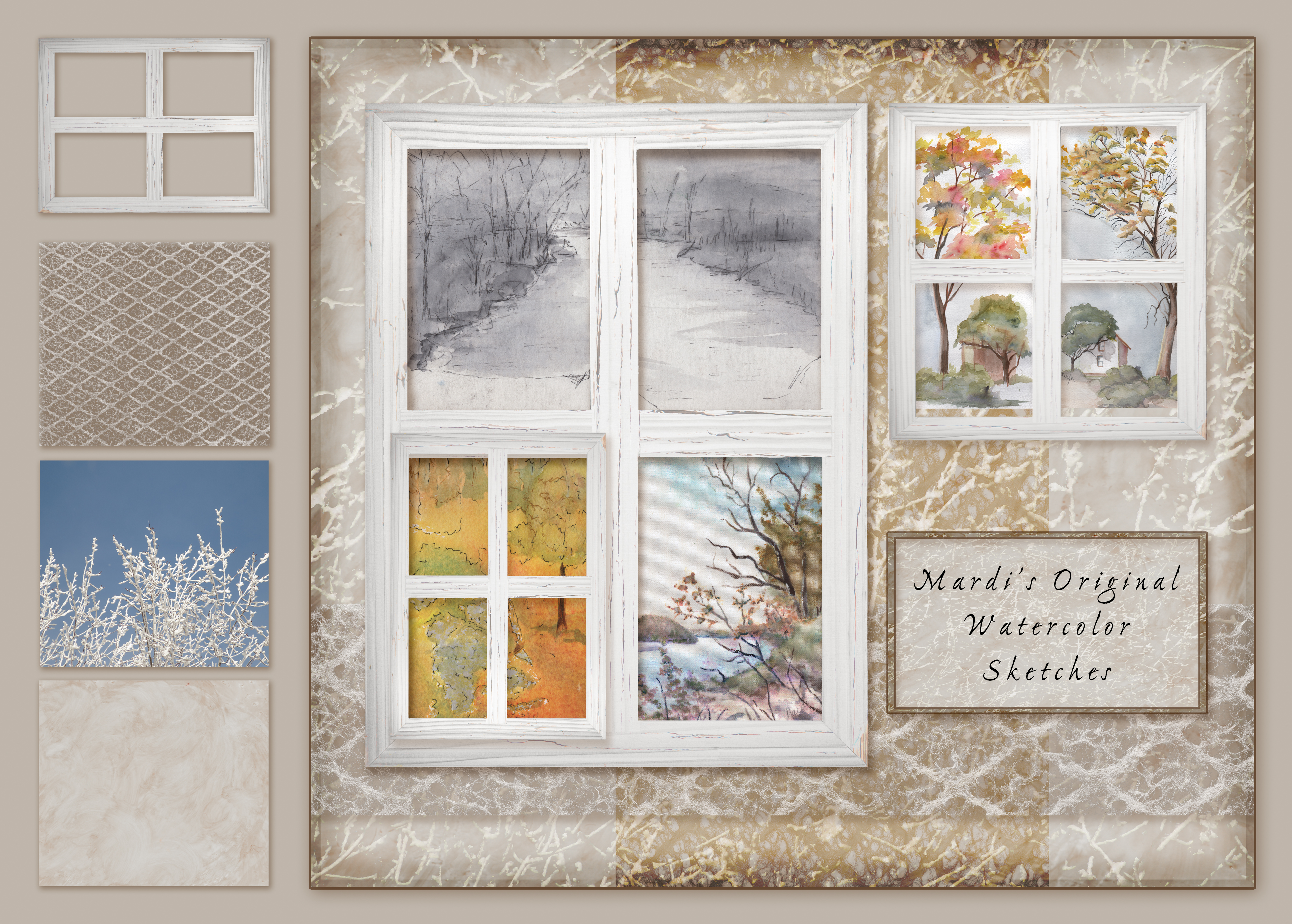 Old window frames are a natural way to display art. Great for scrapbook layouts!