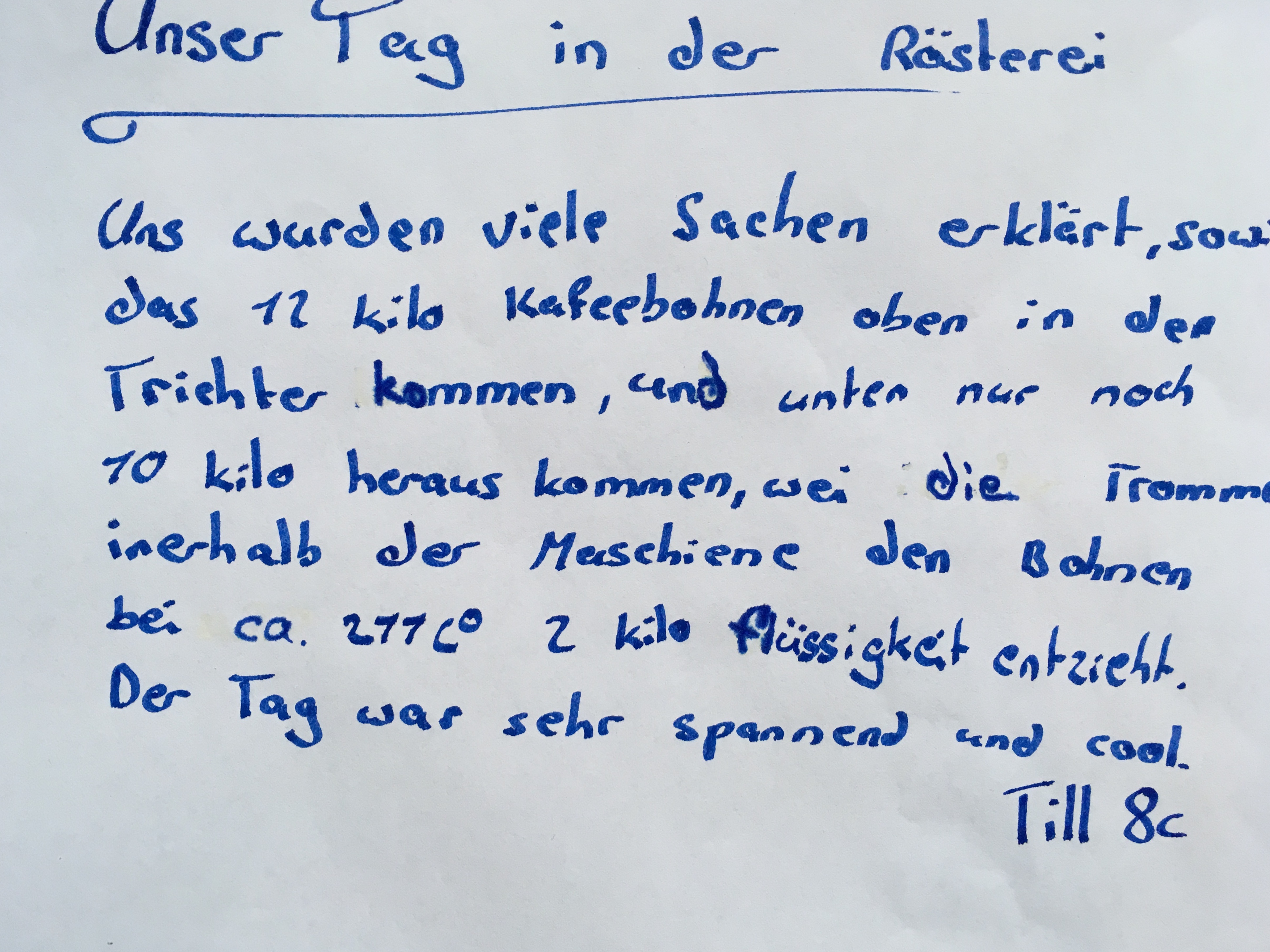We got together and thought of ways to support this school. Since Costa Rica is known for its coffee as much as for its nature it was obvious that we would combine coffee, school and students. This is how our project for interested students years 8- 10 in cooperation with Mr Oliver Kraus from „Pottschwarz“, a café and roast house in Mülheim, Saarn was created. In our „Costa Rica Coffee Project“ these students learn about export, quality, processing and selling of coffee. Meanwhile our students are in contact with the students from Quepos.