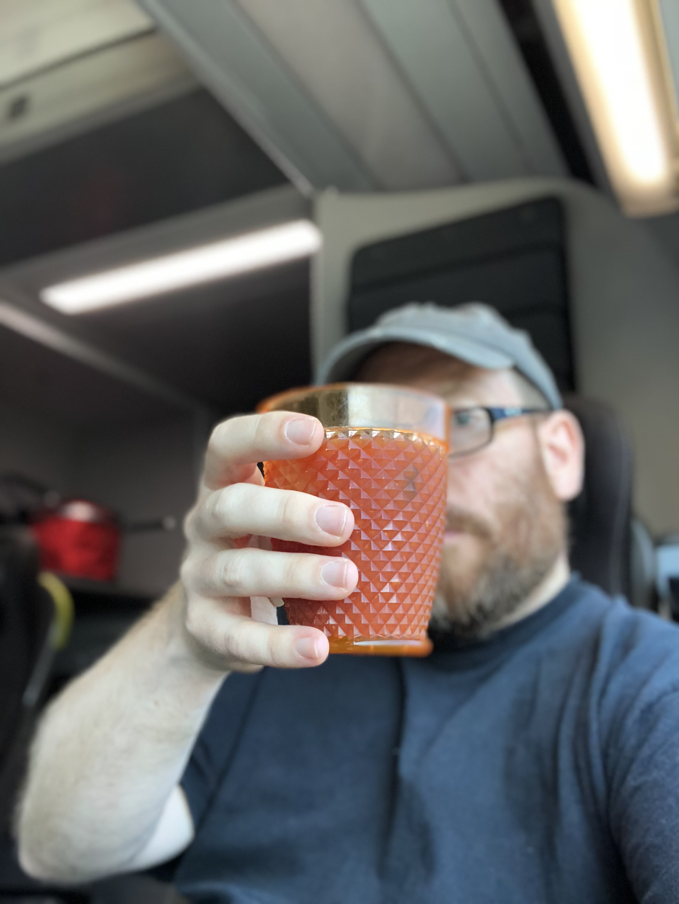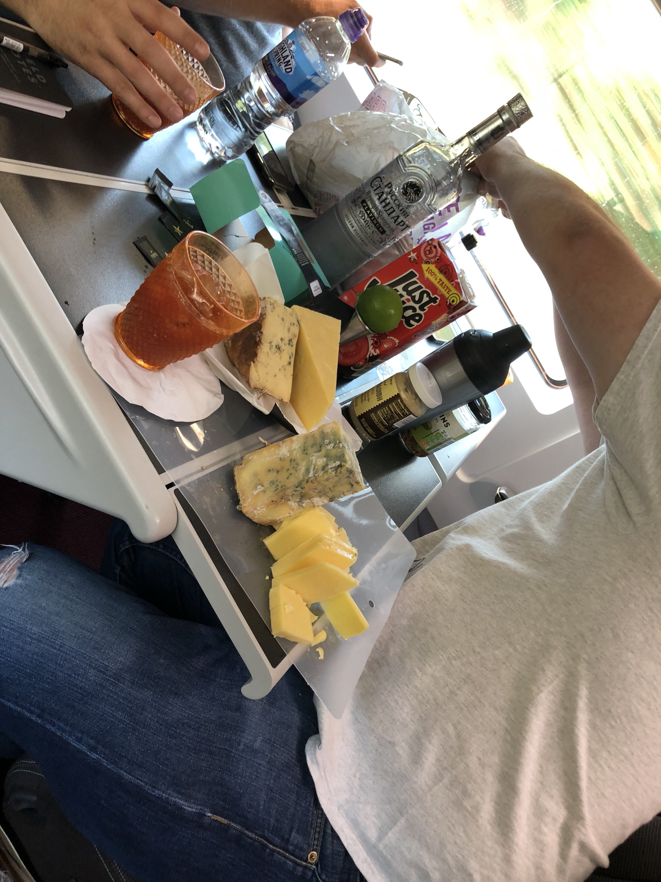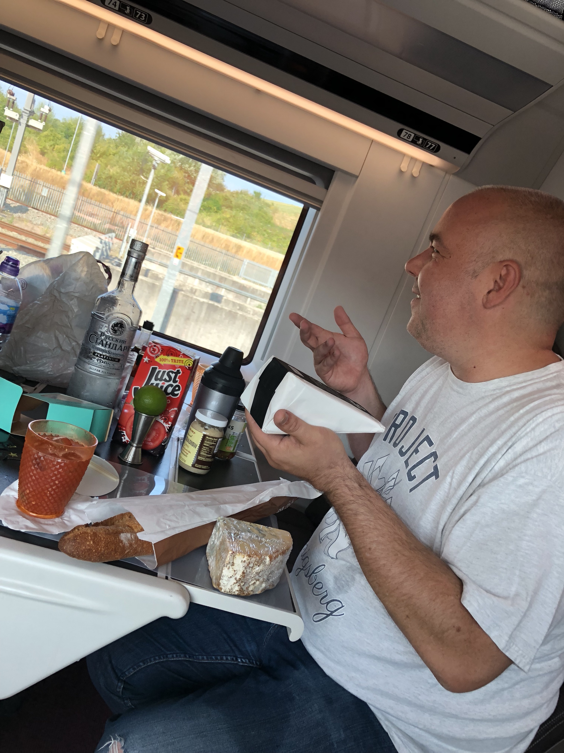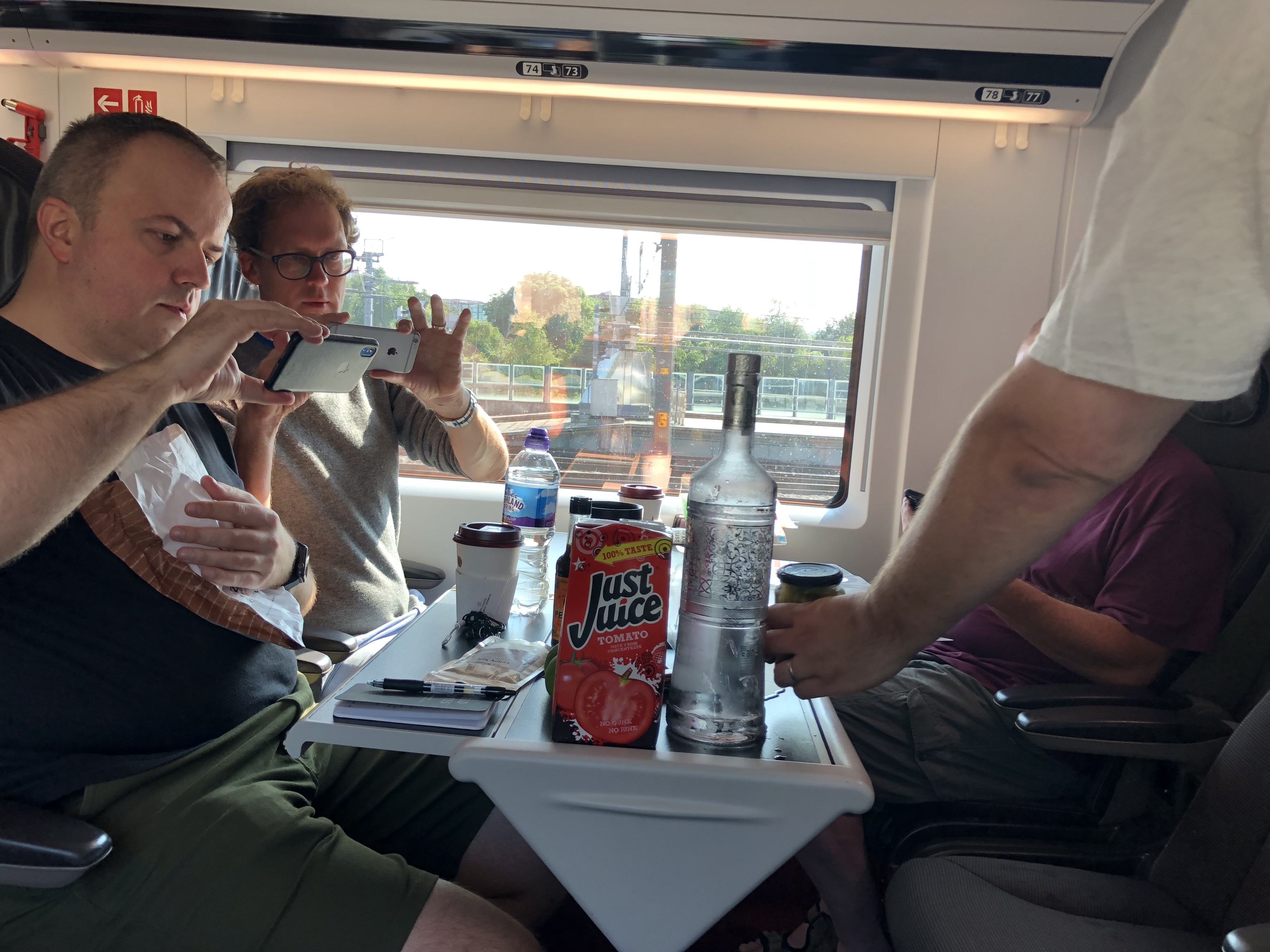 Back to the main concourse and the tannoy is requesting that literally everyone on the 0922 should go to the information desk becuase they've changed trains and thus everyone's seats. This does not make things less of a zoo. Eventually the 0858 platform is announced and seemingly two thousand people surge to ride 4 slow travelators up. We hang back for a bit rather than join. Eventually we're up and in coach 14, Standard Premier don't you know. And, good lord, this is actually really quite fancy. Comfortable seats, plenty of space, storage, power (which we don't find for over an hour, mind; it's well hidden). Time for a bloody mary, surely?