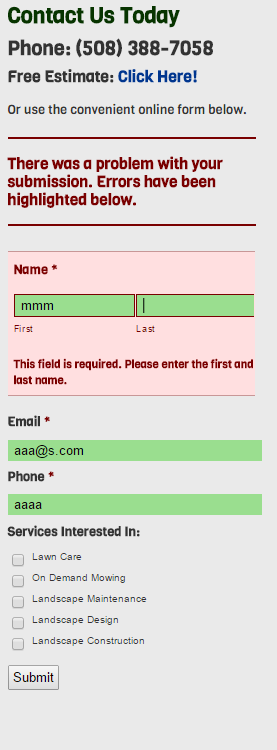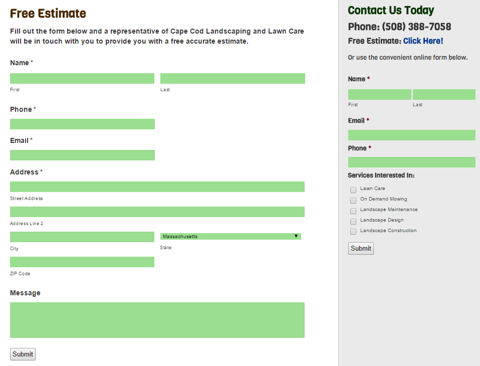 There are no focus states on the forms. Also there are two forms for the same thing that sit next to each other on the “free estimate page”. To fix this I would remove the short form on the page with the long form
