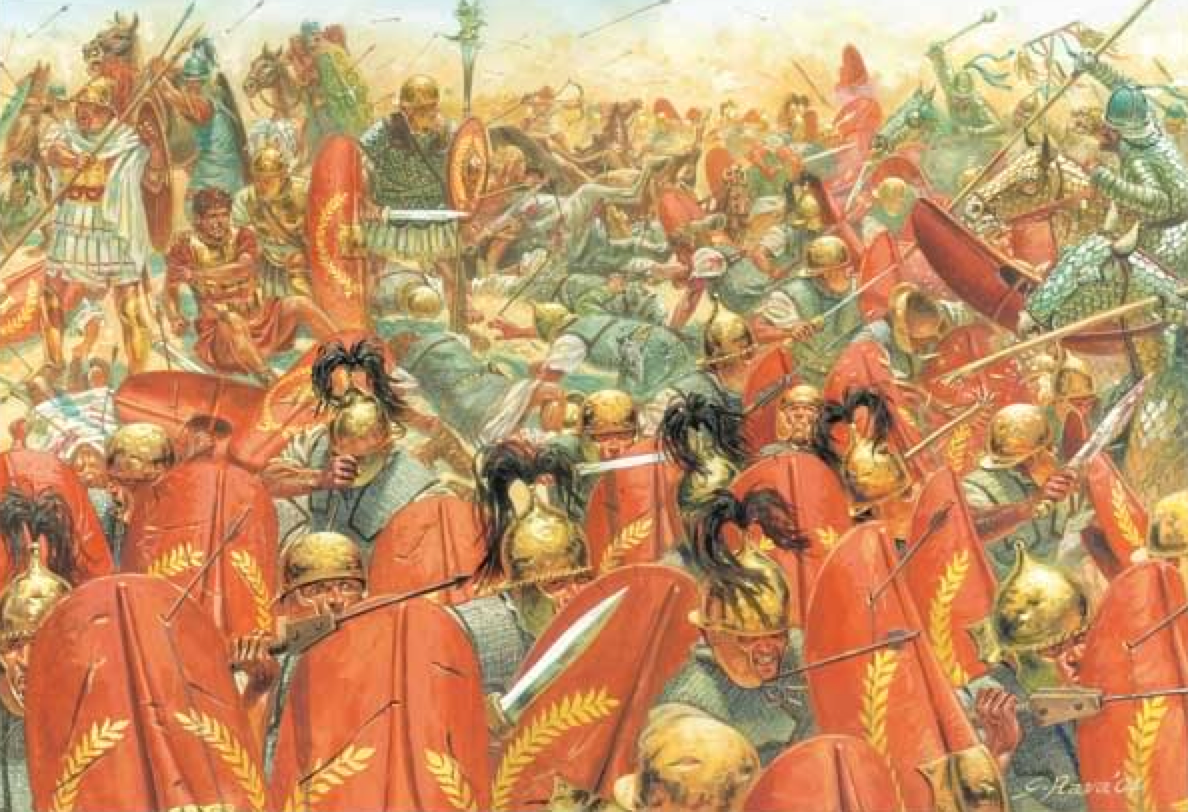"And at first they purposed to charge upon the Romans with their long spears, and throw their front ranks into confusion; but when they saw the depth of their formation, where shield was locked with shield, and the firmness and composure of the men, they drew back, and while seeming to break their ranks and disperse, they surrounded the hollow square in which their enemy stood before he was aware of the maneuver." Plut. Crass. 24.3