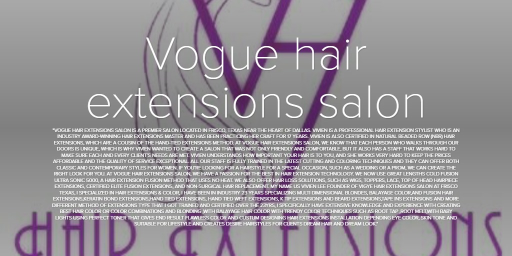 Vogue hair extensions salon"Vogue Hair Extensions Salon is a premier salon located in Frisco, Texas near the heart of Dallas. Vivien is a professional Hair Extension stylist who is an industry award-winning Hair Extensions Master and has been practicing her craft for 17 years. Vivien is also certified in Natural Beaded Row (NBR) hair extensions, which are a cousin of the hand-tied extensions method. At Vogue Hair Extensions Salon, we know that each person who walks through our doors is unique, which is why Vivien wanted to create a salon that was not only friendly and comfortable, but it also has a staff that works hard to make sure each and every client’s needs are met. Vivien understands how important your hair is to you, and she works very hard to keep the prices affordable and the quality of service exceptional. All our staff is fully trained in the latest cutting and coloring techniques and they can offer both classic and contemporary styles for women. If you’re looking for a hairstyle for a special occasion, such as a wedding or a prom, we can create the right look for you. At Vogue Hair Extensions Salon, we have a passion for the best in hair extension technology. We now use Great Lengths Cold Fusion Ultra Sonic 5000, a hair extension fusion method that uses no heat. We also offer hair loss solutions, such as wigs, toppers, lace, top of head hairpiece extensions, Certified Elite Fusion Extensions, and non-surgical hair replacement. My name us Vivien Lee founder of Vigye hair extensions salon at frisco Texas, I specialized in hair extensions & Color, I have been in industry 23 years specializing multi dimensional blondes, balayage color,and Fusion hair extensions,keratin bond extensions,hand tied extensions, hand tied weft extensions, k tip extensions and beard extensions,tape ins extensions and more different method of extensions type that I got trained and certified over the 23yrs, I specifically have extensive knowledge and experience with creating best hair color or color combinations and blonding ,with balayage hair color with trendy color techniques such as root tap ,root melt,with baby lights using perfect toner that gives end result flawless color and Custum designing hair extensions installation depending eye color, skin tone and suitable for lifestyle and creates desire hairstyles for clients dream hair and dream look."