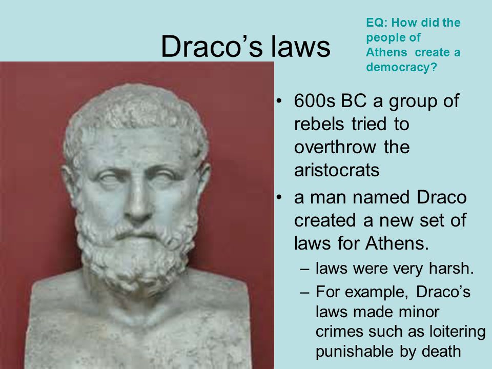 Draco gives Athenians harsh laws, but he also gives them written law. In the future, the laws are softened. Through the future, Athenians will always demand written laws.