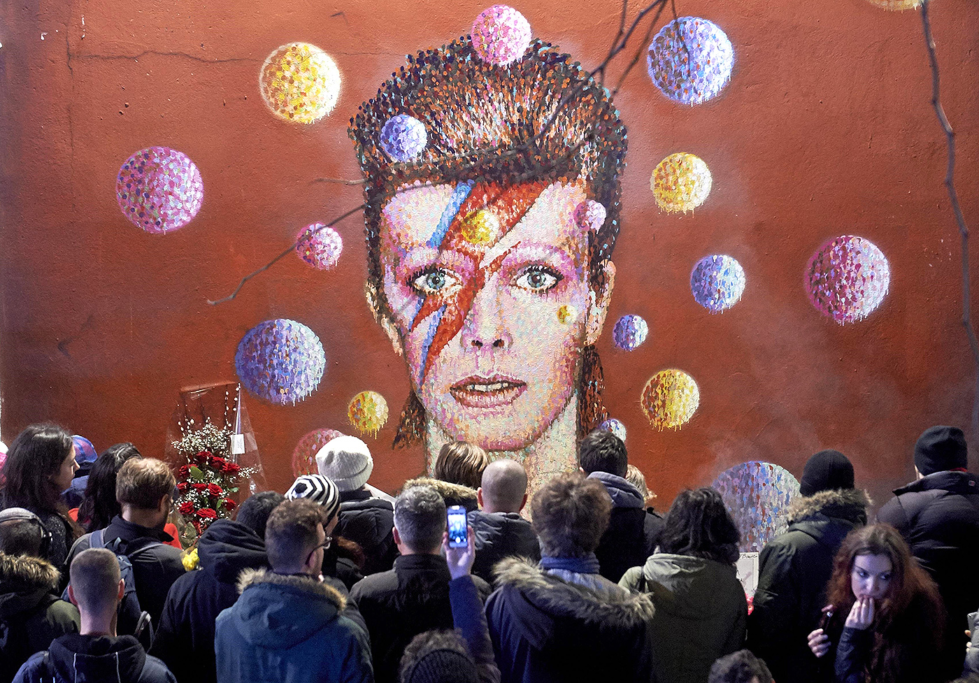 Multidões se reúnem para depositar flores sob um mural do cantor David Bowie, pintado pelo artista australiano James Cochran, também conhecido como Jimmy C, em Brixton, após o anúncio de sua morte, no dia 11. Bowie morreu de câncer aos 69 anos, desencadeando milhares de tributos ao redor do mundo para aquele que revolucionou a música com sucessos como "Ziggy Stardust" e seu estilo camaleão-teatral de criar personagens. Foto: Niklas Halle'n/ AFP