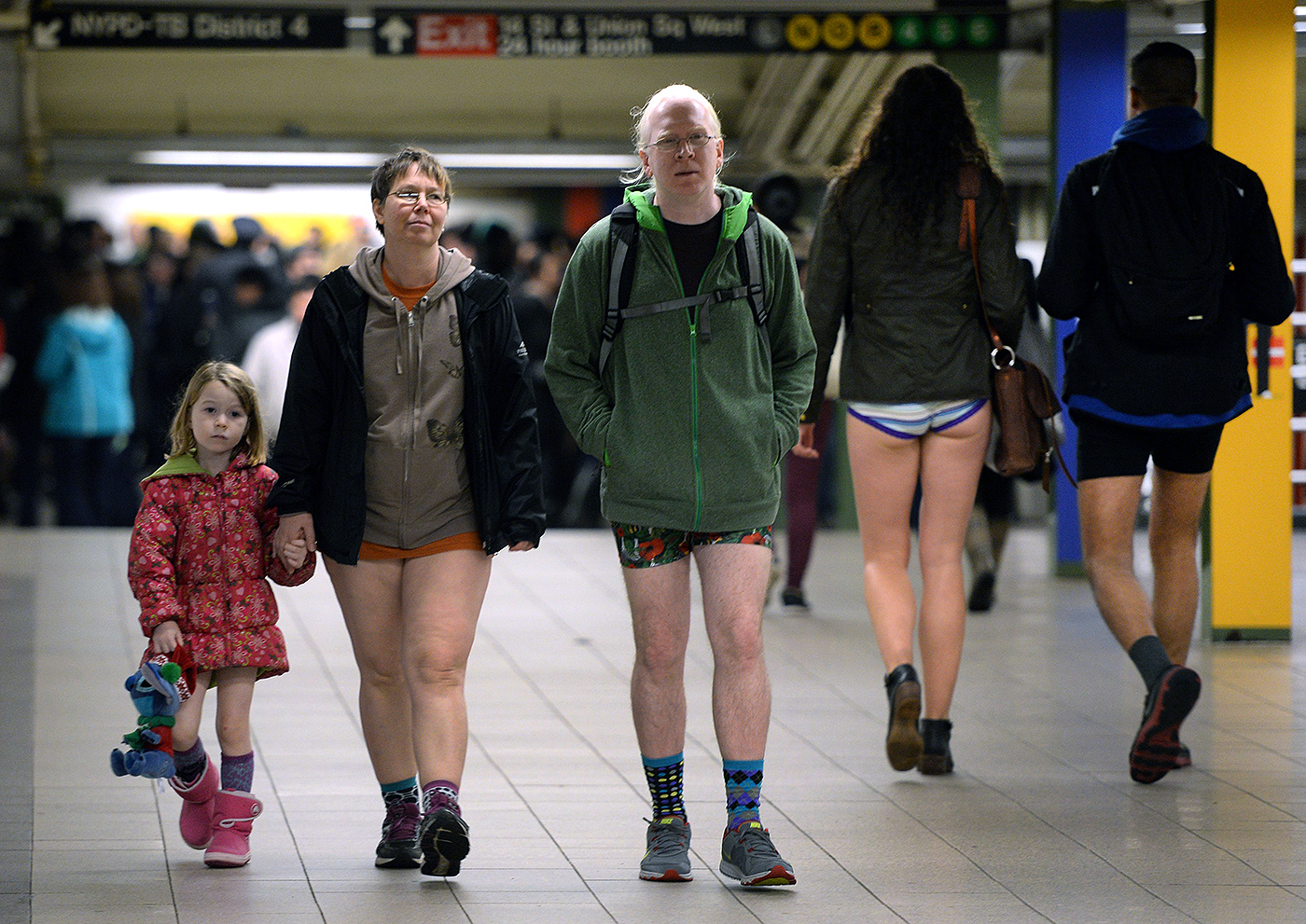 Participantes do "No Pants Subway Ride" caminham por uma estação de metrô de Nova York no dia 10 janeiro. O "No Pants Subway Ride" é um evento anual que começou em 2002. Quem adere ao movimento, que acontece no inverno, pode usar casacos, cachecóis e luvas, mas deve manter as pernas de fora e fazer uma cara séria. Várias capitais ao redor do mundo já encamparam a ideia. Em Moscou, ativistas da campanha foram interrogados pela polícia. Foto: Timothy A. Clary/ AFP