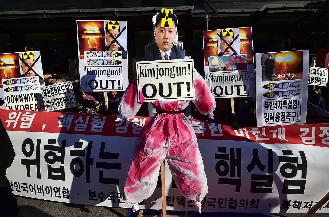 Um boneco do líder norte-coreano Kim Jong-Un durante um comício em Seul no dia 7 de janeiro denunciando o teste de bomba de hidrogênio anunciado pela Coreia do Norte. Os Estados Unidos e a Coreia do Sul prometeram impor sanções abrangentes ao país após o seu quarto teste nuclear globalmente condenado. Foto: Jung Yeon-Je/ AFP