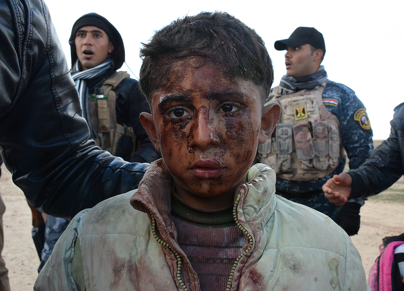 Um menino iraquiano ferido, que fugia da fome e da tirania jihadista na cidade iraquiana de Hawijah, recebe a ajuda de forças de segurança iraquianas na área de Al-Fatha , no norte da província de Salaheddin, no dia 9 de janeiro. Centenas de famílias estão fugindo de Hawijah, a cerca de 220 quilômetros ao norte de Bagdá e uma das trincheiras do Estado Islâmico. Foto: Stringer/AFP