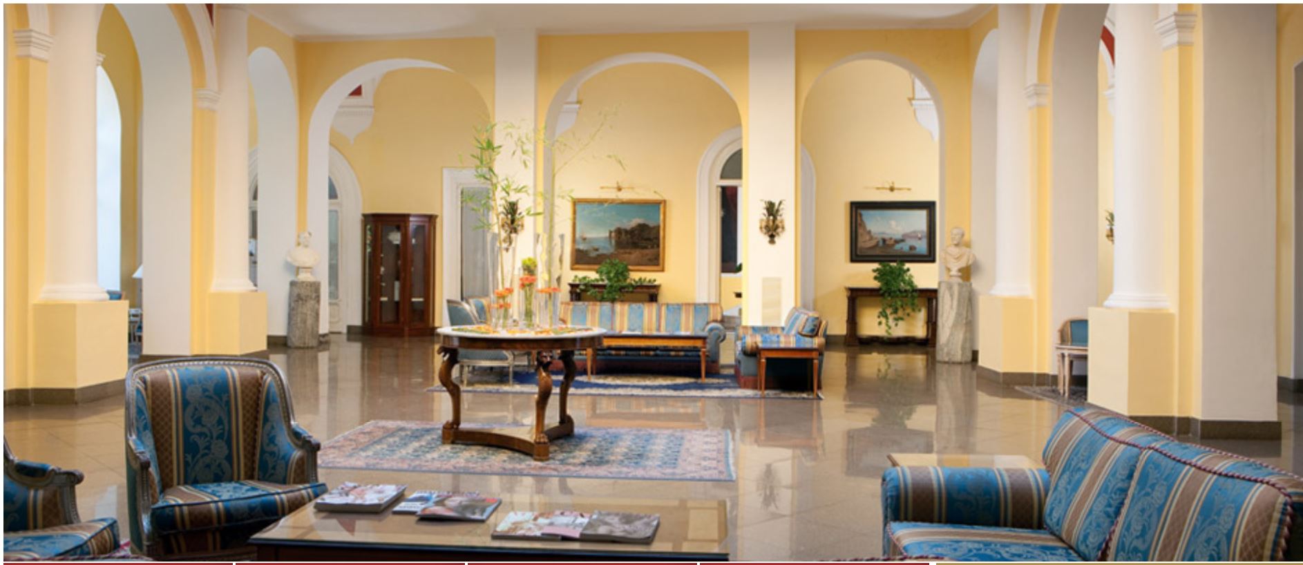 The vast, elegant halls and lounges, sparkling with reflections from the sea, are decorated with frescoes, majolica, soft oriental carpets, period statues, old masters and priceless Sorrentine inlaid furniture. They mirror the finery, meticulous style and eye for detail that are the distinguishing marks of the entire hotel.