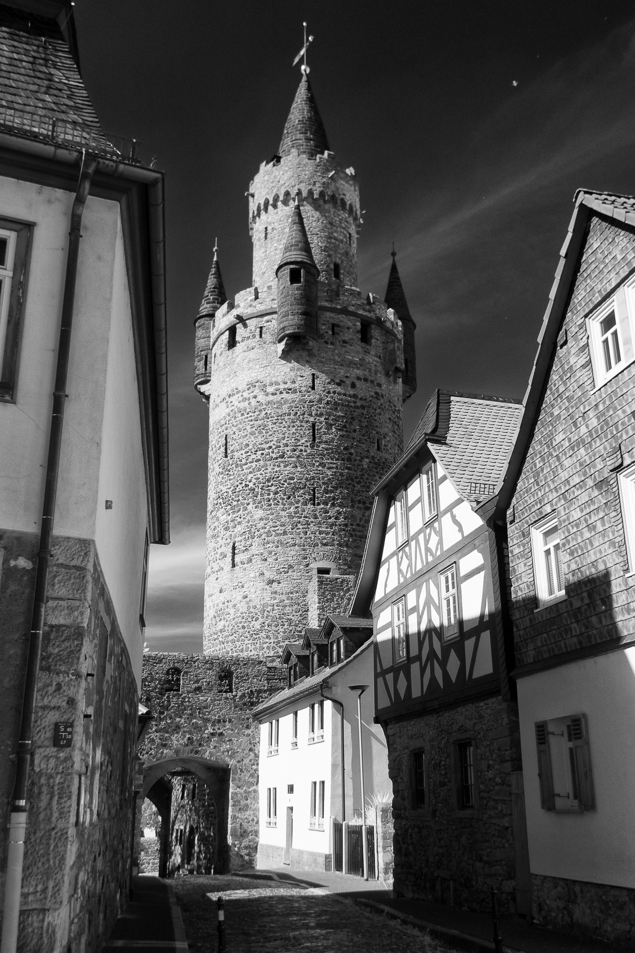Das südliche, zur Kaiserstraße weisende Tor mit vorgelagertem Graben und ehemaligem Falltor. Über Jahrhunderte waren sich Burg Friedberg und Stadt Friedberg nicht grün.