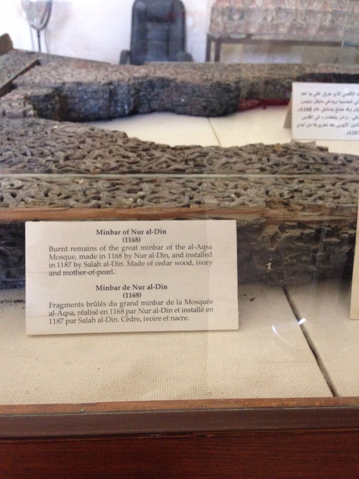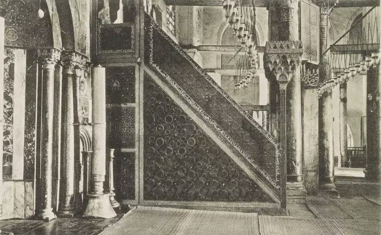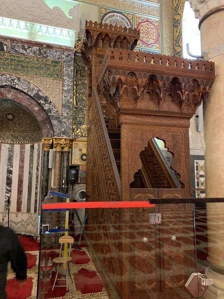 The original Minbar was constructed in 1168 by Nooruddeen Zinky (RA) from cedar wood, Ivory and mother of pearl 20 years before the liberation of Masjid Al Aqsa.