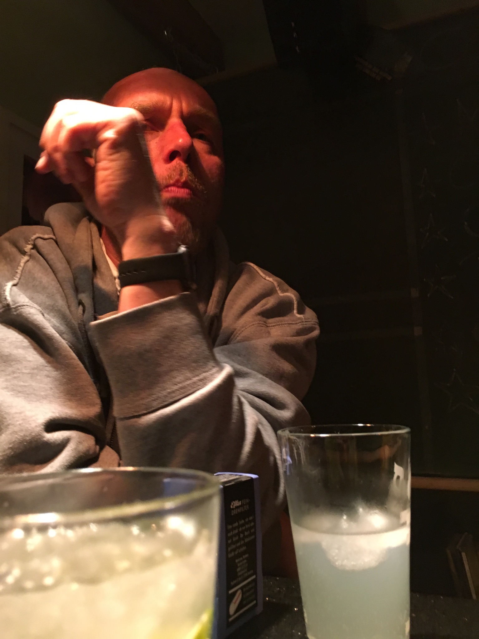 Some hours later, after a nap and with a full belly, I receive a text from Olaf to meet him in Neu Tramm. I get bundled up (it was quite cold today) and drive to the venue. Olaf is already there and we move up to Raum 2 where the band will be playing. We are early so we grab a drink and find a good location. The band is "Guts Pie Earshot" - a duo of an electric cello and drums.