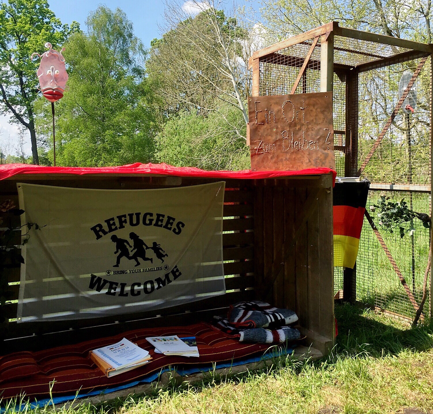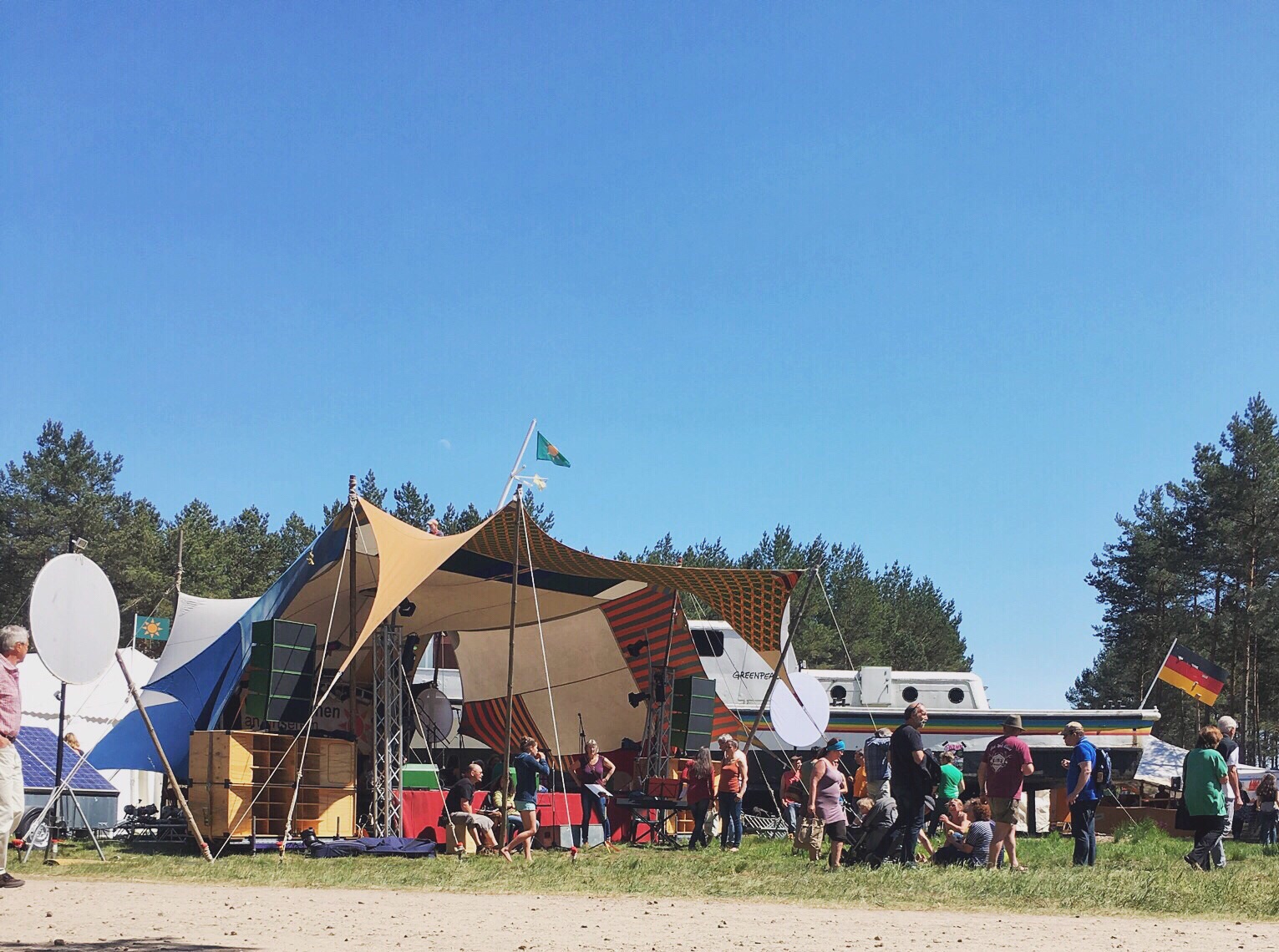 From my spot, I see Karin and Johannes walk by me - I message Olaf and he says to meet them by the red tent. Okay. I leave my shady spot to find the red tent in front of the Green Peace boat. It wasn't really that difficult....the boat is a big landmark. I find Olaf and we meet up with Karin and Johannes to finish wandering the spectacle that is Gorleben.