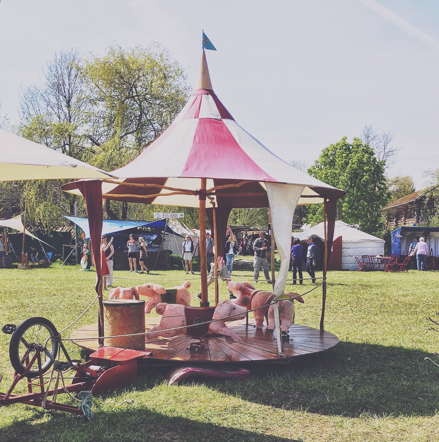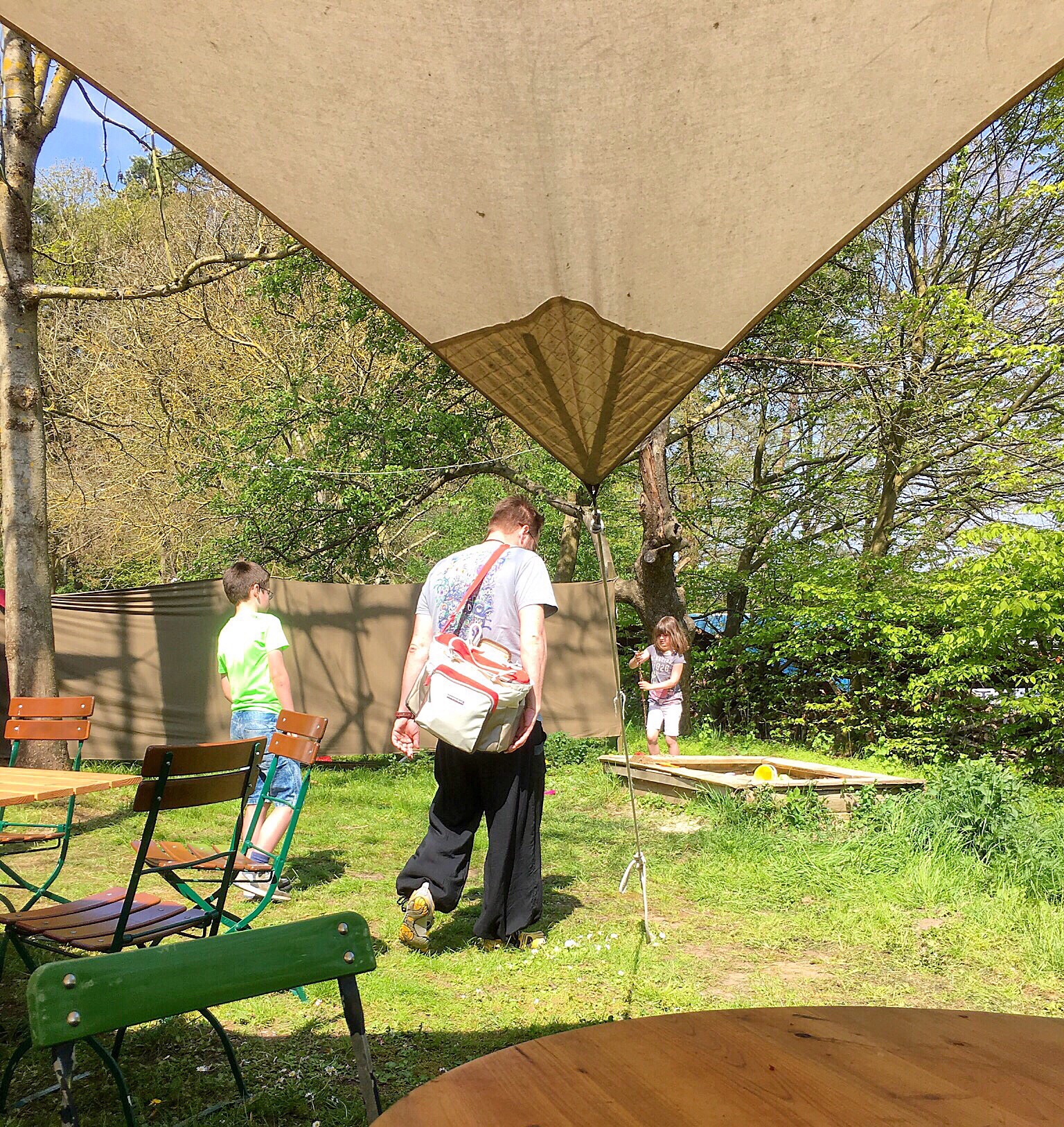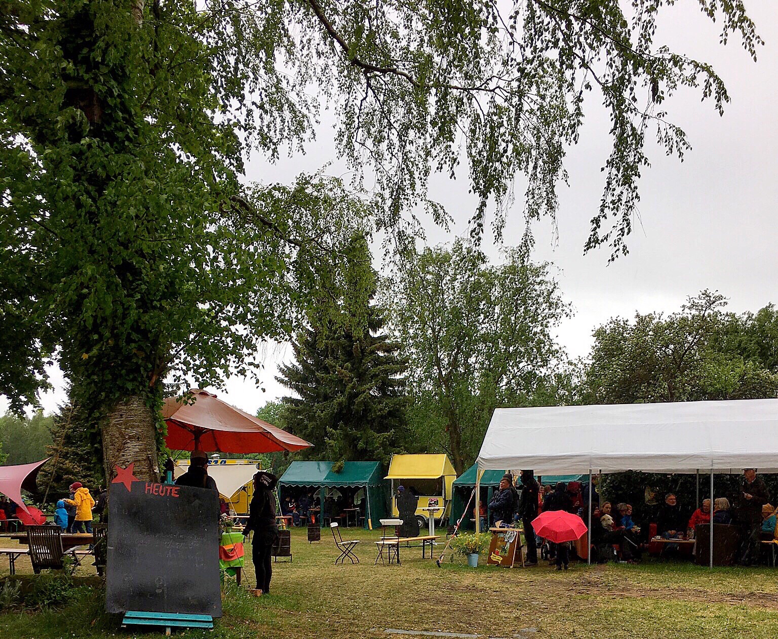 Johannes is eyeing the tent with some toys scattered about...and Olaf suggests a coffee. I readily accept because my aborted mission earlier has left me bereft of caffeine. Dagmar says she will visit the toilet and meet us at the coffee tent. Olaf asks Johannes if he would like to join us or play on his own. Then he receives instructions about how to find us if he needs to. We walk to the coffee bar (there is no line now) and look for a table that has a view of where Johannes is playing.