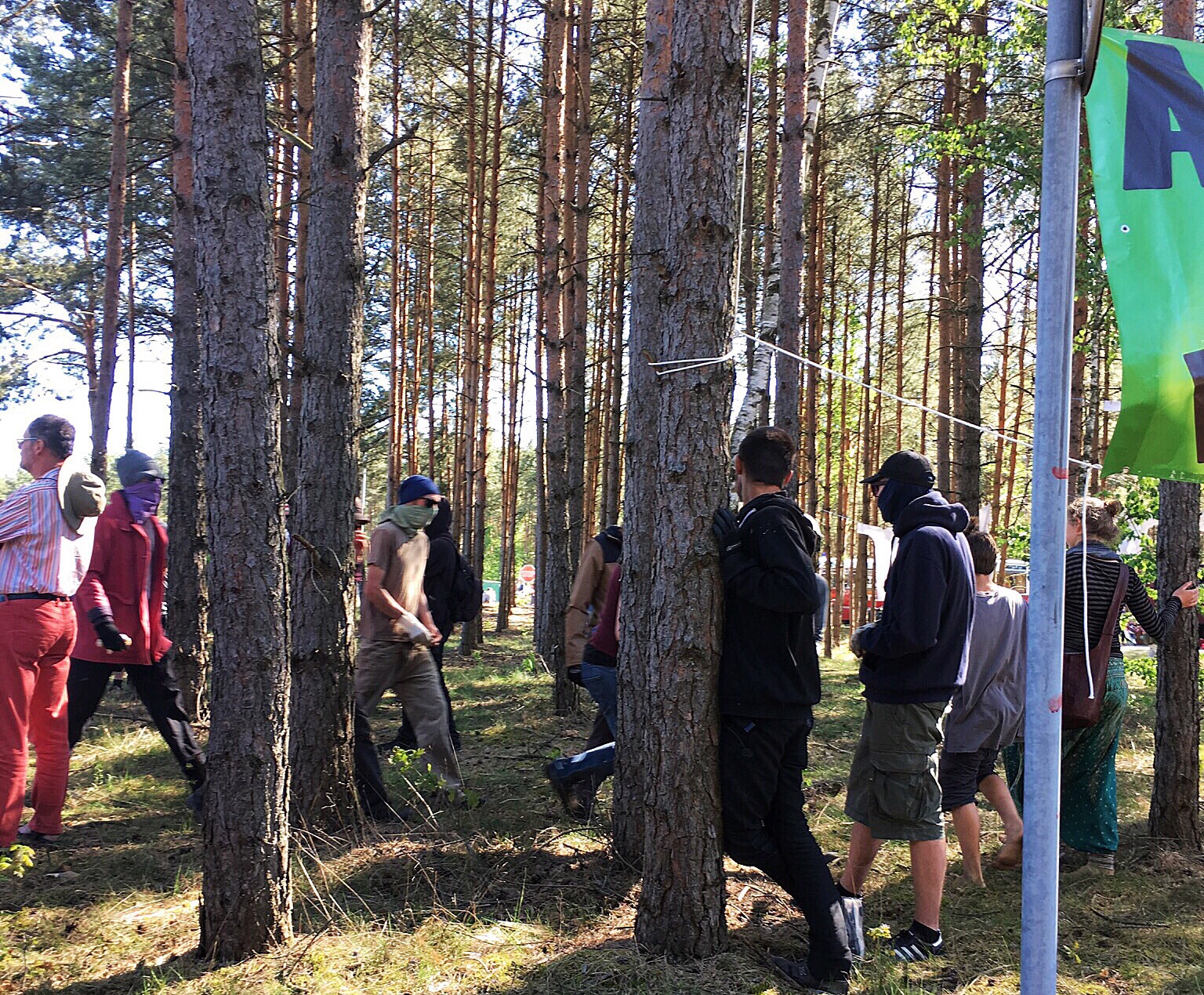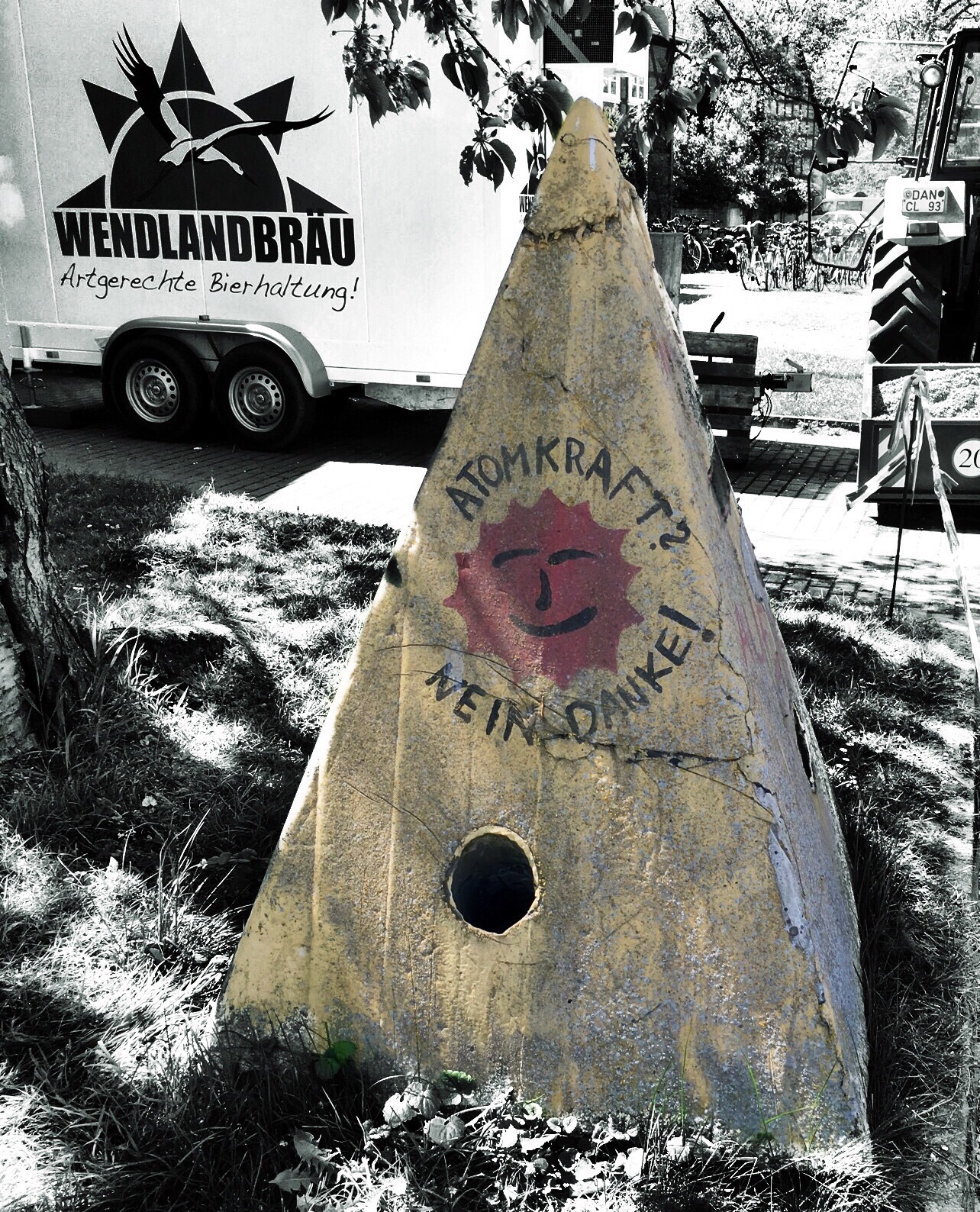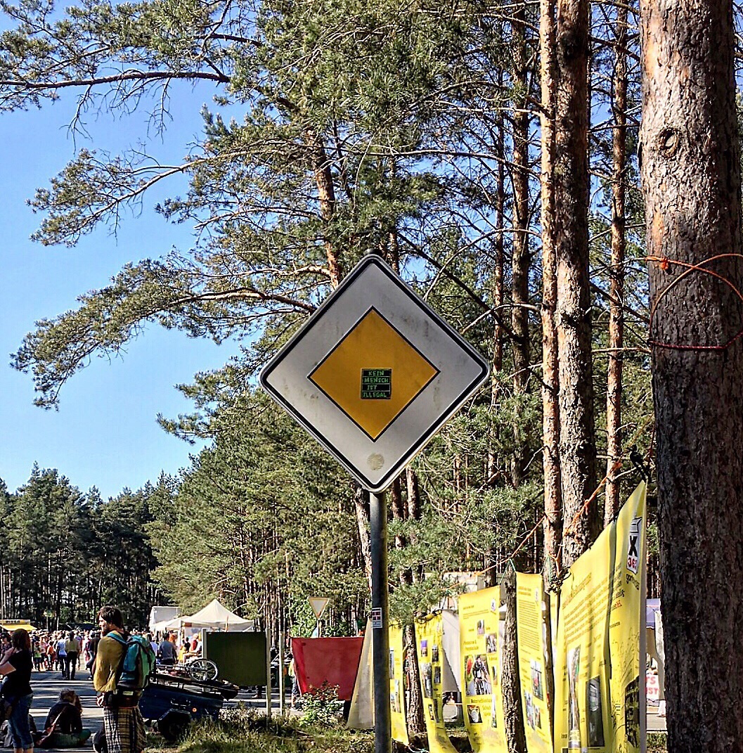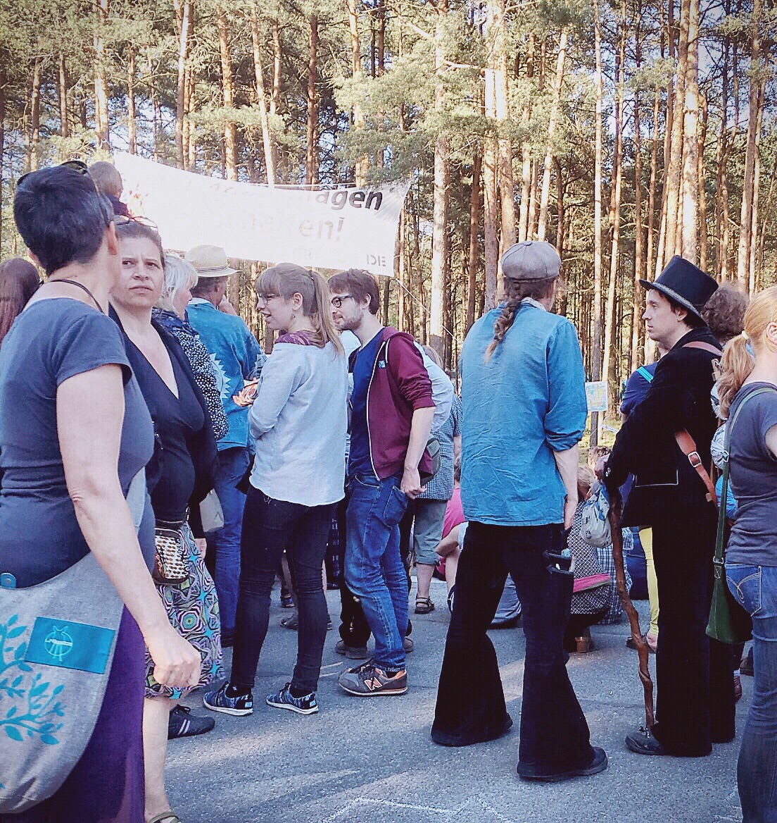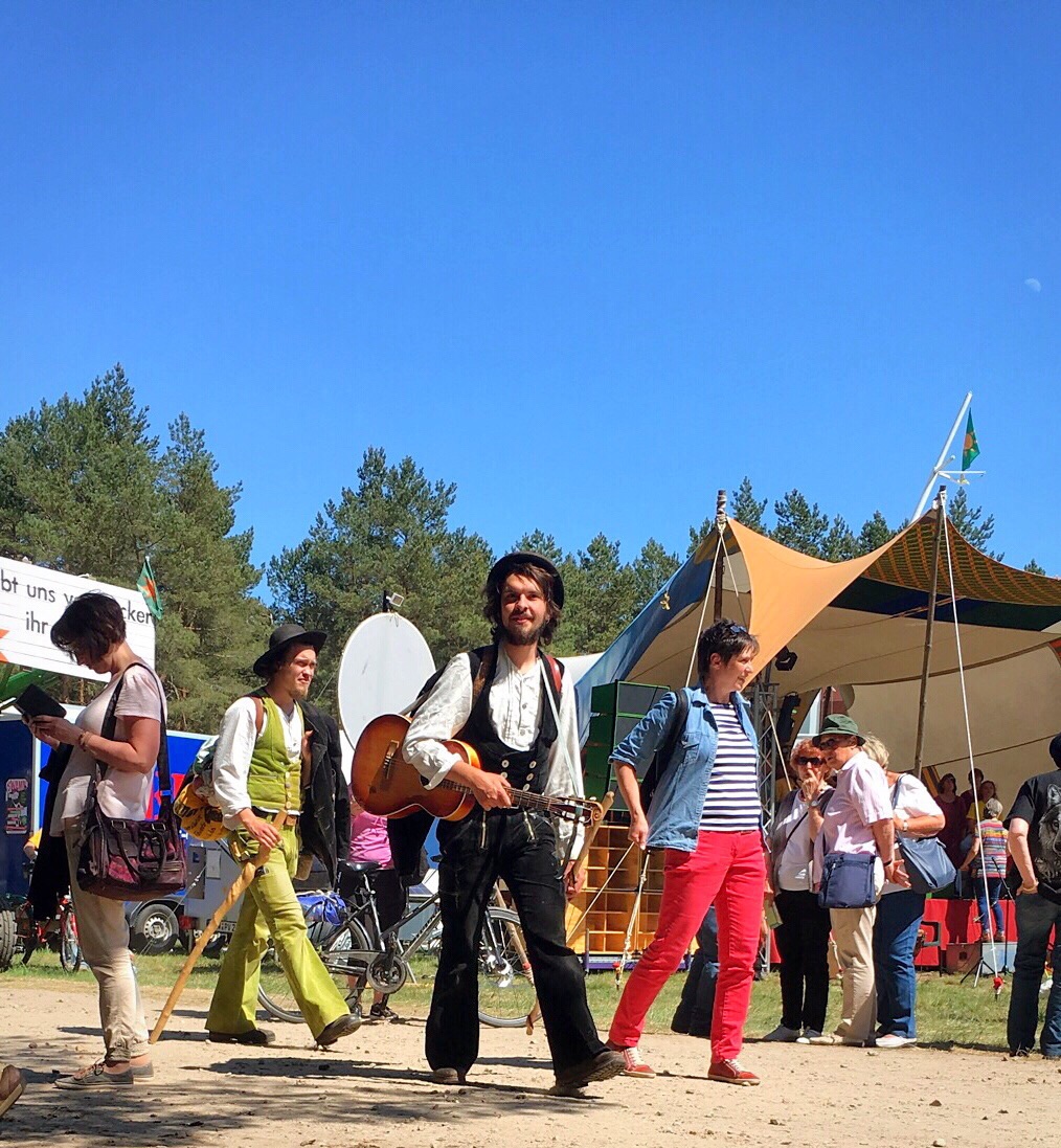Olaf says he would like to meet me in Lüchow for lunch (he has a few errands to do before the afternoon in Gorleben). We have lunch at the restaurant across the street...along with food, I found the wifi. I need to stop here and tell you that Olaf's father has wifi. But, it likes to play hide and seek with me...and it is very good at hiding. I am told today that the cafe across the street will have a stronger signal from the router because of the router's location. Figures. At 12:30, Olaf says he needs to leave and suggests that I leave shortly to Gorleben to ensure a decent parking space. We part and I tell him I will see him in a few hours. I return to the flat, change shirts, add yet more sunscreen to any exposed body part, and head out. Once I get to Gorleben, I start the parking dance. I don't park at the end but, instead, drive a little farther until I find a spot that I feel is reasonably close. I park and follow the people already walking to the festivities. I am wondering how far I will have to walk as I follow the line of people into the woods...oh! I am here! Well, that was quick...
