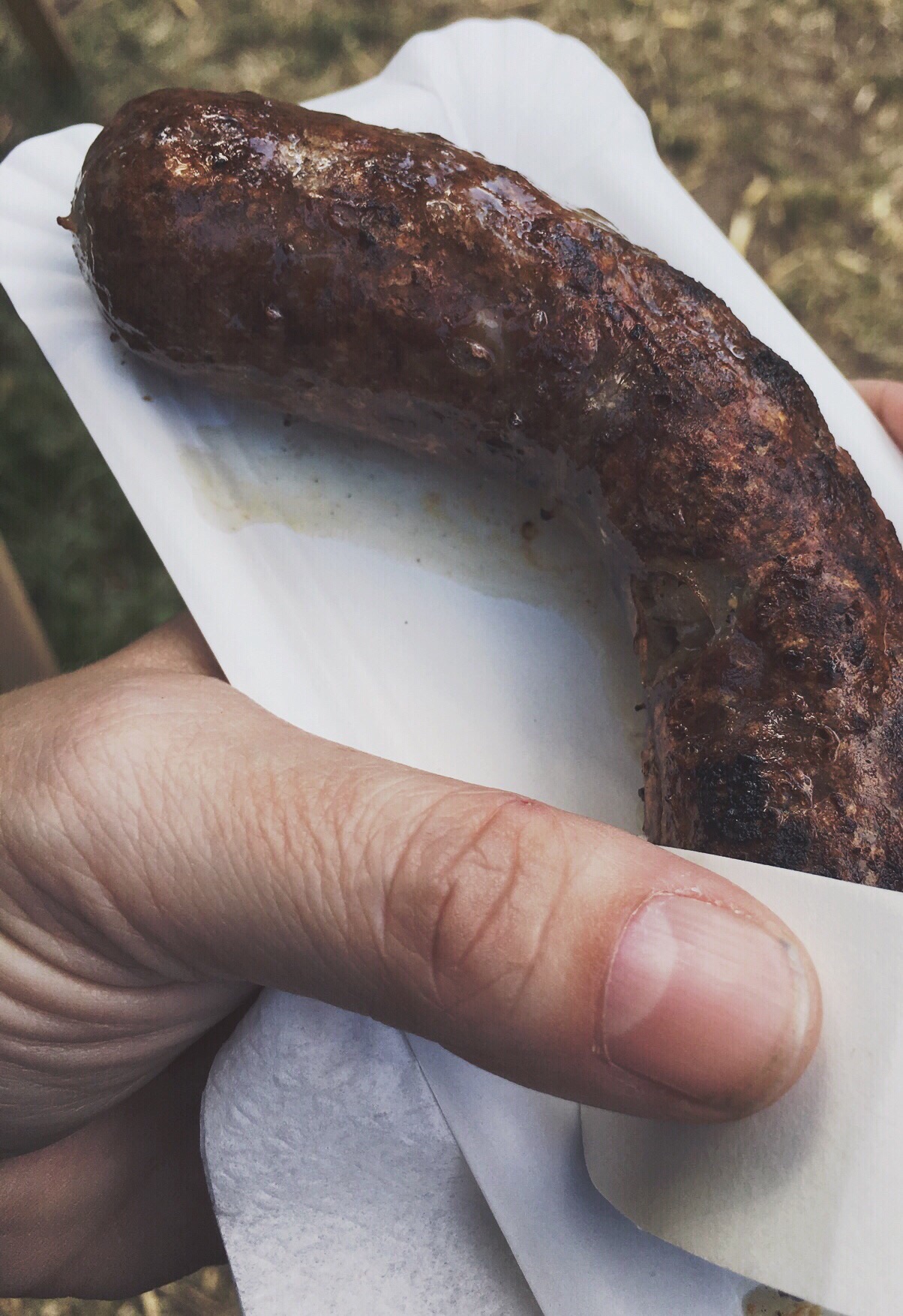 I make my way back to the Wild Wendland sausage vendor and I see that the sausages are finally ready. Good - I am hungry! I buy one and sit at a bench to do some people watching and soon I am finished eating my sausage.