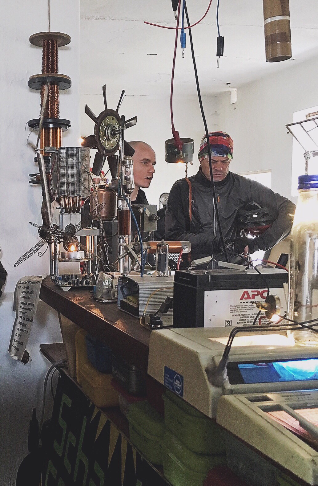 Oh, I see now. These are working pieces (lamps, fans, stuff) all made from found and discarded electronic parts like calculators and radios. Something like real working steampunk...but not as polished. I found it fascinating but difficult to get in to see for all men blocking the view.