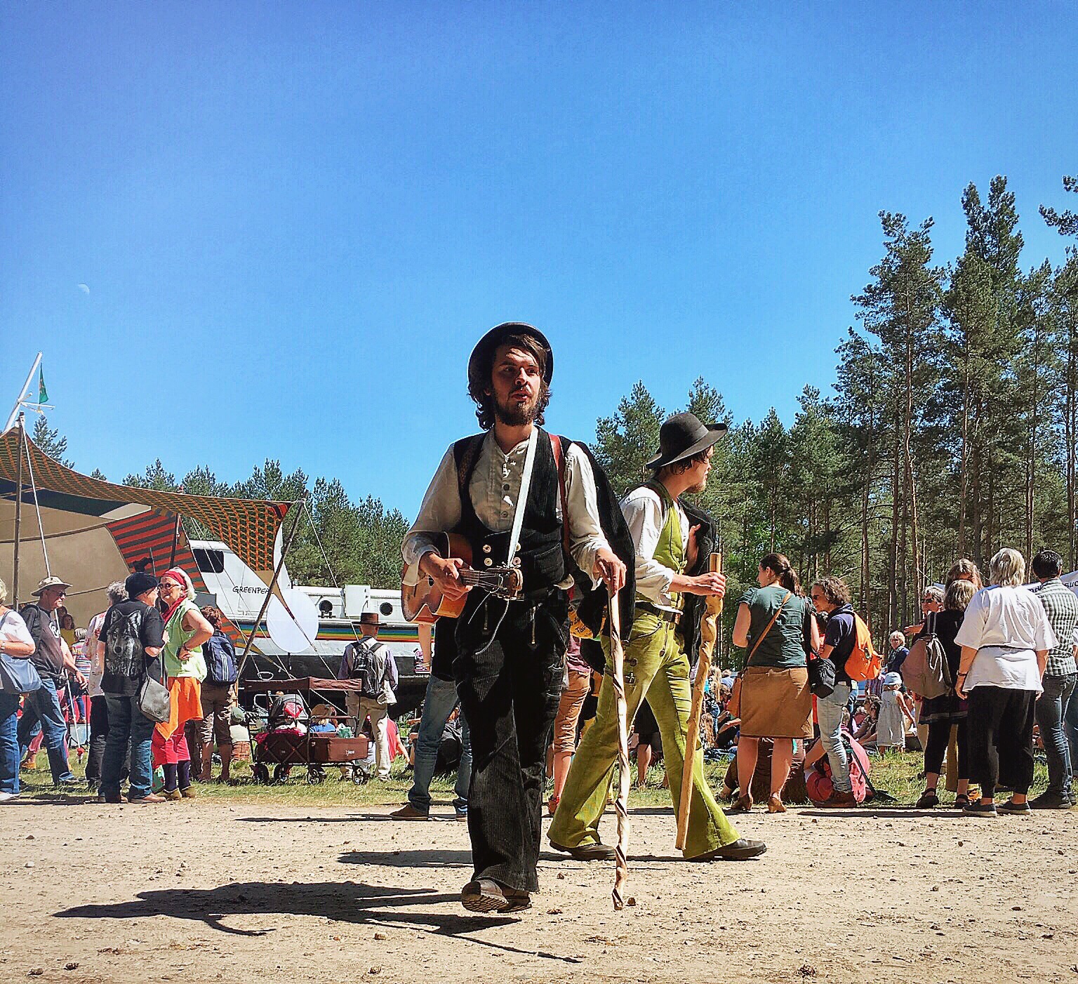 I walk into the cordoned off area - there are already many vendors setting up and bands getting ready to perform. Before we parted, Olaf said to meet them by the Green Peace boat so once I find that landmark I look for a good spot settle in. The sun is unrelenting so I am looking along the treeline in the shade for the perfect vantage point.