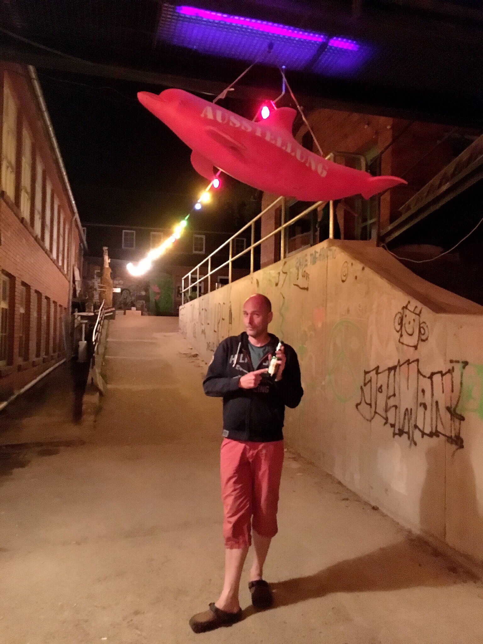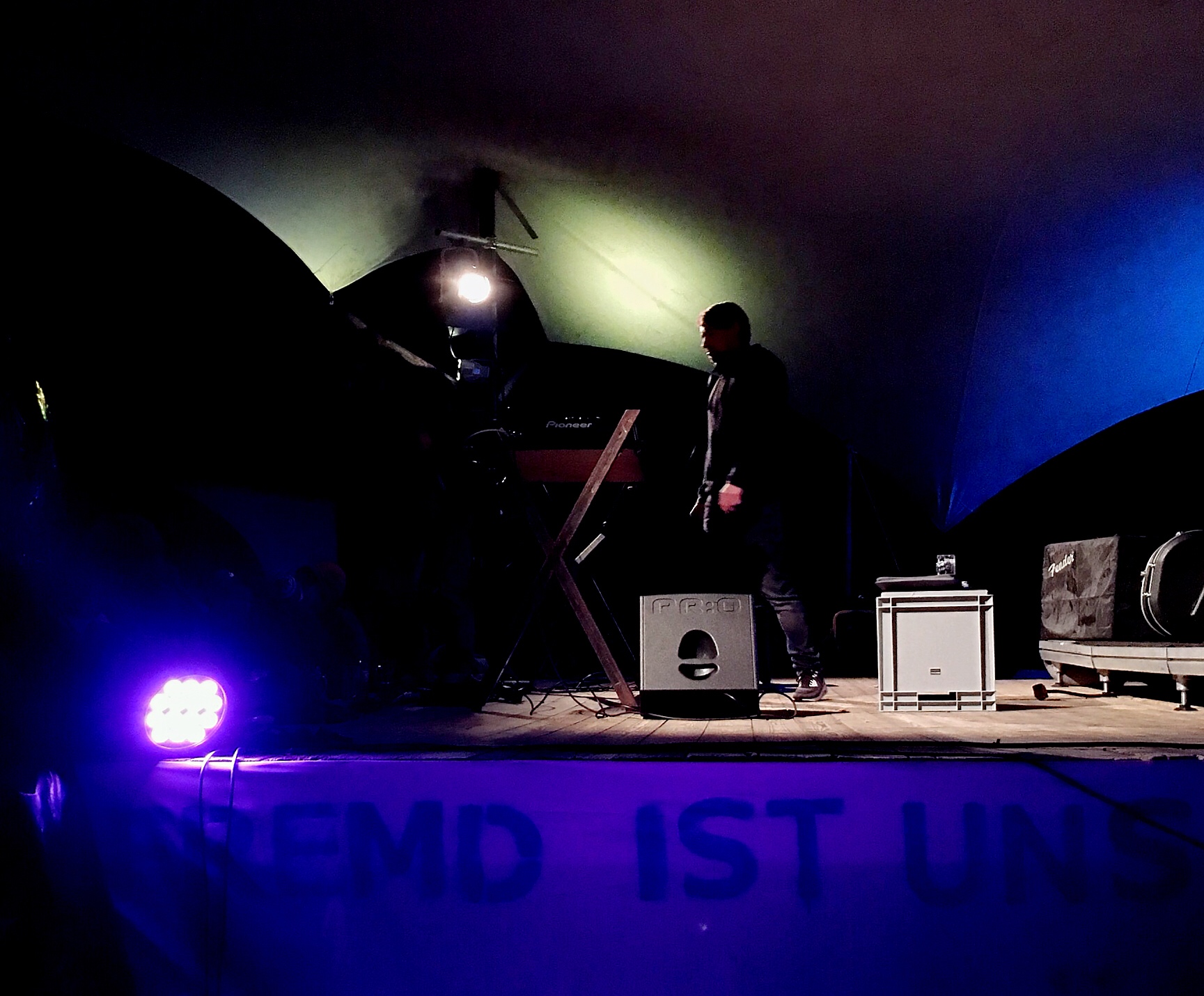 Later, my watch notifies me of an incoming message - it is Olaf asking "Mützingenta oder Neu Tramm?" A good question...but a quick consultation of the websites for each those locations shows Neu Tramm to be a better option. And it is closer for Olaf to get back home afterward. So, my last stop for the night is Neu Tramm where CJ Laufi is mixing it up old school. He is billed as Der einzige Cassetten Jockey der Republik - "The only cassette jockey of the Republic," playing punk, hip hop, country (there was no country), Detroit techno, and music with soul. The party has already started by the time we arrive.