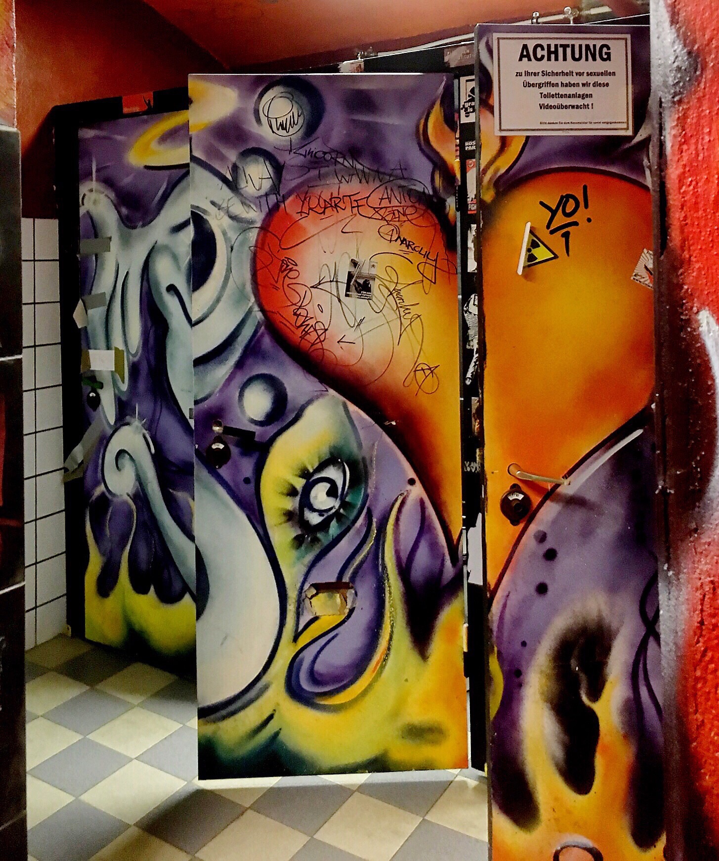 The music is a mix of 80's alternative, some Prince, some Bowie, some 60's soul, and some 70's funk. We watch the dancers while sipping on vodkalemons. At Lina's, on Tuesday, Olaf had been talking about the bathrooms at Raum 2 (where most of the concerts are held). I don't recall ever being in the bathrooms here...he says it is something I have to see. I am not quite sure what to expect...