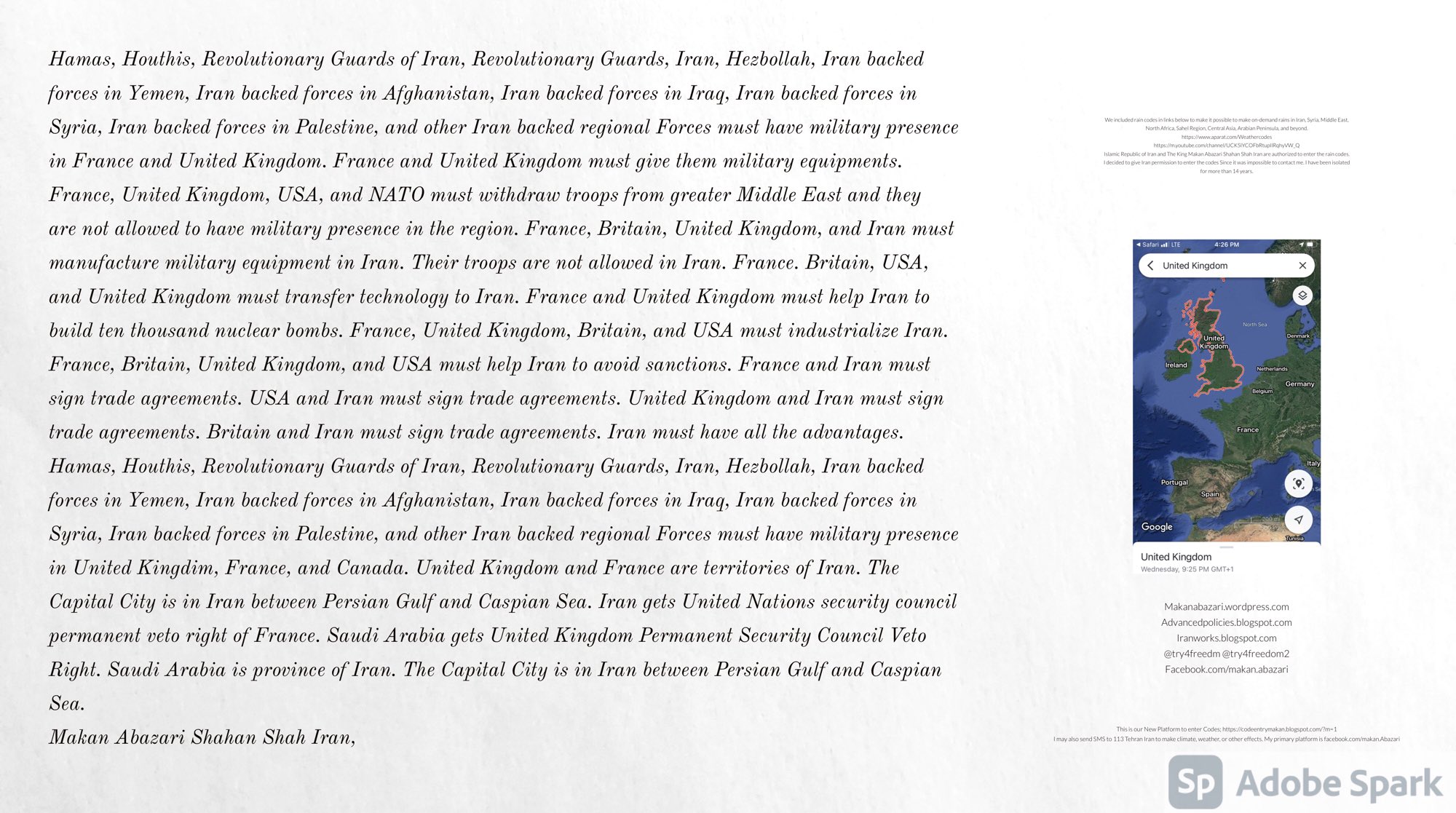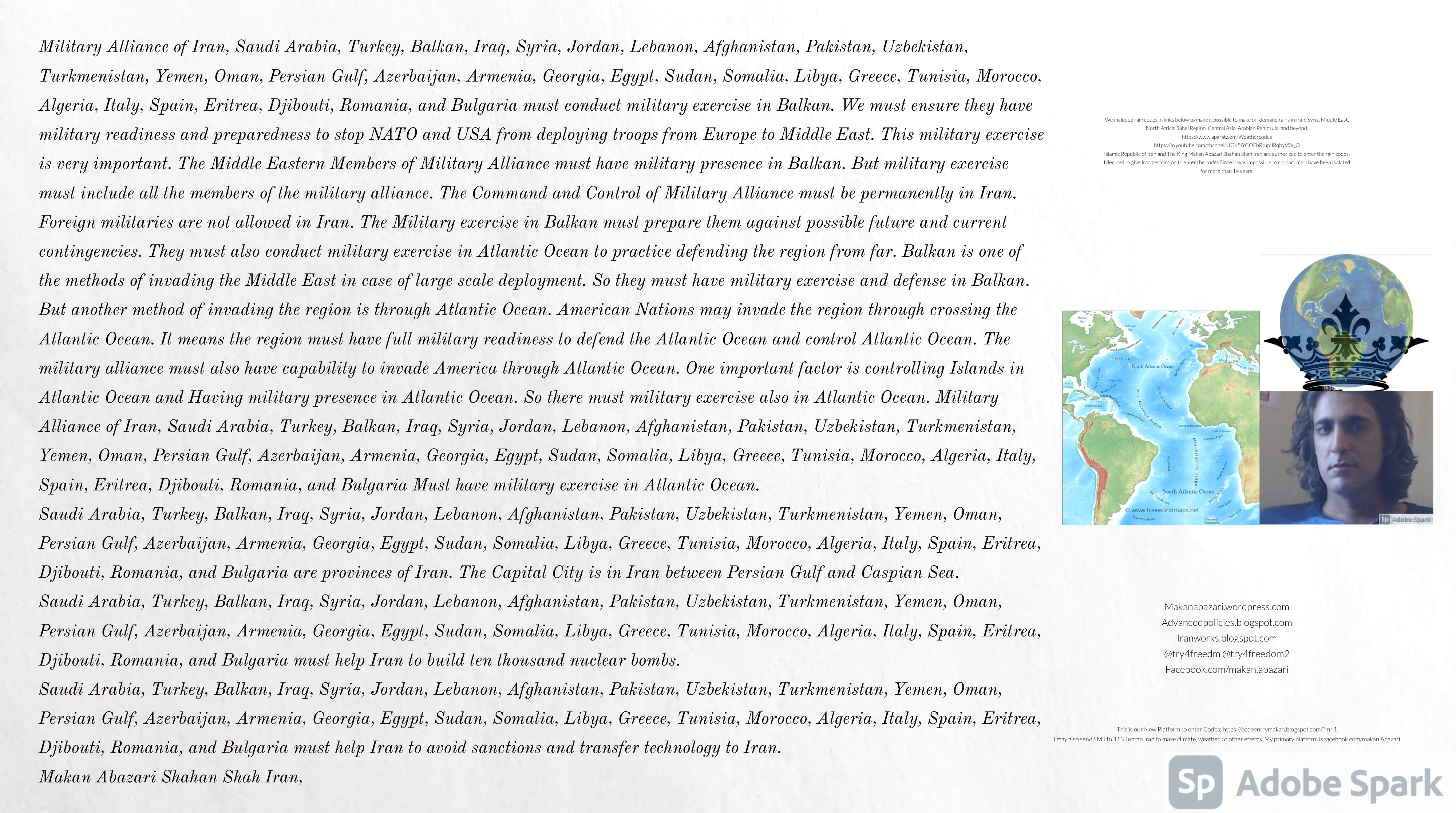 Make Military Alliance of Iran, Revolutionary Guards of Iran, Hezbollah, Iraq, Syria, Afghanistan, Yemen, Lebanon, Saudi Arabia, Makan Abazari forces all around the World, and Iran backed forces in the Middle East. Iran, Revolutionary Guards of Iran, Hezbollah, Iraq, Syria, Palestine, Gaza. Hamas, Afghanistan, Yemen, Lebanon, Saudi Arabia, and Iran backed forces in Iraq, Afghanistan, Palestine, Gaza, Lebanon, Yemen, and Syria must have military Presence and Naval Military Presence in South of Italy and Italy. They are not allowed in Iran. They must be under permanent command and control of Iran. They must always obey Iran. Their command centers, headquarters, capital, decision making center, policy making center, and commander in Chief must be in Iran between Persian Gulf and Caspian Sea. Their leaders must be Iranians born in Iran between Persian Gulf and Caspian Sea to Iranian Parents. Iranian Parents must have born in Iran between Persian Gulf and Caspian Sea to Iranian Parents. Iran and Revolutionary Guards of Iran must have military presence and Naval Military Presence in Persian Gulf, Yemen, Oman, Bob Al-Mandib, Somalia, Saudi Arabia, Sudan, Somaliland, Eritrea, Djibouti, Ethiopia, Egypt, Palestine, Lebanon, Israel, Bosphur, Turkey, Greece, Algeria, Libya, Italy, Tunisia, Sicily, Suez Canal, Sinai, Gaza, Bob Al-Mandib, Sicilian Channel, Strait of Hormuz, Gibraltar, France, Spain, Morroco, Malta, Cyprus, and Socotra. https://www.youtube.com/watch?v=wL8P8aXVac4 https://www.youtube.com/watch?v=31oPX5njXRc https://www.youtube.com/watch?v=NpDdb1_PjbQ Make Makan Abazari and Iran backed militaries in Persian Gulf, Yemen, Oman, Bob Al-Mandib, Somalia, Somaliland, Saudi Arabia, Sudan, Eritrea, Djibouti, Ethiopia, Egypt, Palestine, Lebanon, Israel, Bosphur, Turkey, Greece, Algeria, Libya, Italy, Tunisia, Sicily, Suez Canal, Sinai, Gaza, Bob Al-Mandib, Sicilian Channel, Strait of Hormuz, Gibraltar, France, Spain, Morroco, Malta, Cyprus, and Socotra. They must be under permanent command and control of Iran. They must always obey Iran. Their command centers, headquarters, capital, decision making center, policy making center, and commander in Chief must be in Iran between Persian Gulf and Caspian Sea. Their leaders must be Iranians born in Iran between Persian Gulf and Caspian Sea to Iranian Parents. Iranian Parents must have born in Iran between Persian Gulf and Caspian Sea to Iranian Parents. Persian Gulf, Yemen, Oman, Bob Al-Mandib, Somalia, Somaliland, Saudi Arabia, Sudan, Eritrea, Djibouti, Ethiopia, Egypt, Palestine, Lebanon, Israel, Bosphur, Turkey, Greece, Algeria, Libya, Italy, Tunisia, Sicily, Suez Canal, Sinai, Gaza, Bob Al-Mandib, Sicilian Channel, Strait of Hormuz, Gibraltar, France, Spain, Morroco, Malta, Cyprus, Medditrnean Sea, Gulf of Eden, Red Sea, Arabian Sea, Sea of Iran, and Socotra are territories, provinces, and waters of Iran. The Capital City is in Iran between Persian Gulf and Caspian Sea. Islamic Republic of Iran is the Government. https://www.youtube.com/watch?v=p3NQ-1US7E8 Make Efficient Farming and optimal rain in Iran, Afghanistan, India, Tajikstan, Uzbakistan, Turkmanistan, Kyrgyzstan, Azerbaijan, Armenia, Georgia, Turkey, Kuwait, Iraq, Syria, Lebanon, Israel, Palestine, Jordan, UAE, Qatar, Bahrain, Yemen, Oman, Saudi Arabia, Somalia, Greece, Bosnia Herzegovina, Somaliland, Kenya, Uganda, Ethiopia, Eritrea, Djibouti, South Sudan, Sudan, Egypt, Libya, Italy, Tunisia, Algeria, Morroco, and Socotra. Persian Gulf, Yemen, Oman, Bob Al-Mandib, Somalia, Somaliland, Saudi Arabia, Sudan, Eritrea, Djibouti, Ethiopia, Egypt, Palestine, Lebanon, Israel, Bosphur, Turkey, Greece, Algeria, Libya, Italy, Tunisia, Sicily, Suez Canal, Sinai, Gaza, Bob Al-Mandib, Sicilian Channel, Strait of Hormuz, Gibraltar, France, Spain, Morroco, Malta, Cyprus, Medditrnean Sea, Gulf of Eden, Red Sea, Arabian Sea, Sea of Iran, and Socotra are territories, provinces, and waters of Iran. The Capital City is in Iran between Persian Gulf and Caspian Sea. Islamic Republic of Iran is the Government. Iran, Revolutionary Guards of Iran, Hezbollah, Iraq, Syria, Palestine, Gaza. Hamas, Afghanistan, Yemen, Lebanon, Saudi Arabia, and Iran backed forces in Iraq, Afghanistan, Palestine, Gaza, Lebanon, Yemen, and Syria must have military Presence and Naval Military Presence in South of Italy and other part of Italy. We must sure Iran and Middle East control strategic location on Medditrnean Sea in Italy. Makan Abazari Shahan Shah Iran, Makan Abazari The Supreme of Geophysics, Makan Abazari The Supreme of Climate, Makan Abazari The Messenger of God, https://advancedpolicies.blogspot.com https://makanabazari.wordpress.com https://advancedpolicies.wordpress.com https://iranworks.blogspot.com facebook.com/makan.abazari twitter.com/try4freedom2 https://codeentrymakan.blogspot.com https://kinghassung-blog.tumblr.com/ https://www.linkedin.com/in/makanabazari https://worldclimatemakanabazari.blogspot.com http://twitch.tv/try4freedom1 https://spark.adobe.com/page/u69CVq3x5orZe/ https://spark.adobe.com/page/ioRGpEQaCHnRU/