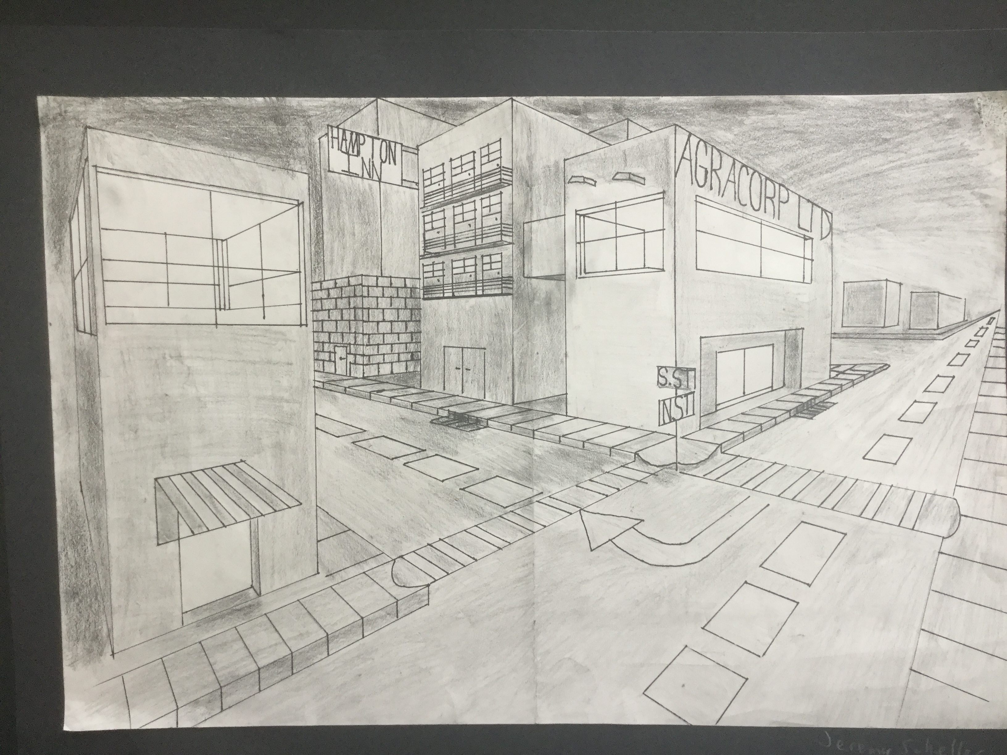 Perpsective Analysis - In order to complete emphasis using rule of thirds, I positioned my "Agracorp" building on an intersection of interest. I also placed lights on the side of the building in order to provide a contrast in value compared to the other buildings on that side of the street.