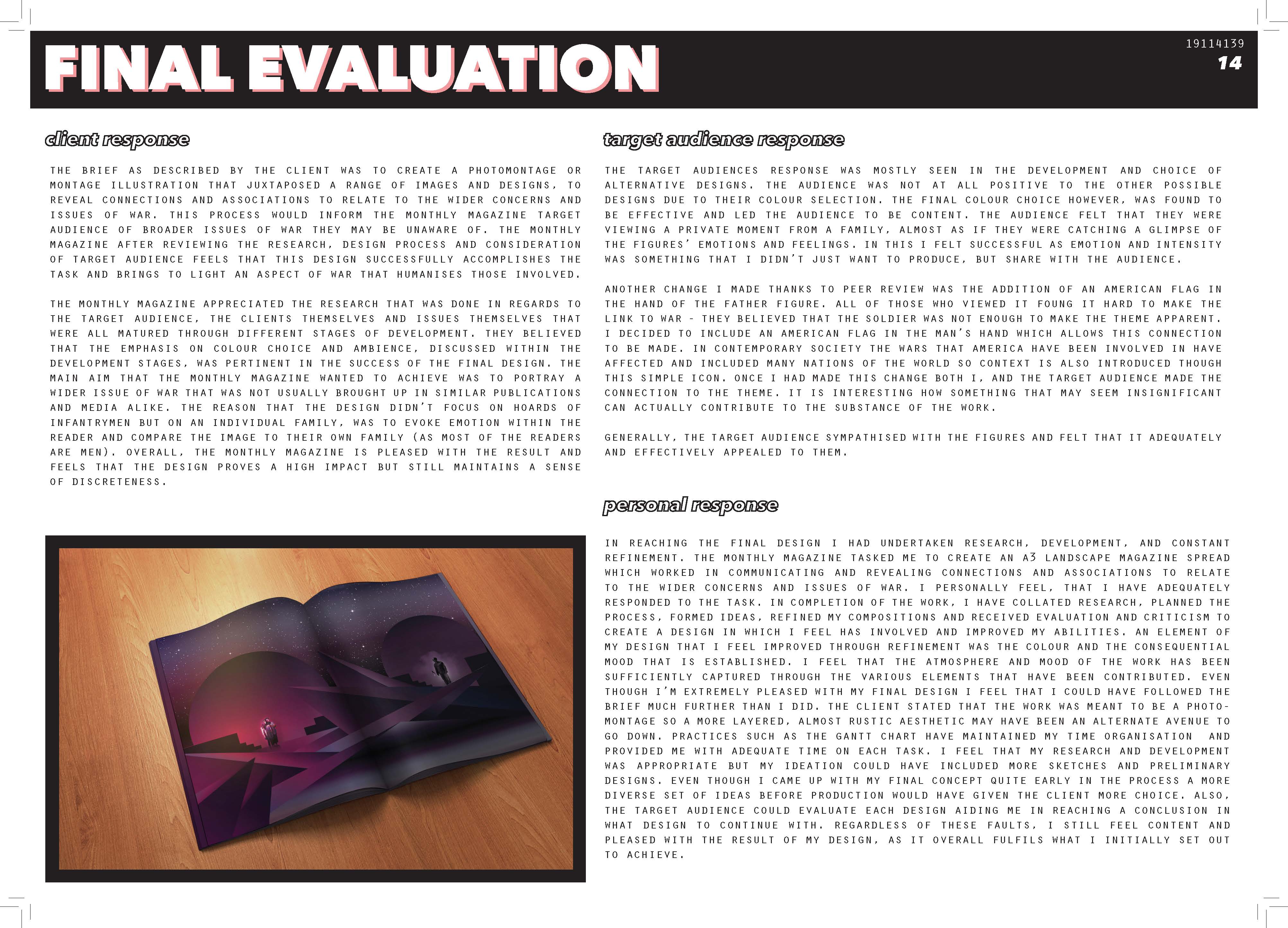 Learning helps designers improve their performance and, for this reason, designers should always seek client and target audience feedback and determine if the solution met the goals and constraints of the brief. This may identify improvements that can be made in the future.
