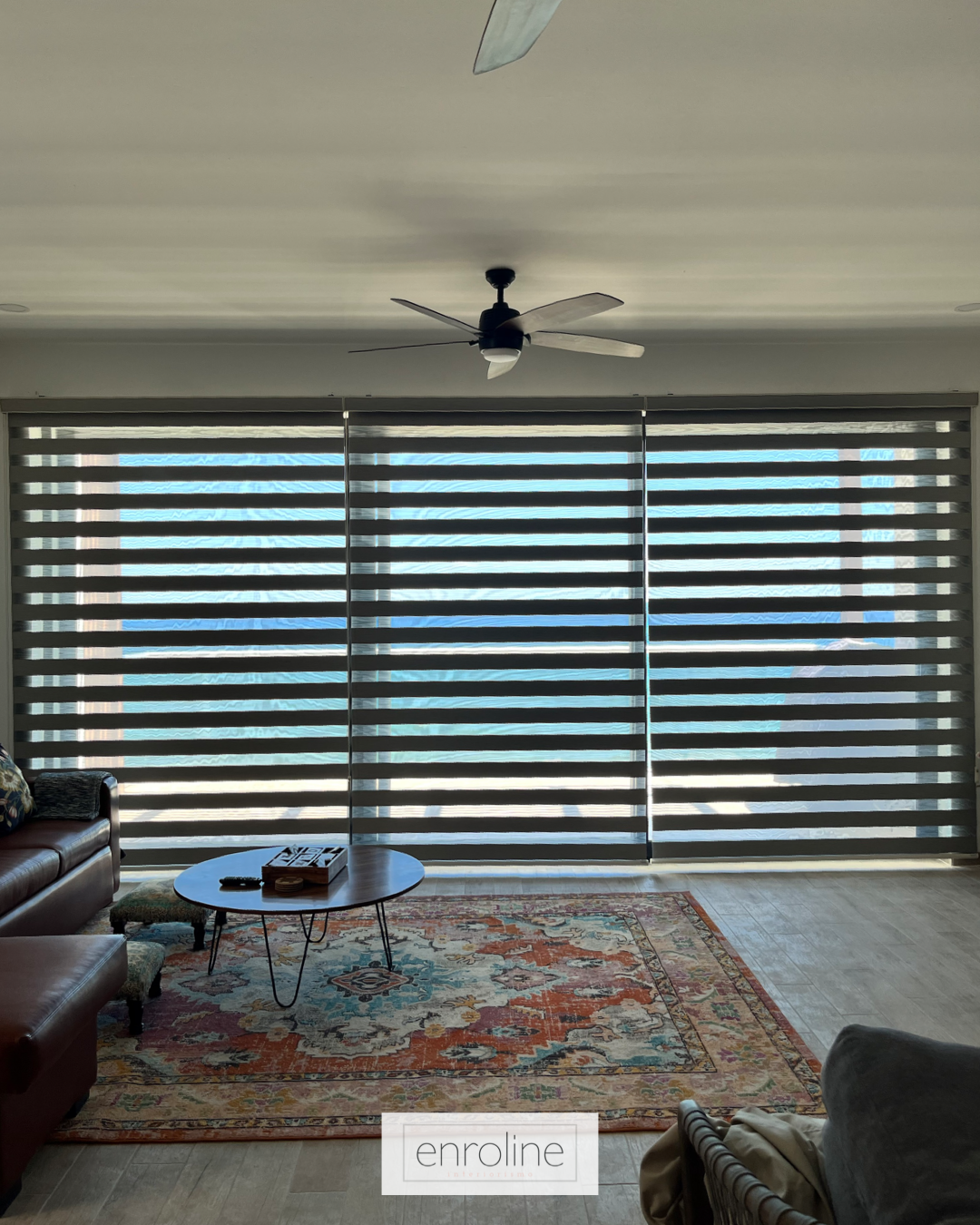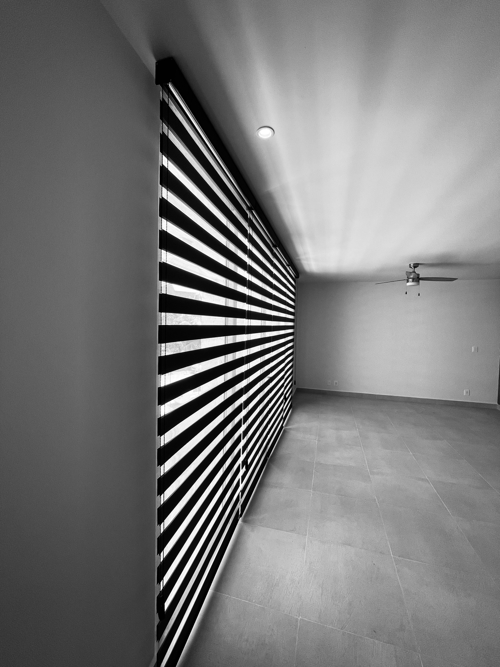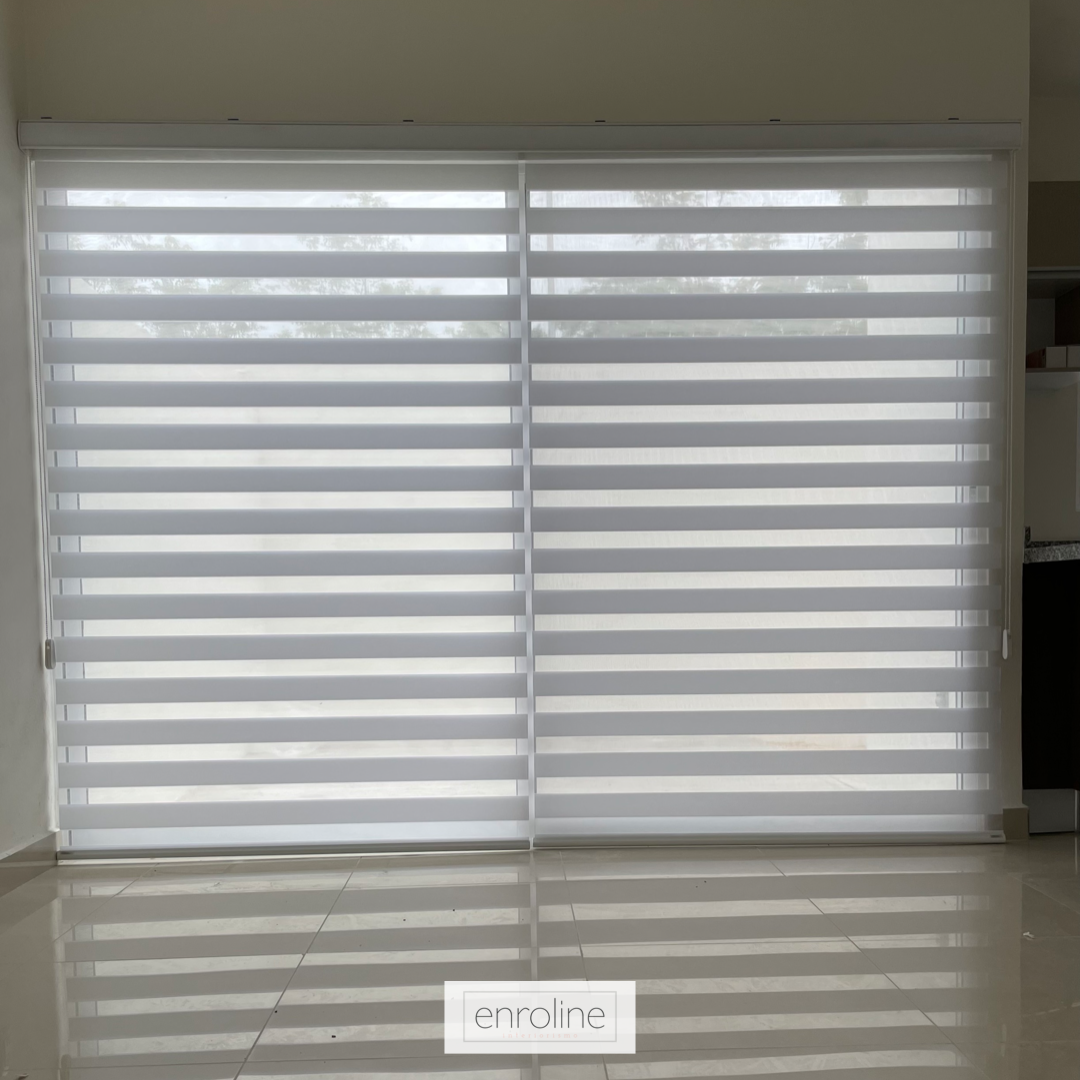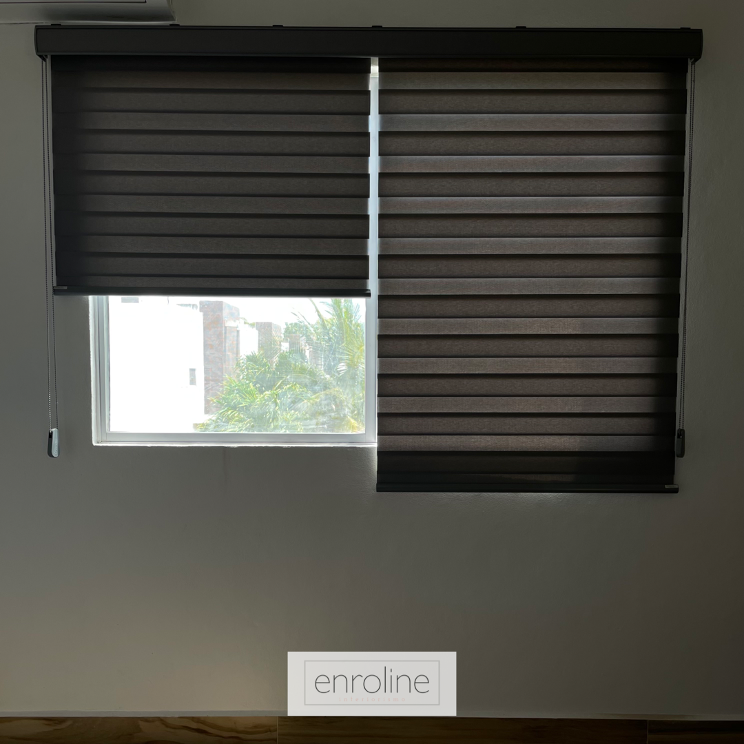 Diseño vanguardista, vistoso, compuesto por una doble tela con bandas horizontales opacas y translúcidas que se sobreponen entre sí, graduando la luminosidad y visibilidad al exterior.