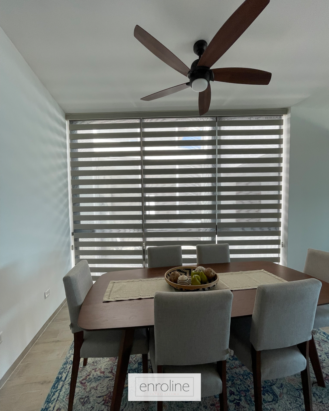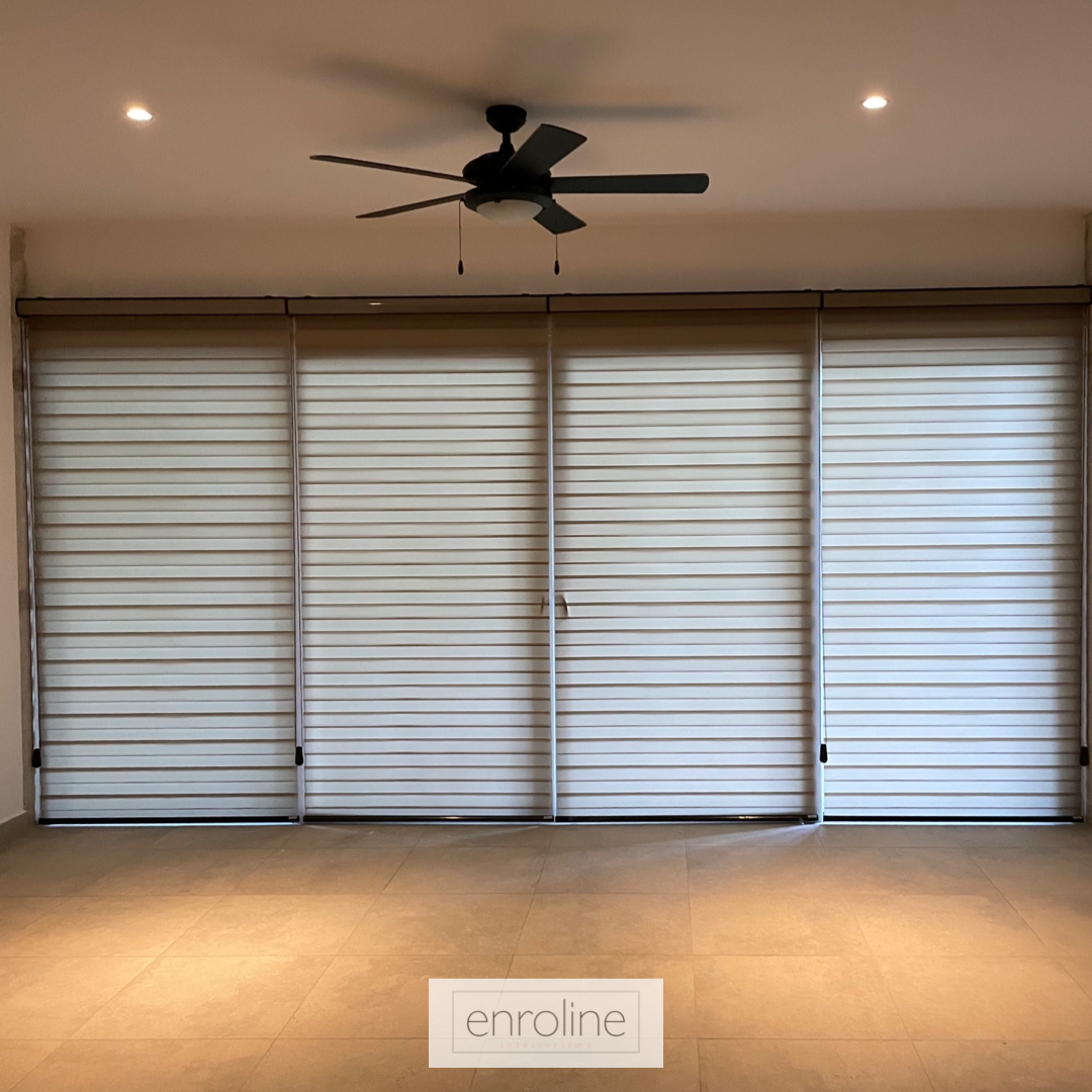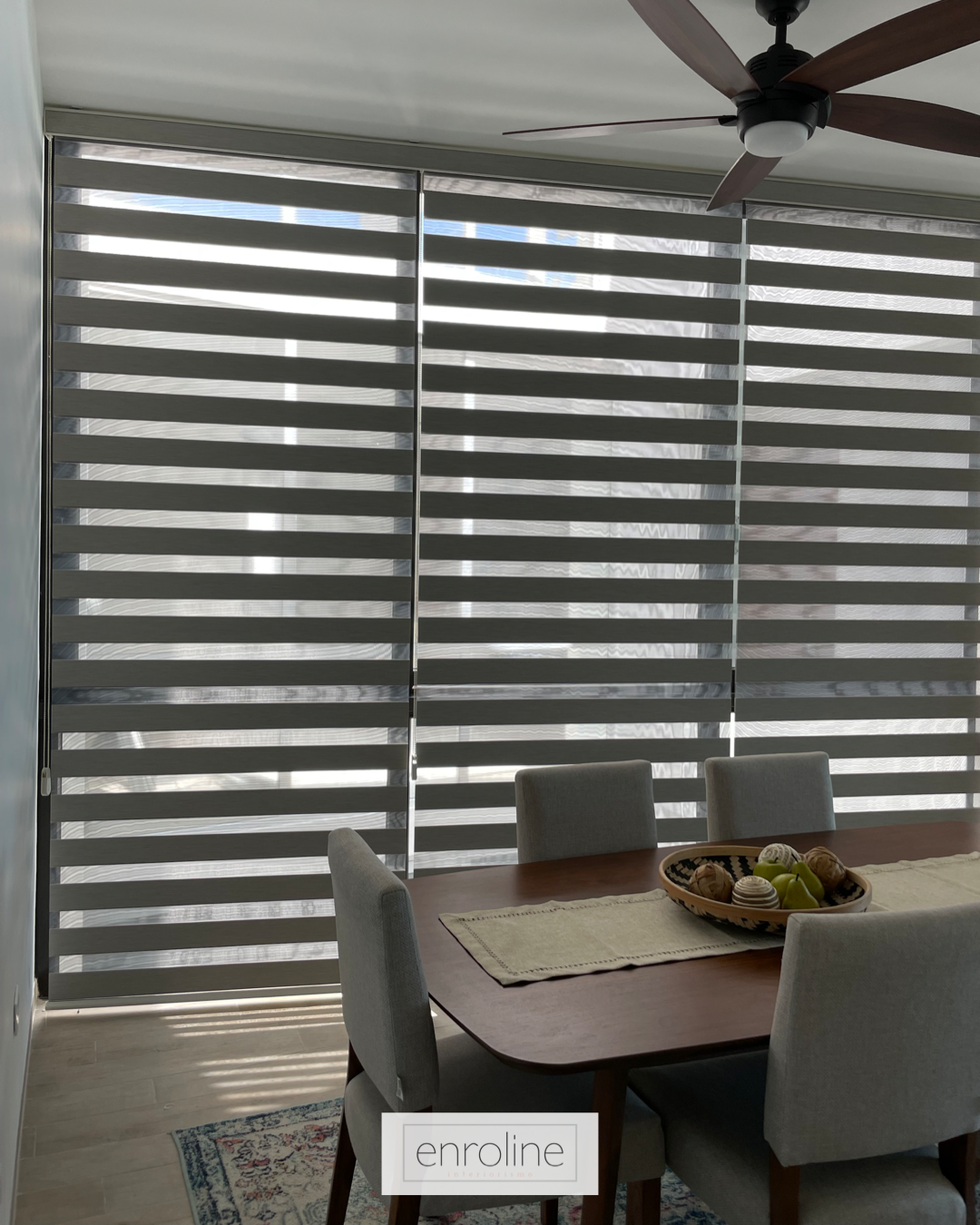 Diseño vanguardista, vistoso, compuesto por una doble tela con bandas horizontales opacas y translúcidas que se sobreponen entre sí, graduando la luminosidad y visibilidad al exterior.
