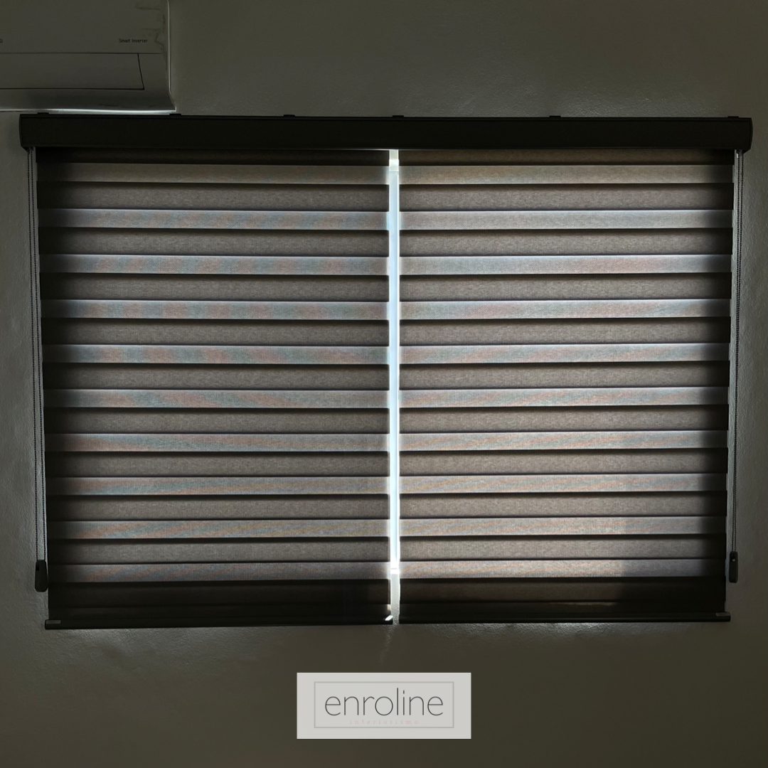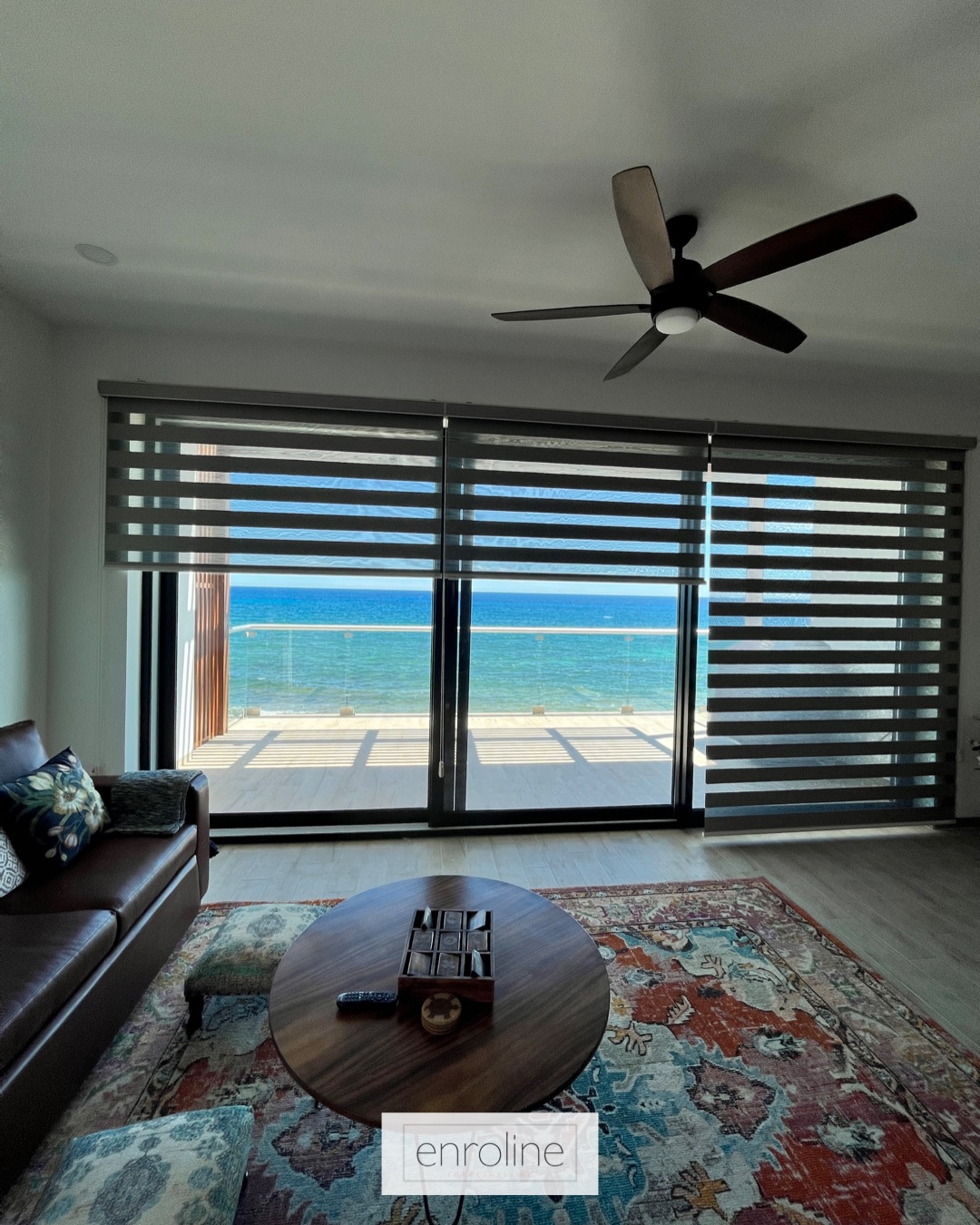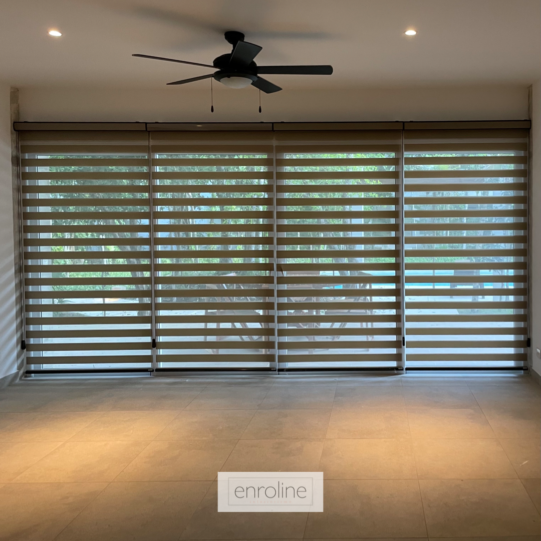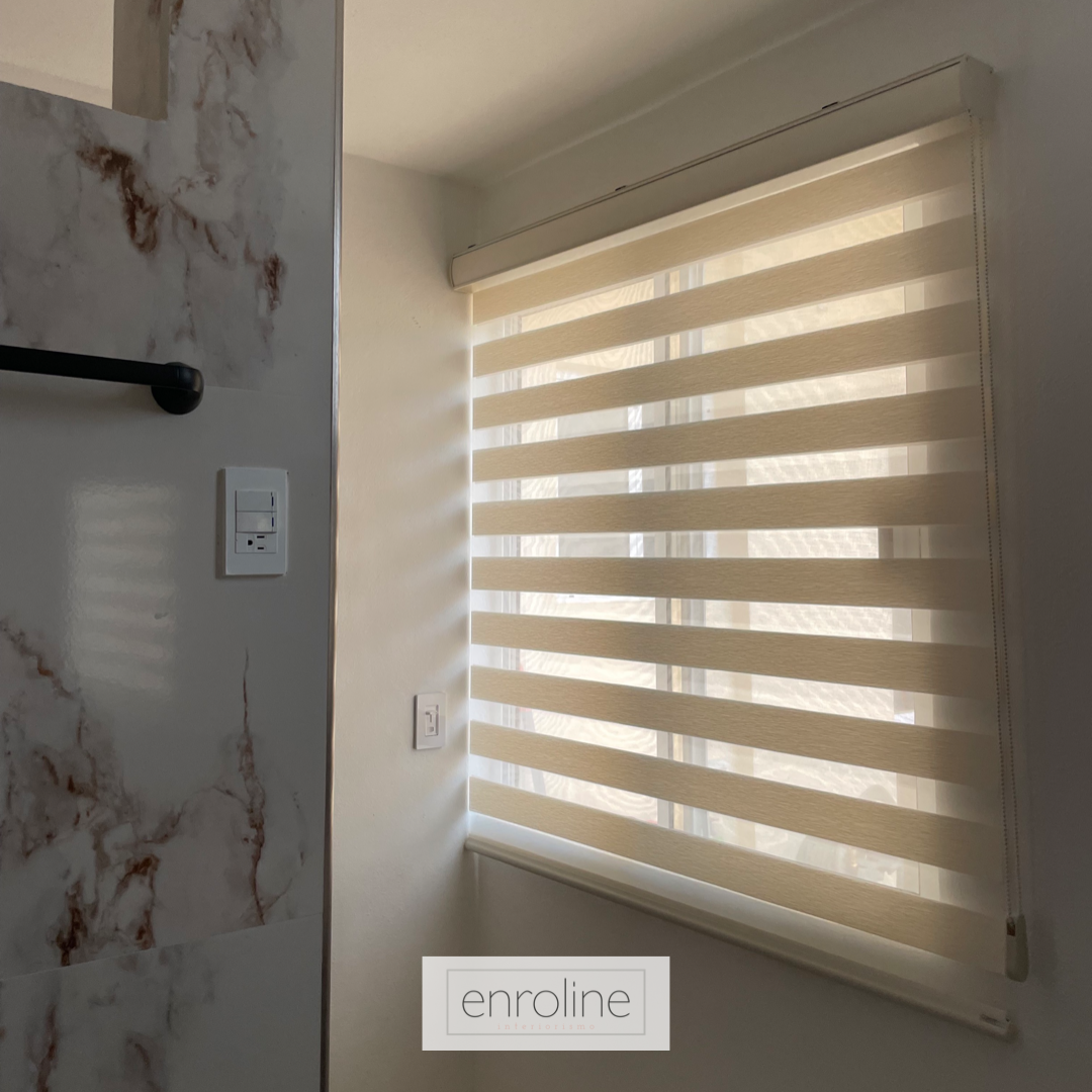 Diseño vanguardista, vistoso, compuesto por una doble tela con bandas horizontales opacas y translúcidas que se sobreponen entre sí, graduando la luminosidad y visibilidad al exterior.