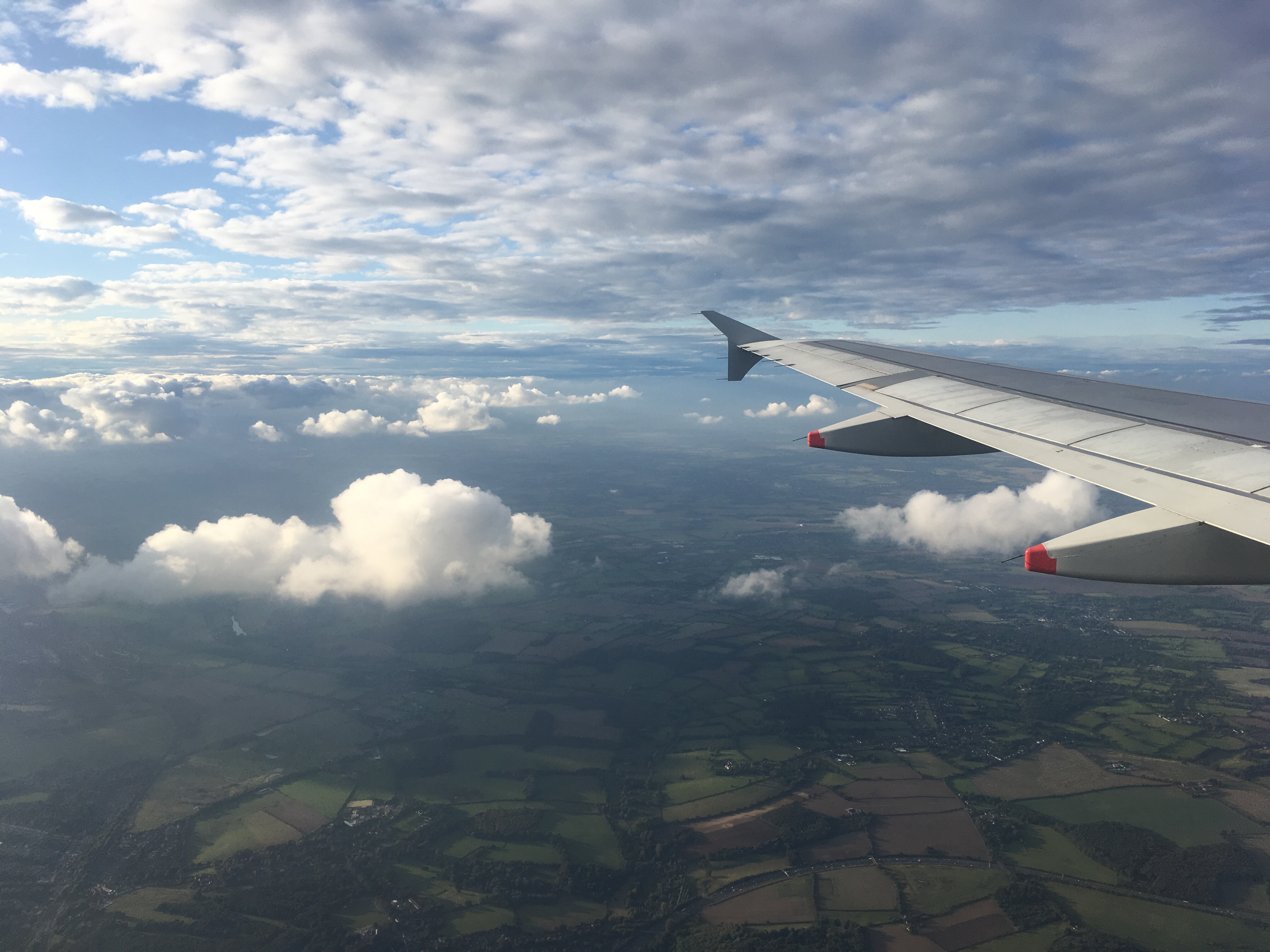 The flight is totally rammed, as they’d said. As is typical I am dozing off by the time we come to take off, but I manage to take notice of the frankly really quite funny Sport Relief safety video. Thumbs up for that. But once it’s done I’m back listening to podcasts: Edge and Christian having a natter with John Cena. I play a couple of games on iPad; the view out of the window after the ascent is mostly just clouds.