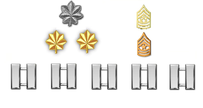 From here, things will escalate quickly. In order to save little time it will just be picture after picture. Basic things apply, the Commanding Officer (LTC followed by Col.) will be on the upper left and their Senior Enlisted Advisor (CSM) will be on the upper right. Majors will be shown below the LTC and Col as they do not serve in a command position, but on the staff that helps run the BN or Bde. The SGM will be next to the Majors and below the CSM as they help advise and run the staff. The only things that will change are the ranks at the bottom. From here we go to Battalion (BN) to Brigade (Bde).
