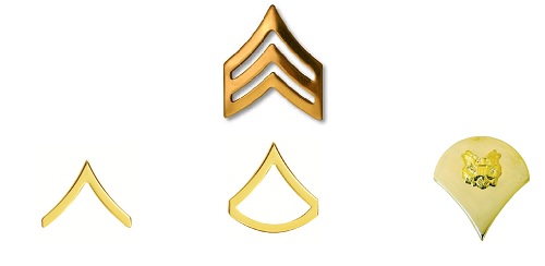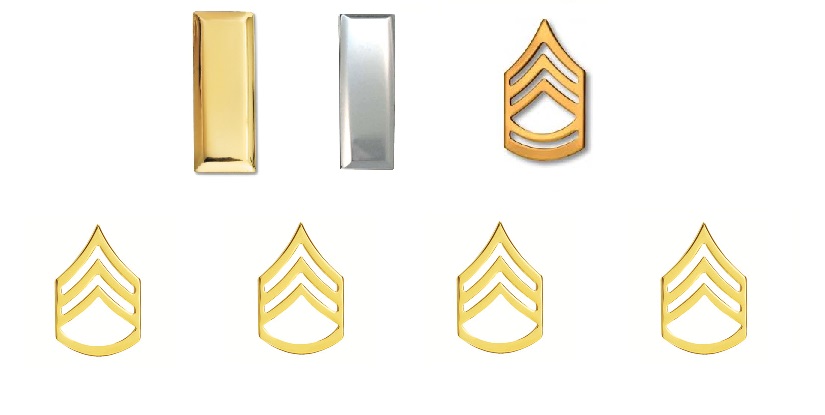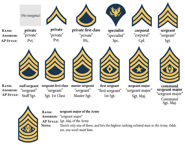 Here we have a chart of the enlisted ranks. Starting with the Private (Pvt.) that has no insignia to the Sergeant Major of the Army at the very bottom. From the rank of Pvt to Spc they are Soldiers. Once you become a Corporal or Sergeant you become a Non-Commissioned Officer (NCO) who leads Soldiers.