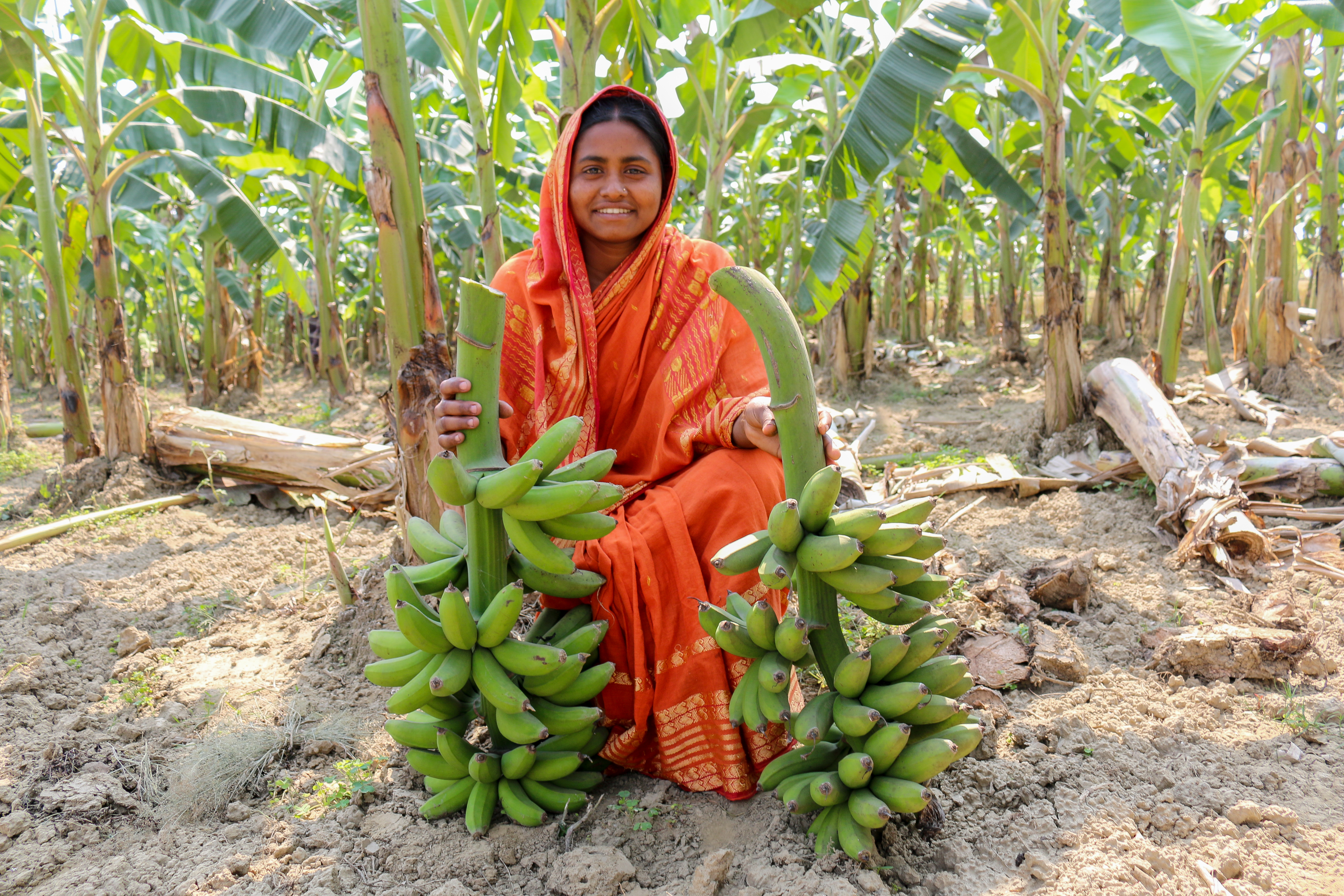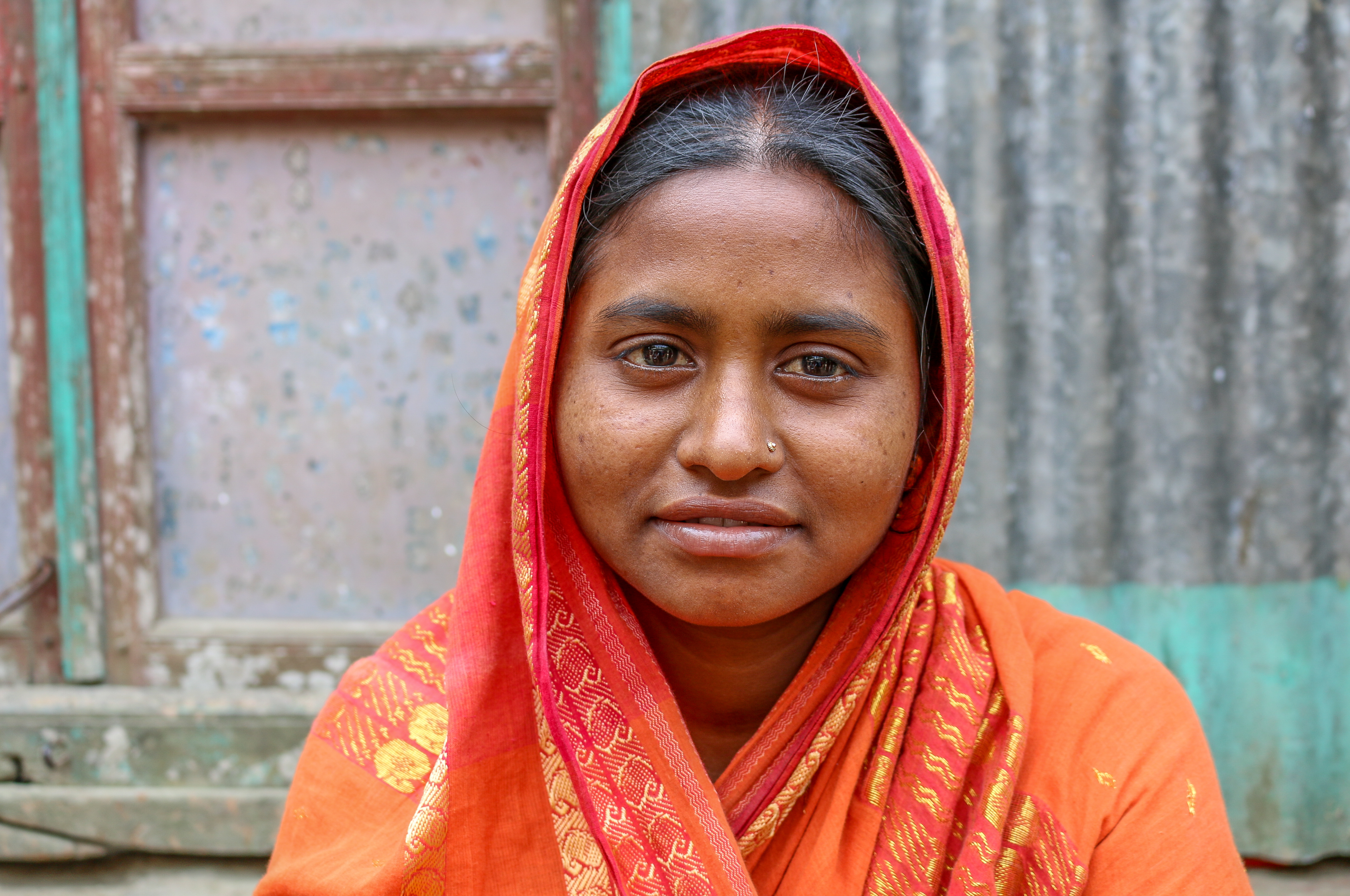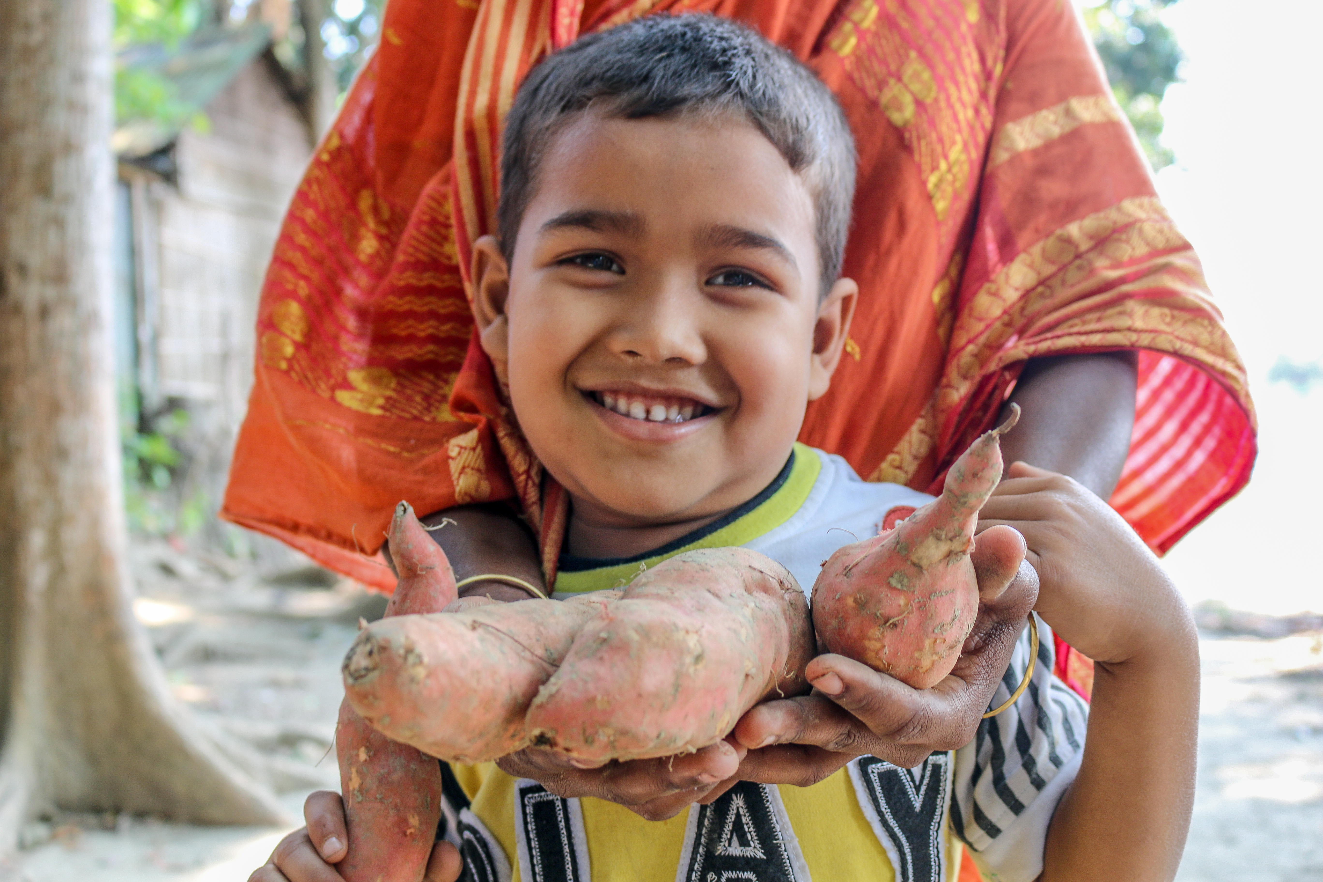 The only thing to distract from Sabrina’s wide smile and lively eyes, is the beautiful and vibrant traditional Bangladeshi dress that she is wearing. As she walks quickly across the dirt courtyard towards the front door of her one room house, the bright orange fabric billows around her and brings a festive, celebratory feel to her every move. Sabrina enters the house and quickly appears back at the door way with her arms full of sweetpotato roots and vines. With her telltale smile she proudly lays the produce out before her as if to show off her bounty.
