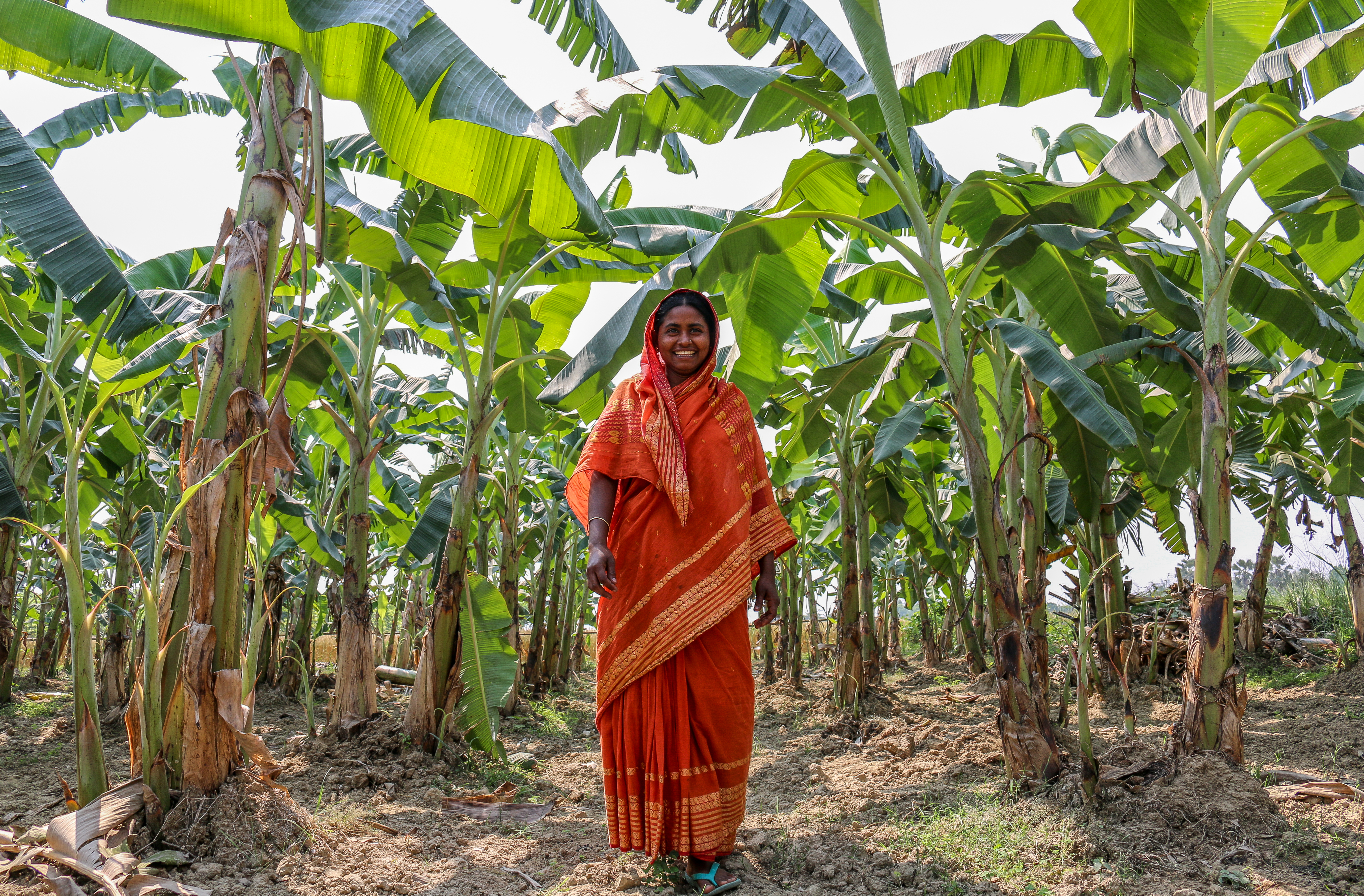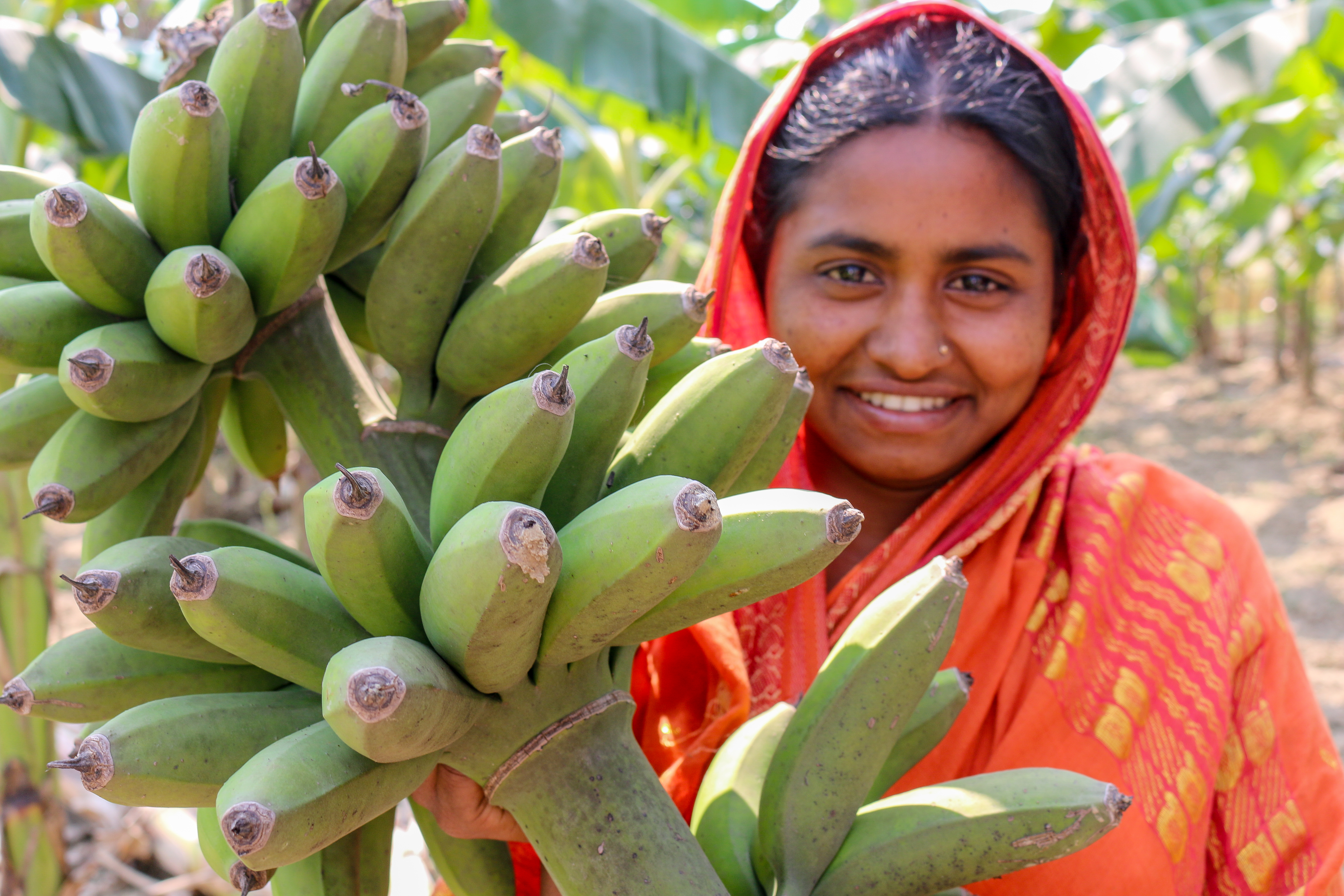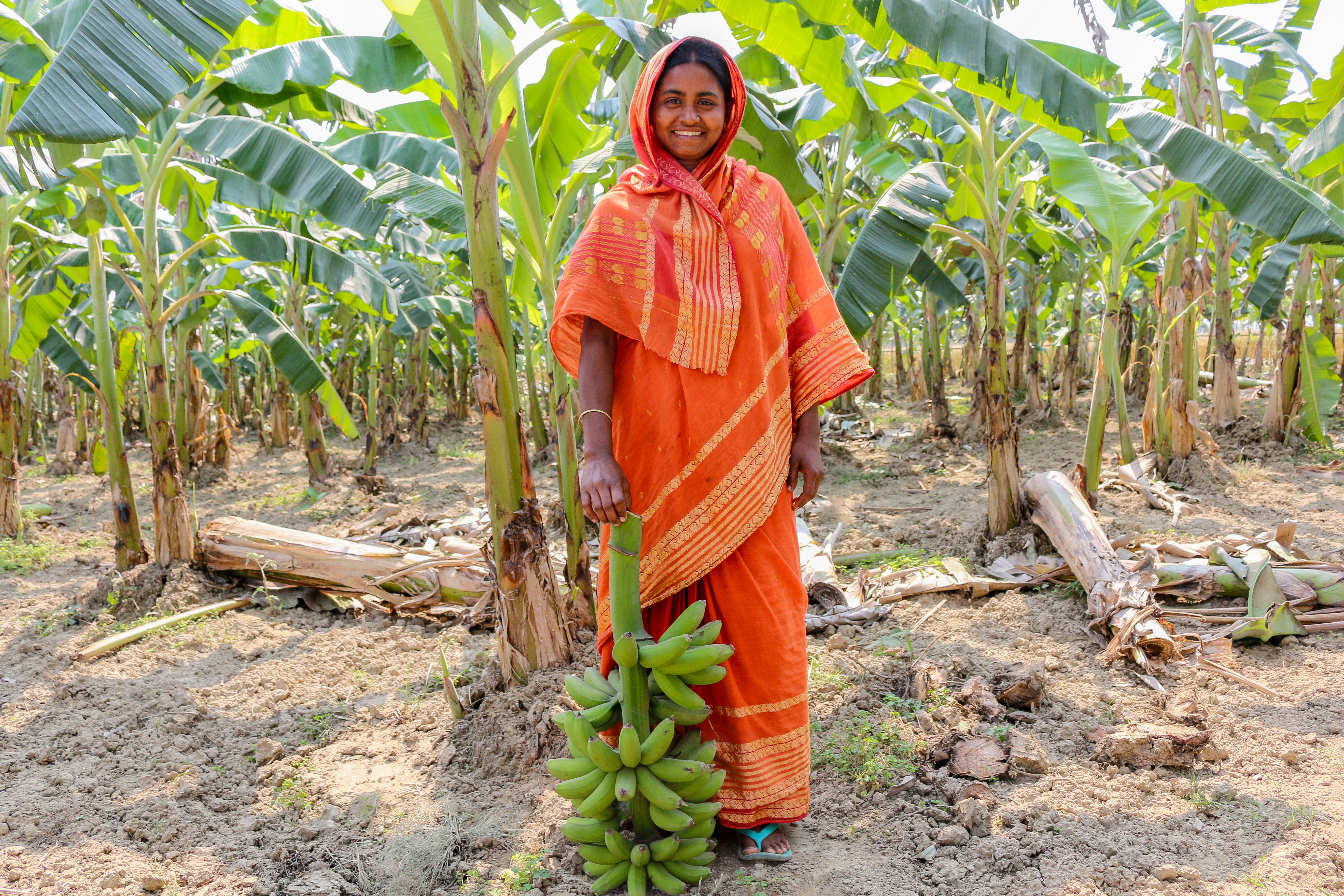 The only thing to distract from Sabrina’s wide smile and lively eyes, is the beautiful and vibrant traditional Bangladeshi dress that she is wearing. As she walks quickly across the dirt courtyard towards the front door of her one room house, the bright orange fabric billows around her and brings a festive, celebratory feel to her every move. Sabrina enters the house and quickly appears back at the door way with her arms full of sweetpotato roots and vines. With her telltale smile she proudly lays the produce out before her as if to show off her bounty.