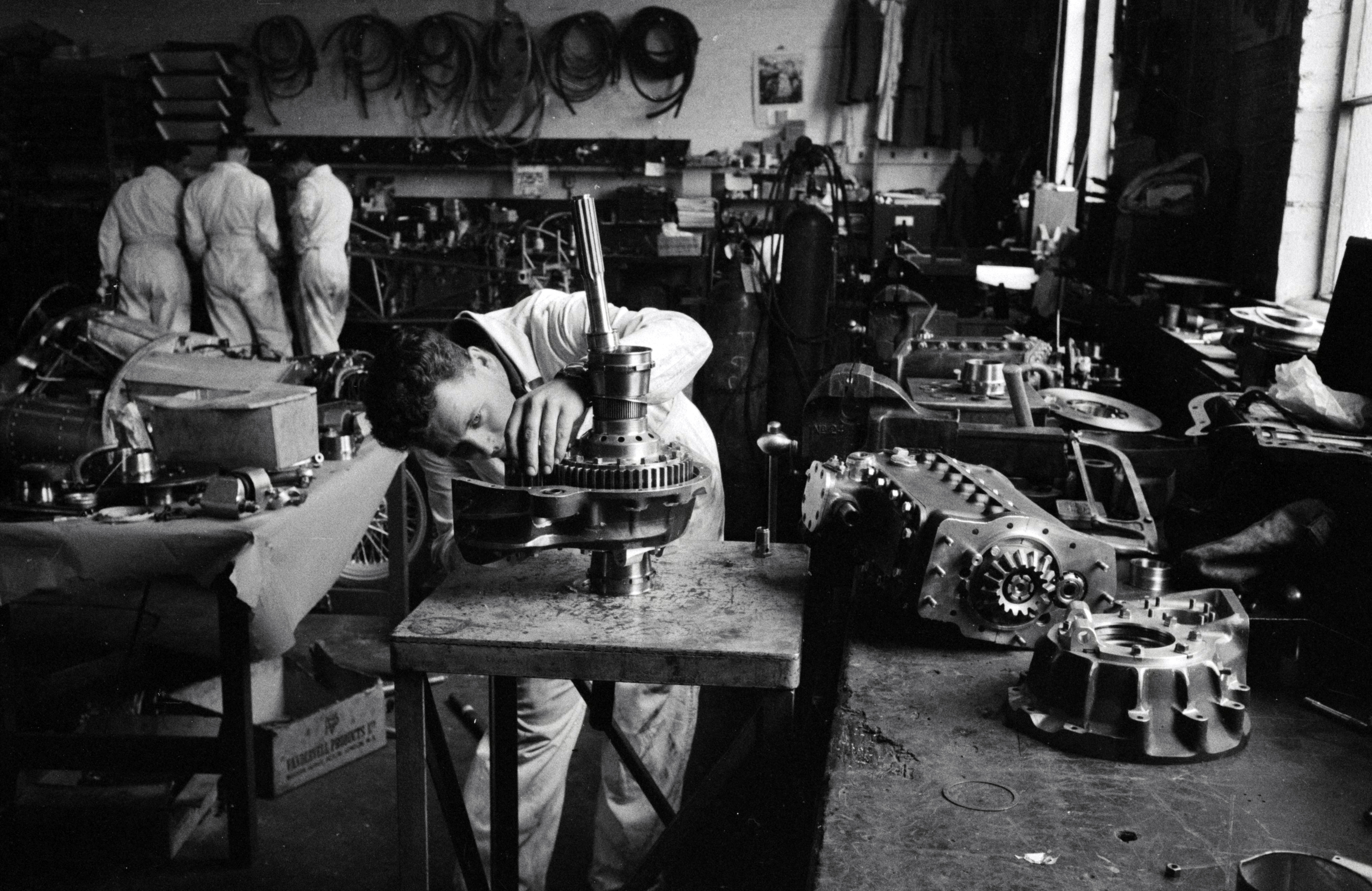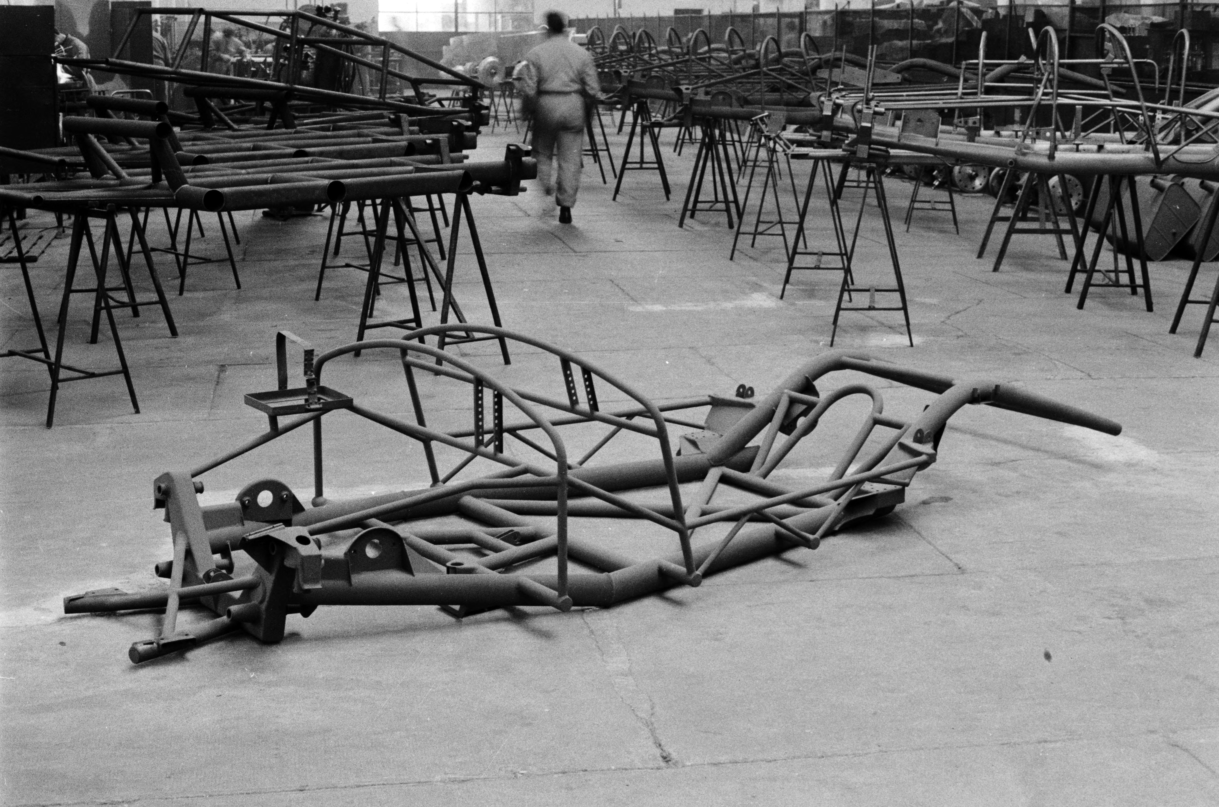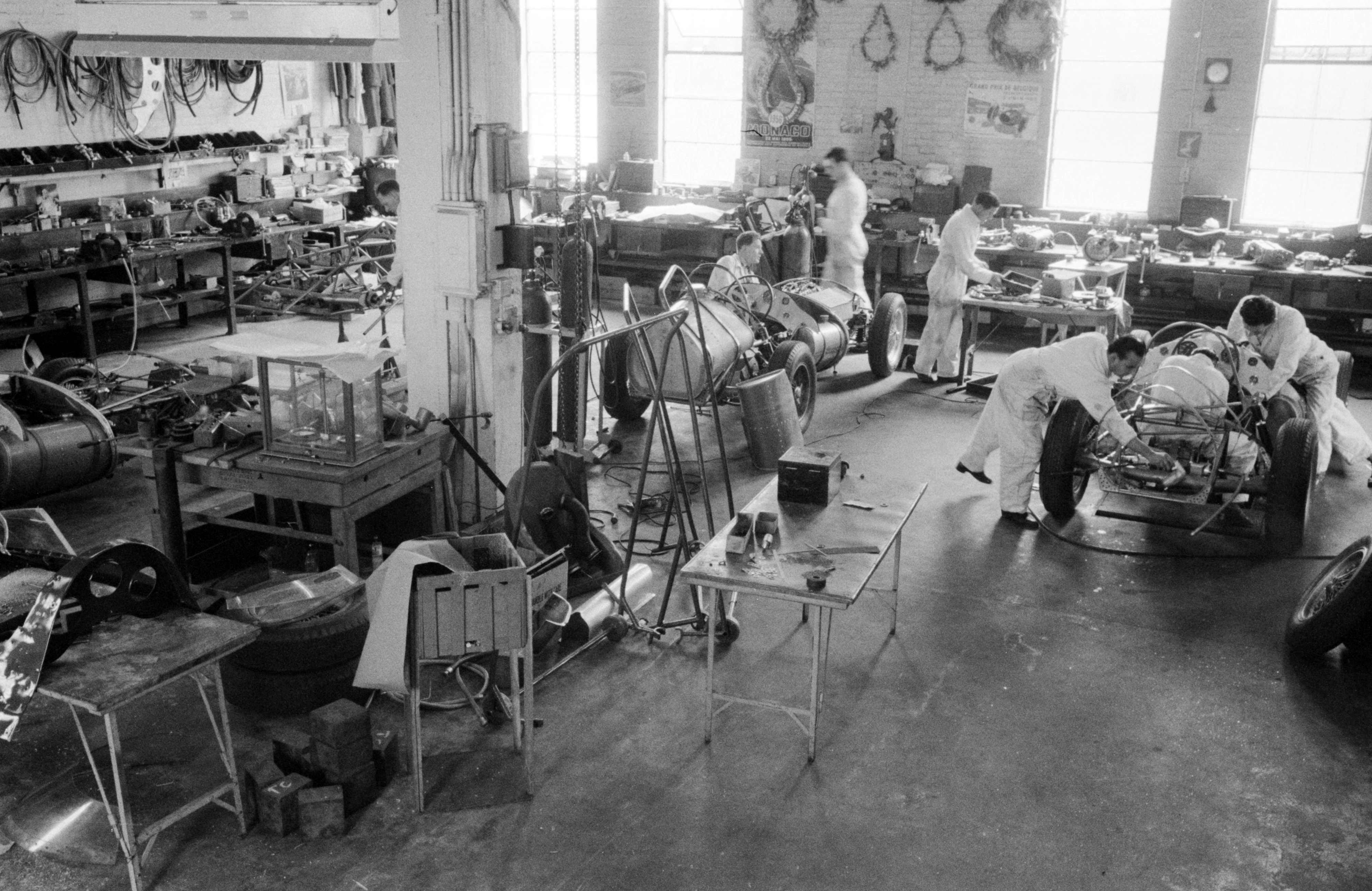 Interior shot of Tony Vandervell's Vandervell Products Ltd factory at Western Avenue, Acton, West London. In the shop are Colin Chapman-designed chassis for the Costin-designed teardrop-bodied 1956 Formula One cars.