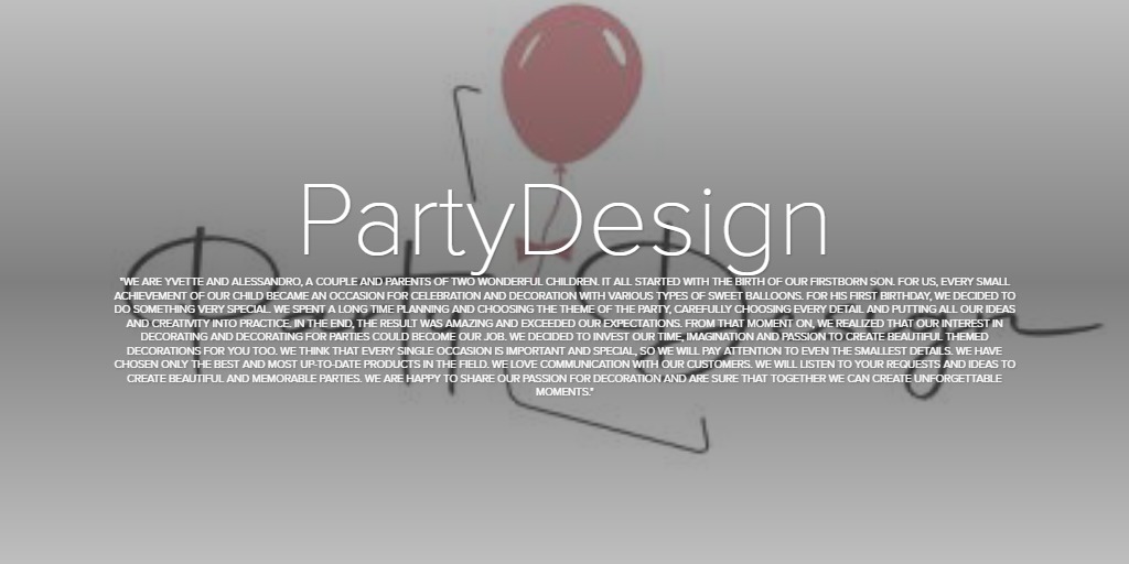 PartyDesign "We are Yvette and Alessandro, a couple and parents of two wonderful children. It all started with the birth of our firstborn son. For us, every small achievement of our child became an occasion for celebration and decoration with various types of sweet balloons. For his first birthday, we decided to do something very special. We spent a long time planning and choosing the theme of the party, carefully choosing every detail and putting all our ideas and creativity into practice. In the end, the result was amazing and exceeded our expectations. From that moment on, we realized that our interest in decorating and decorating for parties could become our job. We decided to invest our time, imagination and passion to create beautiful themed decorations for you too. We think that every single occasion is important and special, so we will pay attention to even the smallest details. We have chosen only the best and most up-to-date products in the field. We love communication with our customers. We will listen to your requests and ideas to create beautiful and memorable parties. We are happy to share our passion for decoration and are sure that together we can create unforgettable moments."