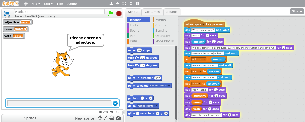 Code tells a story. It may tell how to do something, for example, sorting a list of items, how to play a game, draw a square, tell a story through an interactive book, and so on. Code is a set of instructions that can be productive or entertaining.