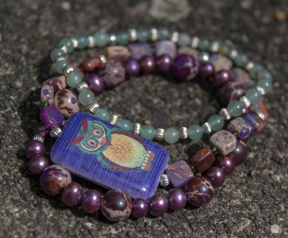 There is also a set of matching stretch bracelets. I really like the aventurine bracelet. I was surprised at the color combination and how it all came together from that little owl bead.