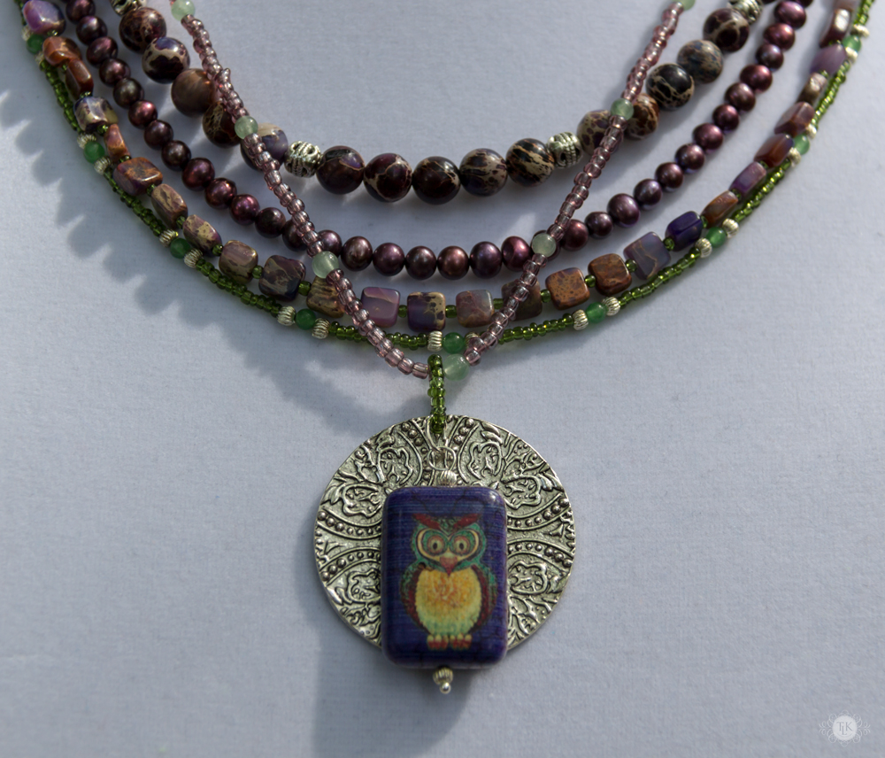 Five strand necklace inspired by a little owl focal bead nestled on top of a stamped pewter round