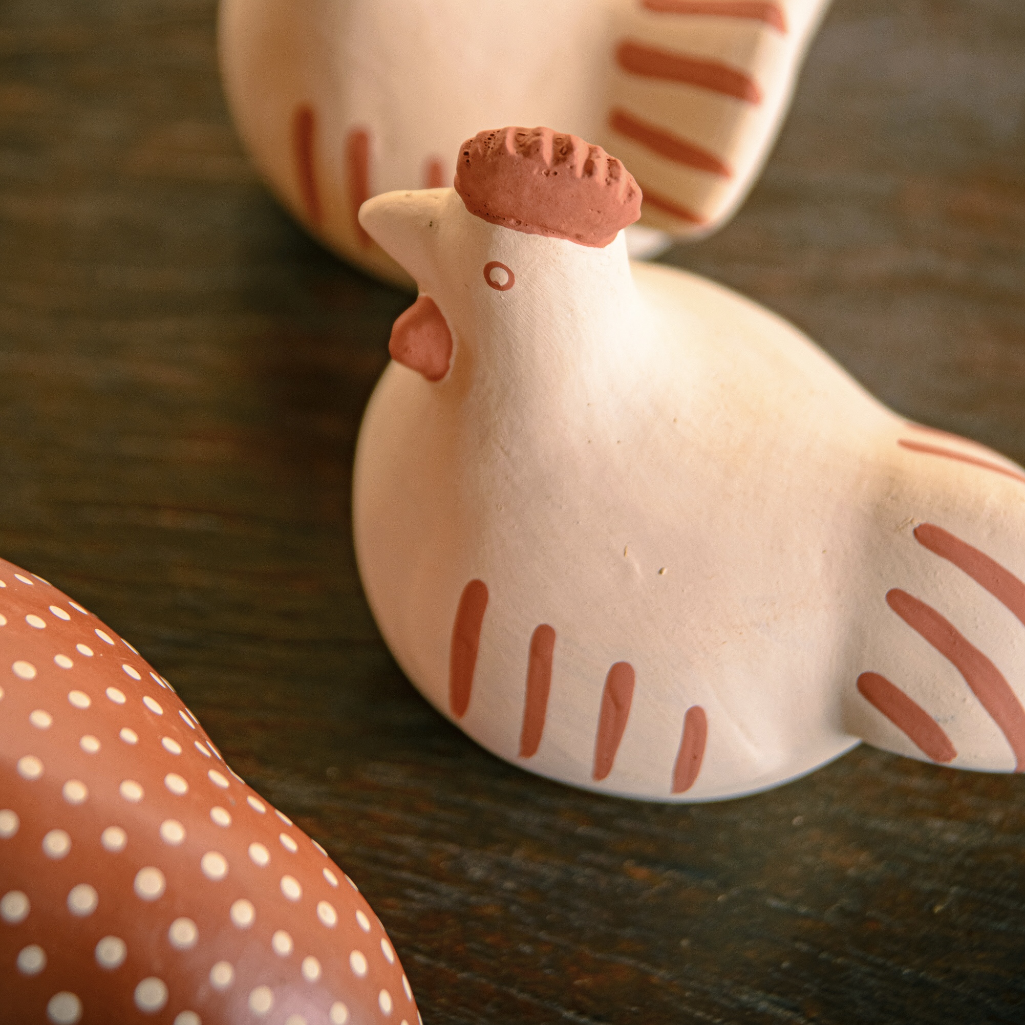 Com design autoral, as galinhas são pintadas com pigmento natural retirado do próprio barro.