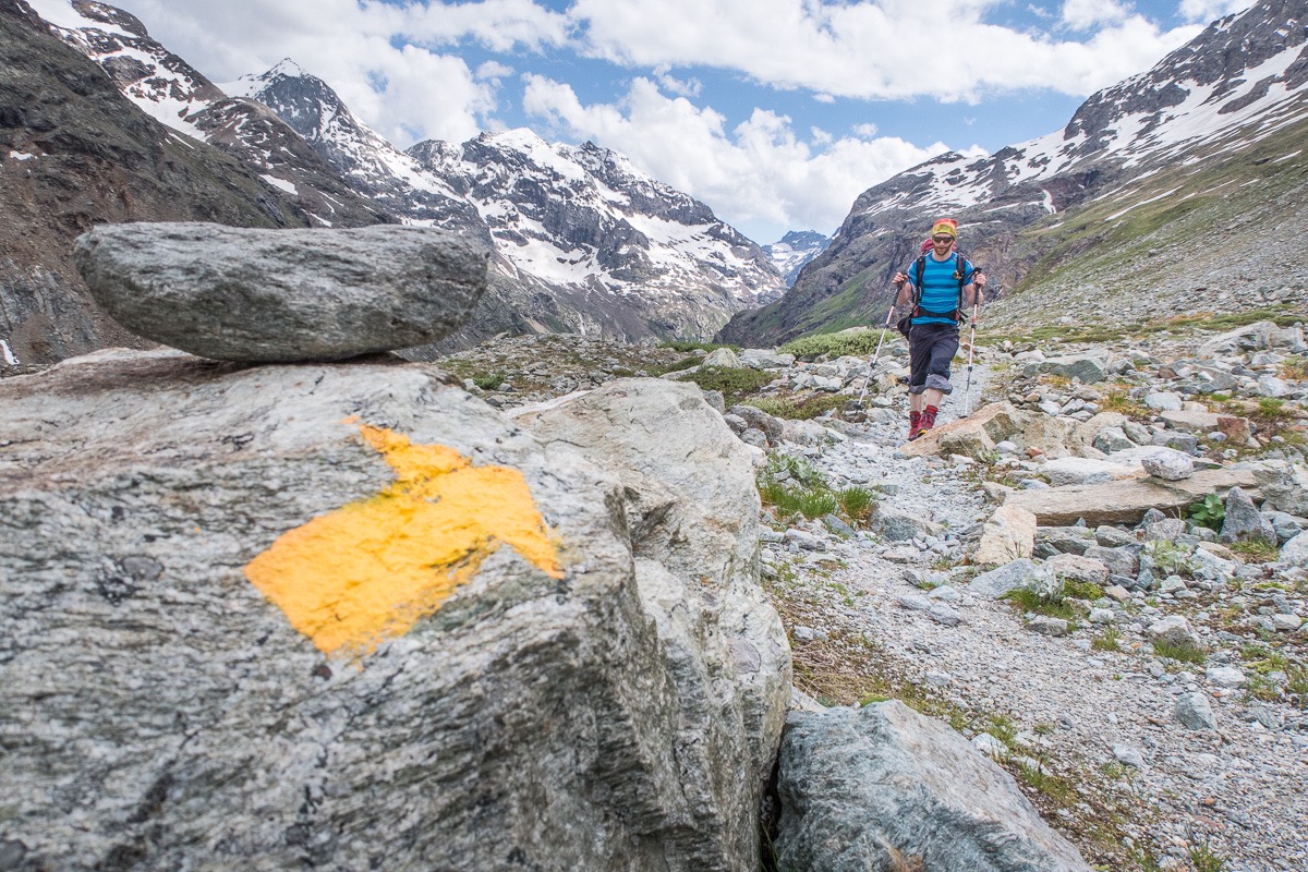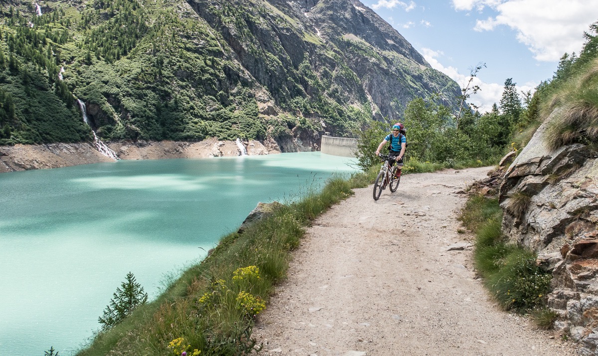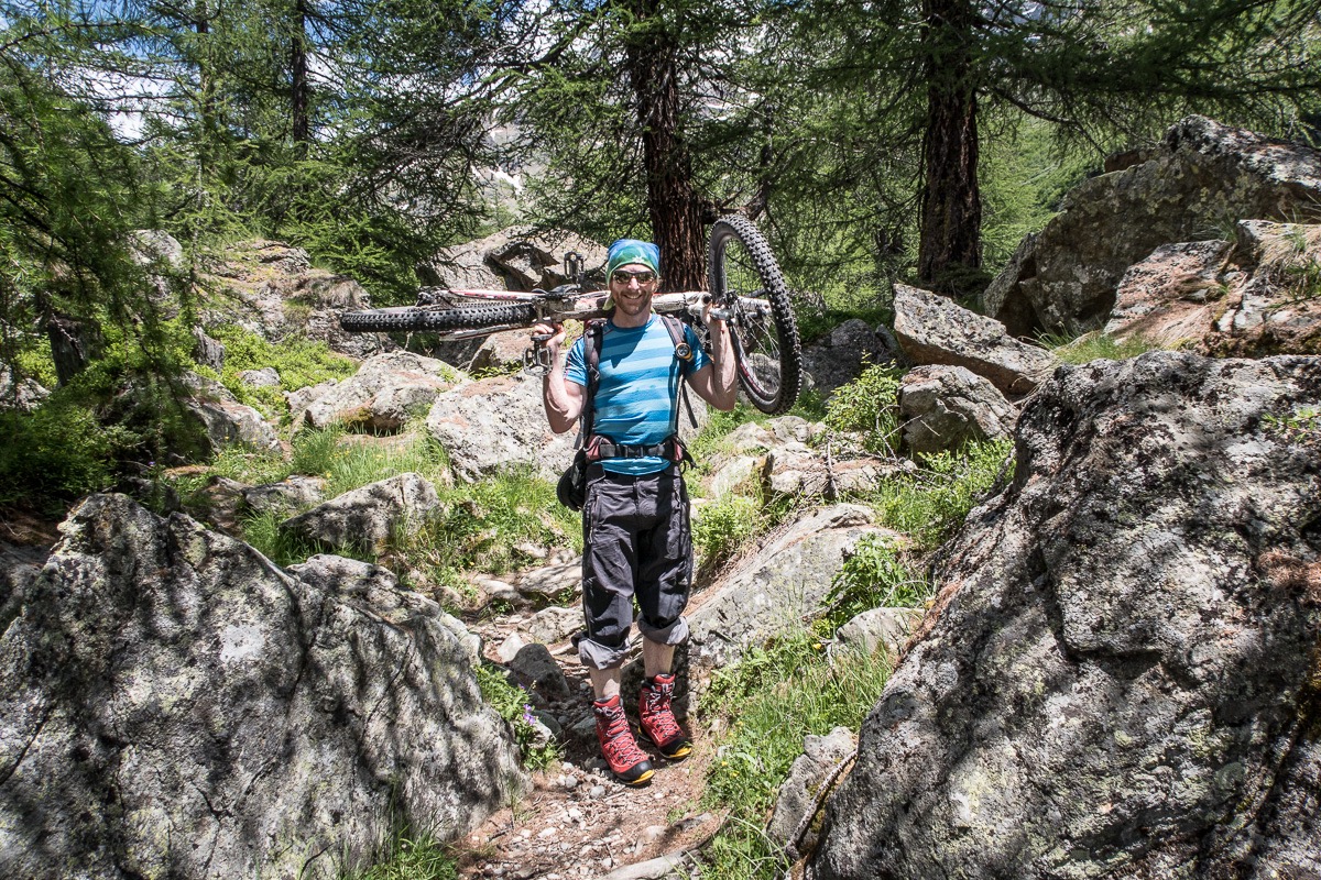 Nach dem Meet&Greet mit dem Cowboy machen wir uns mutterseelenalleine zum Rifugio Aosta auf. Die ersten Kilometer satteln wir entlang des Lac de Place unsere Bikes. Danach geht's ein wildes, ausgeapertes Gletscherbecken empor, bis wir uns bei den drei Wirtsleuten in der Aostahütte wiederfinden.