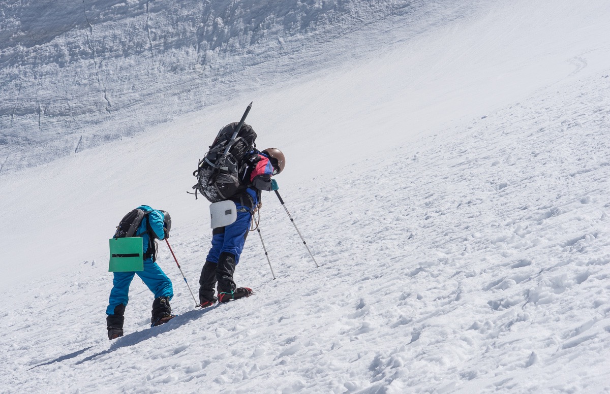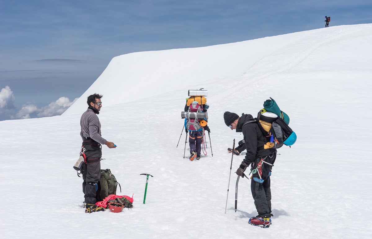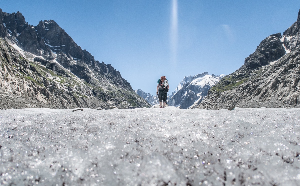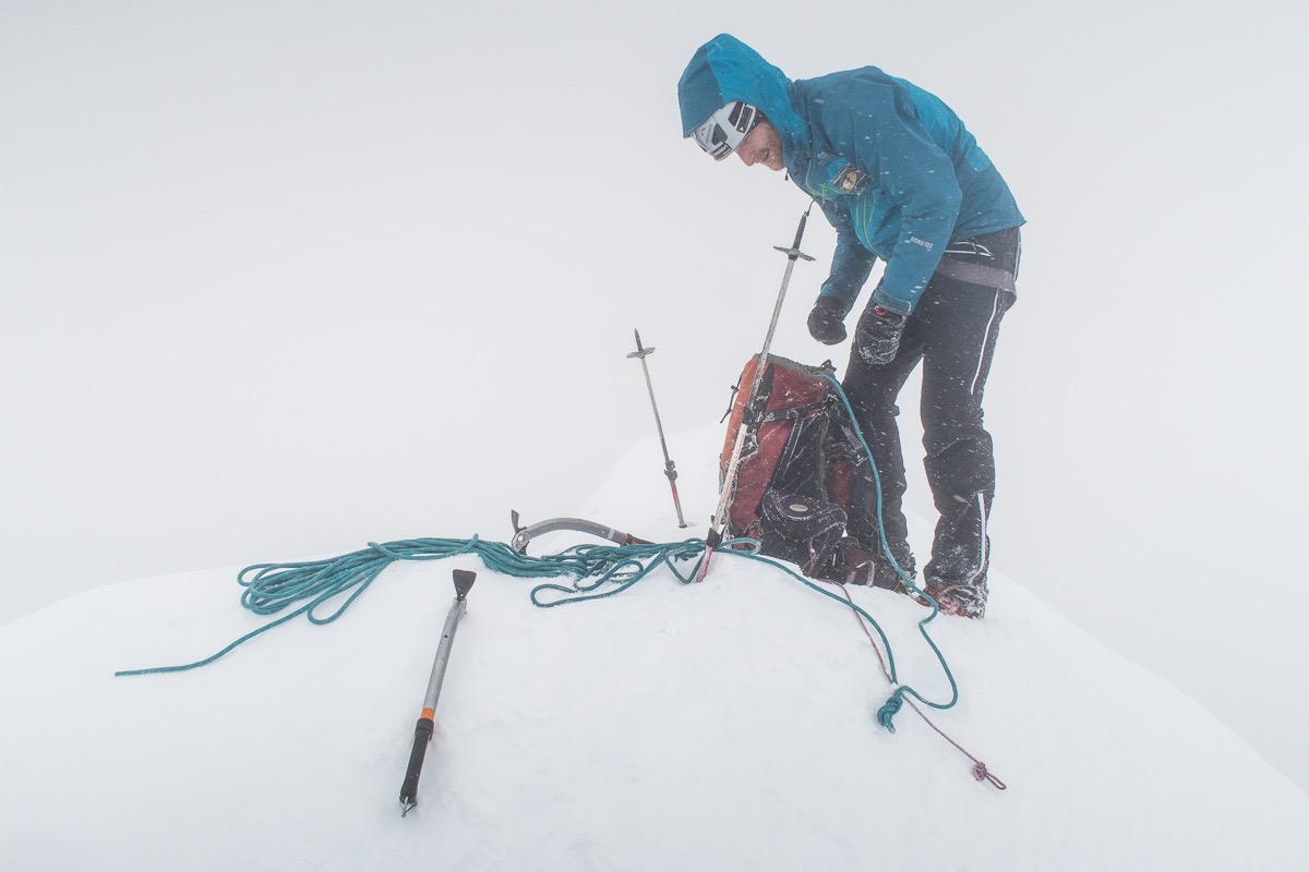Es ist drei Uhr früh, eine Stunde sind wir schon am Weg über die Schuttmoräne bis auf den Gletscher des Grandes Murailles. Das Wetterleuchten in der Ferne ist wieder verflogen. Dafür prasselt der Regen aus allen Richtungen auf uns nieder. Die Spurarbeit ist tief.