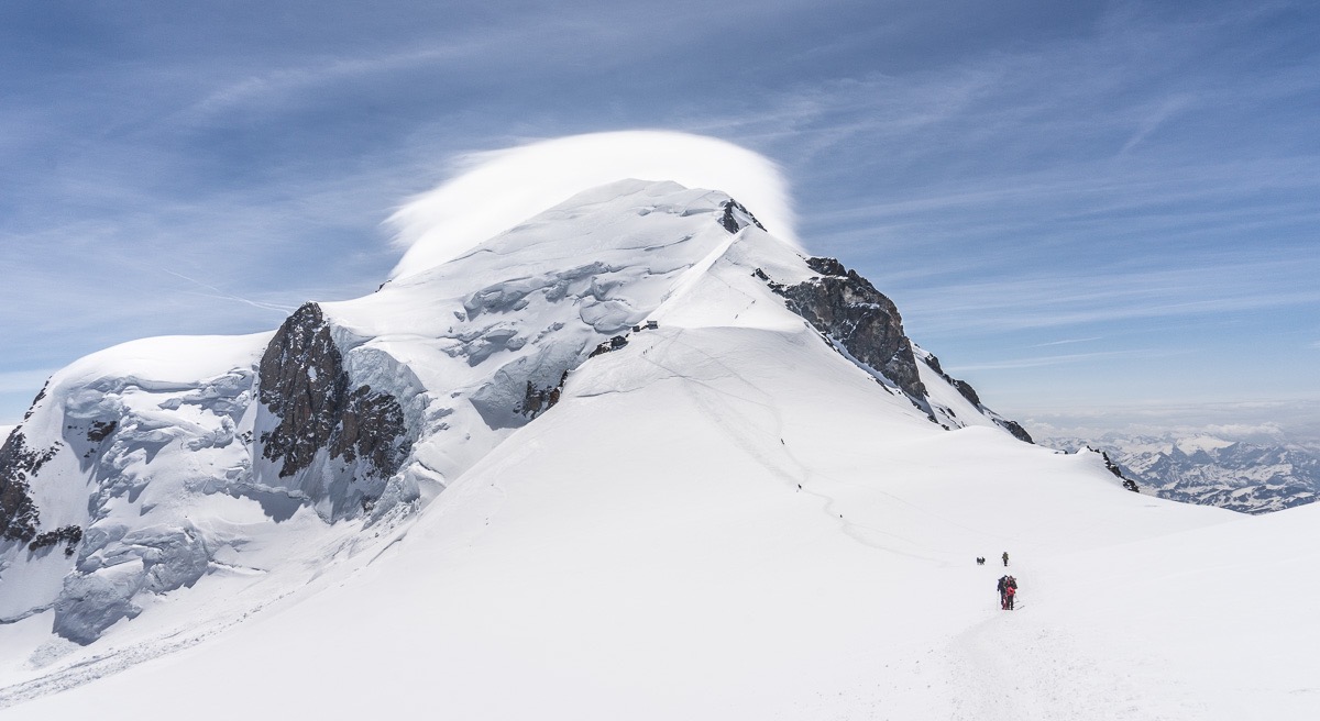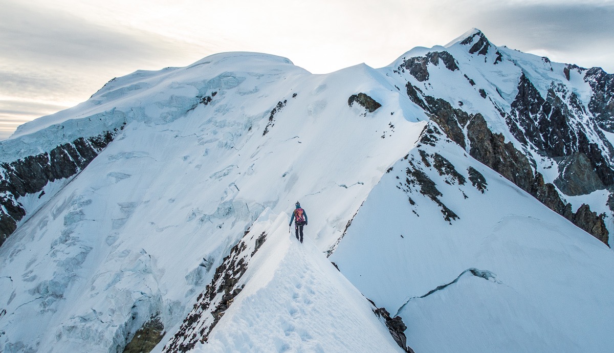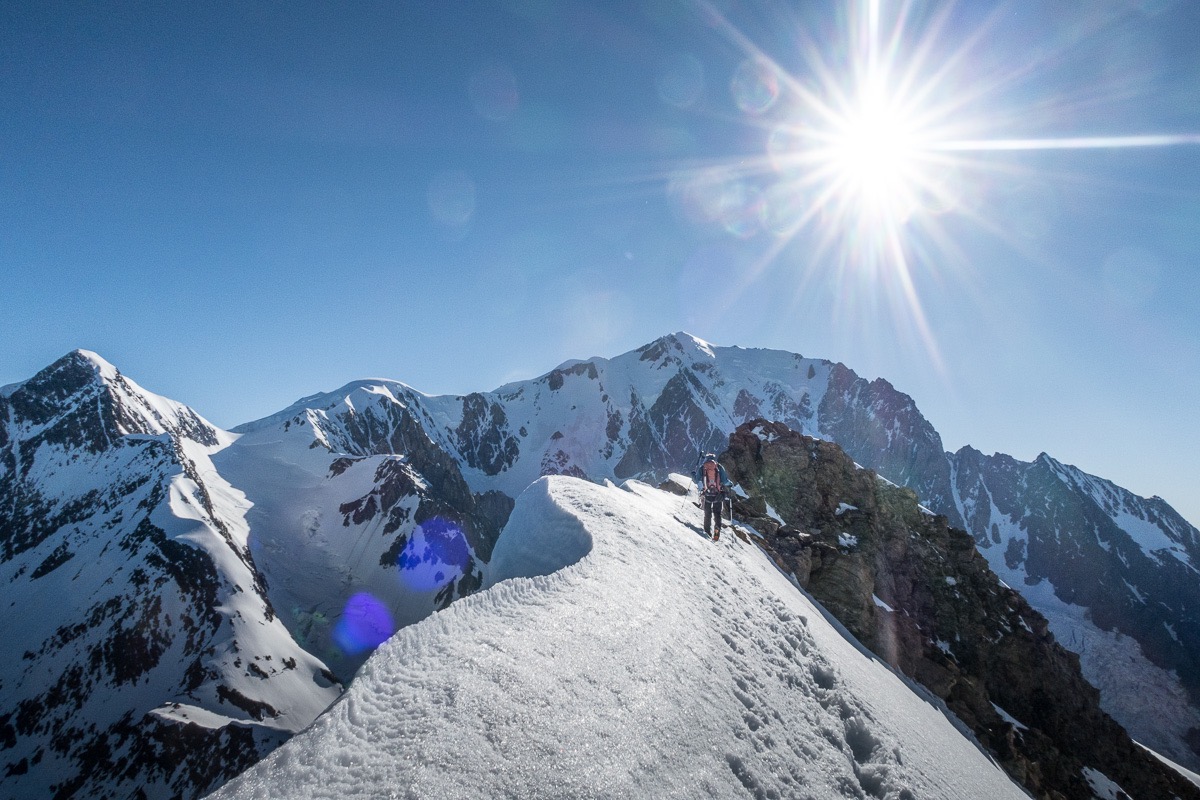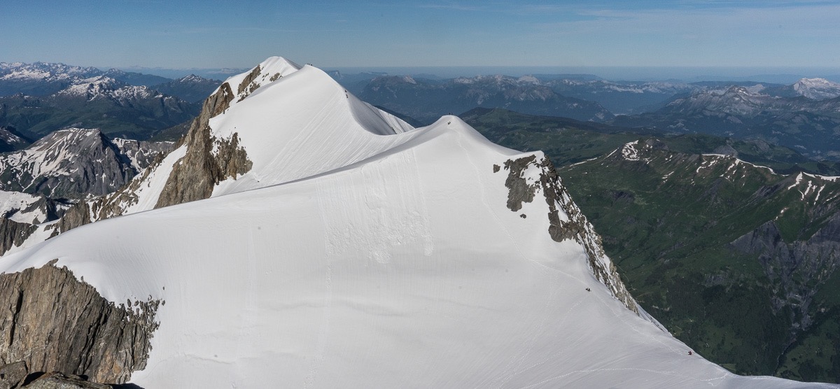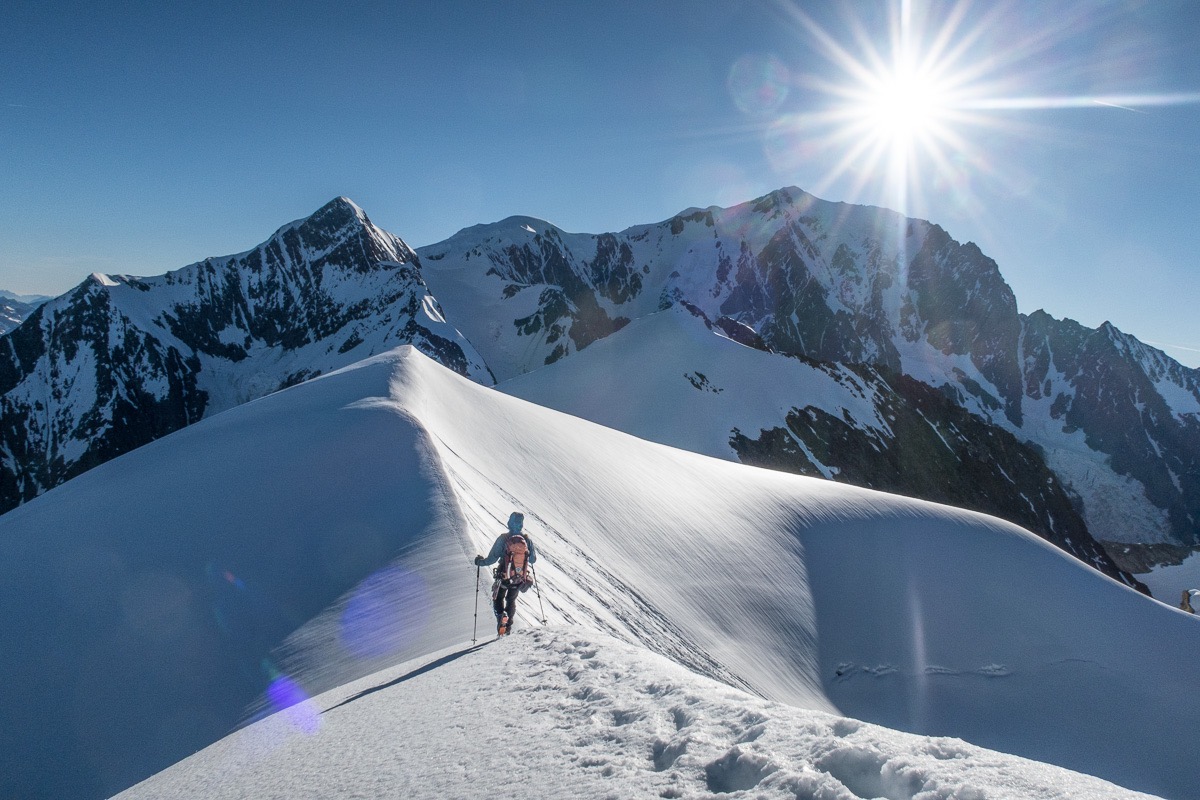 Auf der Aiguille de Bionassay geht die malerisch schöne Linie weiter: Für uns ist es wohl einer der schönsten Firngrate der Alpen, der zum Dome de Gouter führt. Schneidiger als so manch stumpfes Messer in unserer Küche.