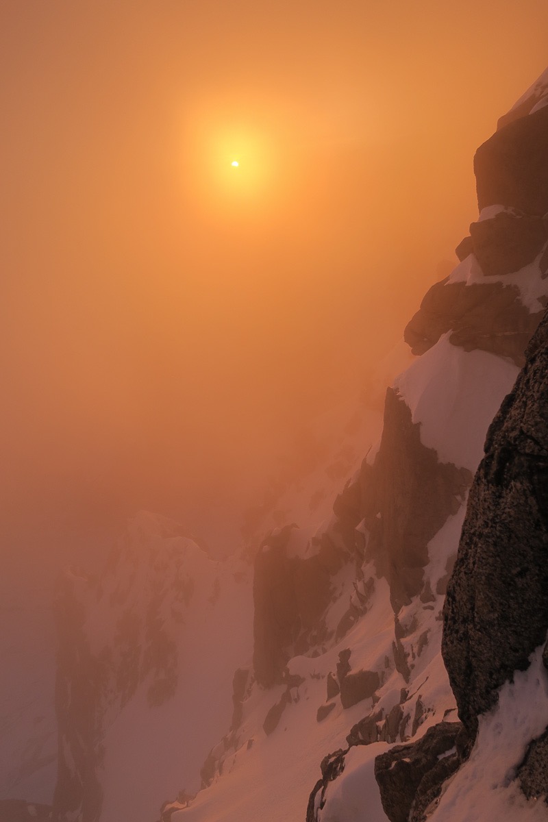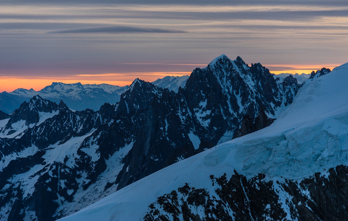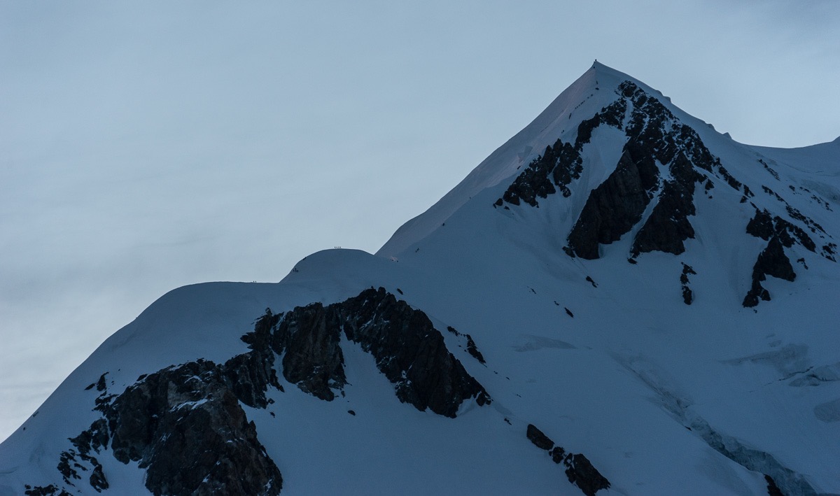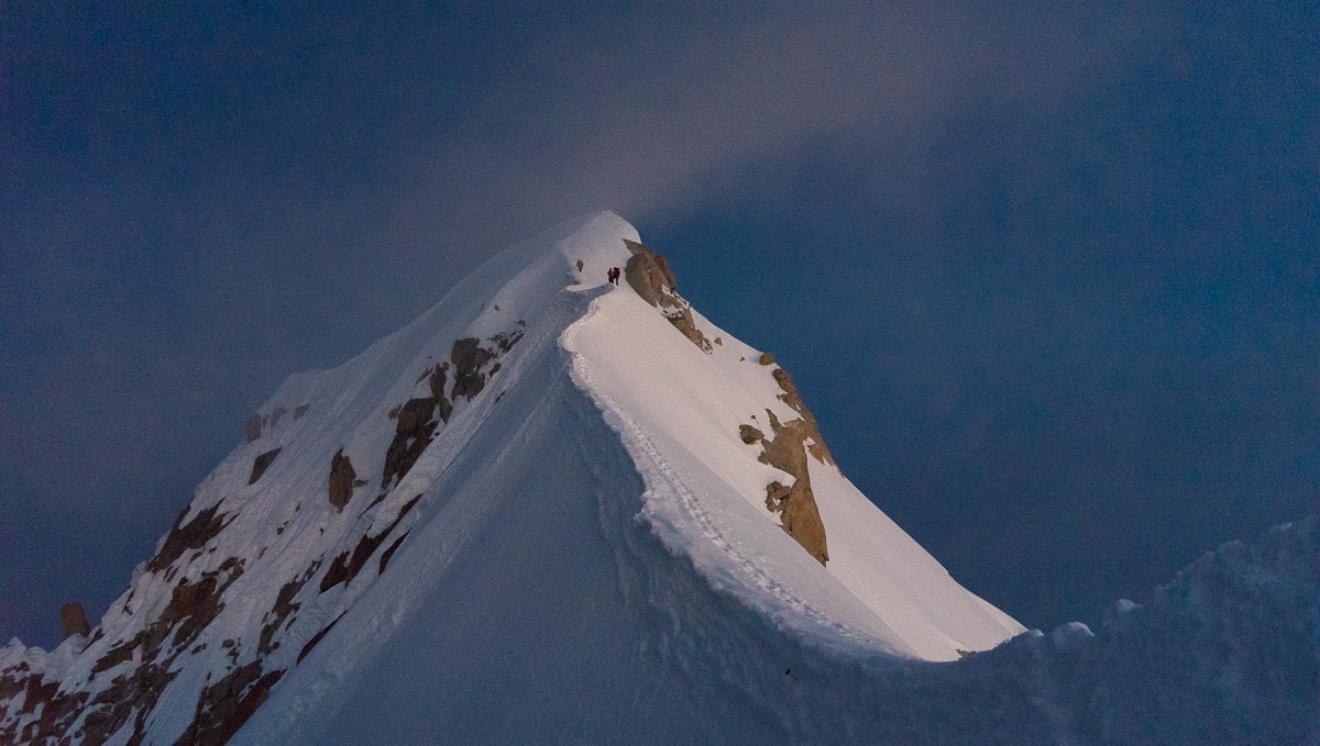 Dazwischen erleichtern immer wieder gute Spuren den Anstieg in der 500 Meter hohen Rinne - zwischen 45 und 55 Grad steil - erheblich. Um fünf Uhr früh, nach zweieinhalb Stunden Frontalzacken-Feeling (Servus, die Wadeln!) stehen wir am Ausstieg des Couloirs. Erst jetzt beginnt der Tag. Der Horizont färbt sich leicht orange. Wir klettern erst noch auf die Grande Rocheuse, während zwei weitere Seilschaften den scharfen Grat auf die Verte unter die Eisen nehmen. Kurz und knackig wird unser Abstecher auf den Nachbar-Viertausender. Die Finger sind klirrkalt. Nun geht die Sonne auf und taucht die vorbeiziehenden Nebelschwaden in intensivere Farben, als eine Orange je im Supermarkt-Neonlicht strahlen könnte. Alles leuchtet um uns! Wir frieren. Und freuen uns.