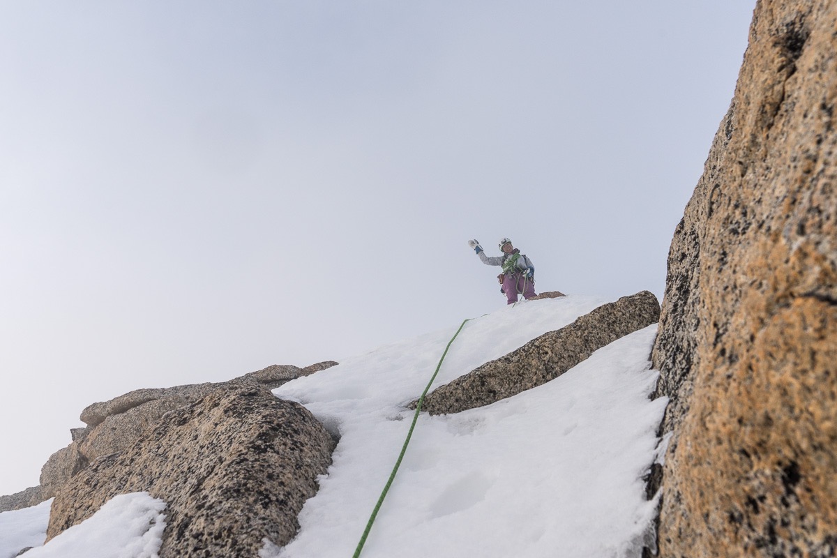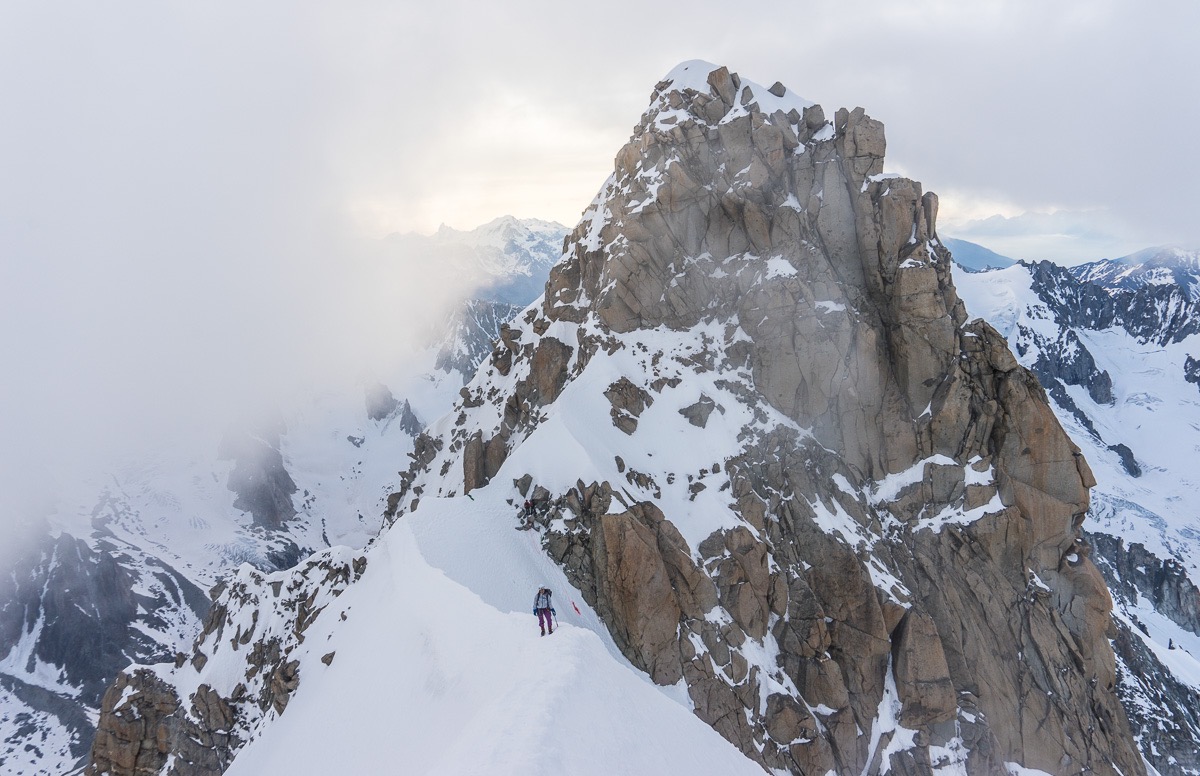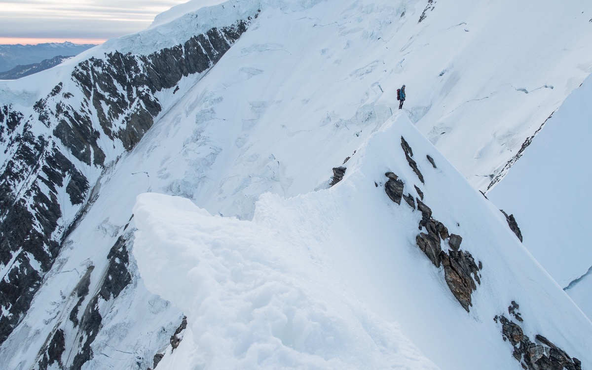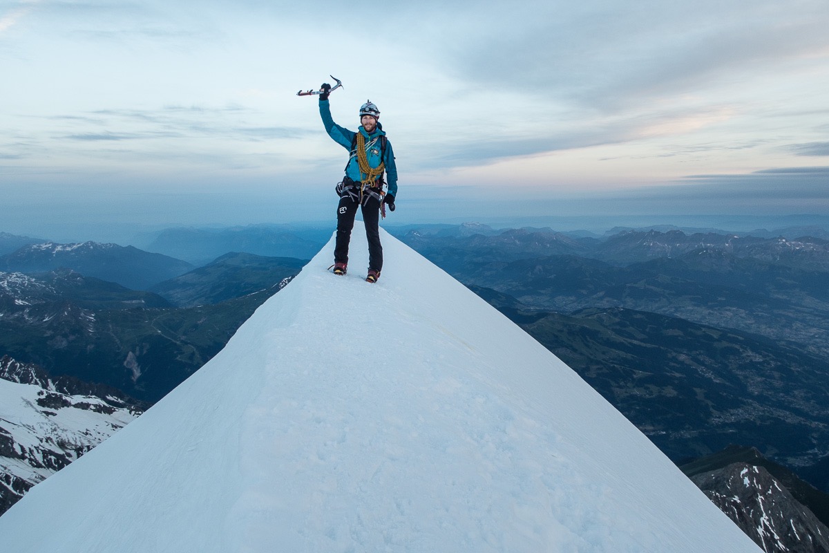 Dazwischen erleichtern immer wieder gute Spuren den Anstieg in der 500 Meter hohen Rinne - zwischen 45 und 55 Grad steil - erheblich. Um fünf Uhr früh, nach zweieinhalb Stunden Frontalzacken-Feeling (Servus, die Wadeln!) stehen wir am Ausstieg des Couloirs. Erst jetzt beginnt der Tag. Der Horizont färbt sich leicht orange. Wir klettern erst noch auf die Grande Rocheuse, während zwei weitere Seilschaften den scharfen Grat auf die Verte unter die Eisen nehmen. Kurz und knackig wird unser Abstecher auf den Nachbar-Viertausender. Die Finger sind klirrkalt. Nun geht die Sonne auf und taucht die vorbeiziehenden Nebelschwaden in intensivere Farben, als eine Orange je im Supermarkt-Neonlicht strahlen könnte. Alles leuchtet um uns! Wir frieren. Und freuen uns.