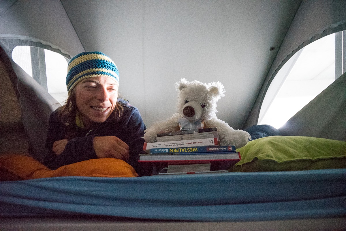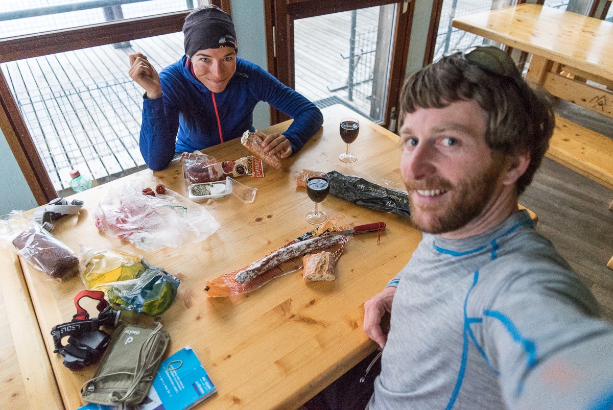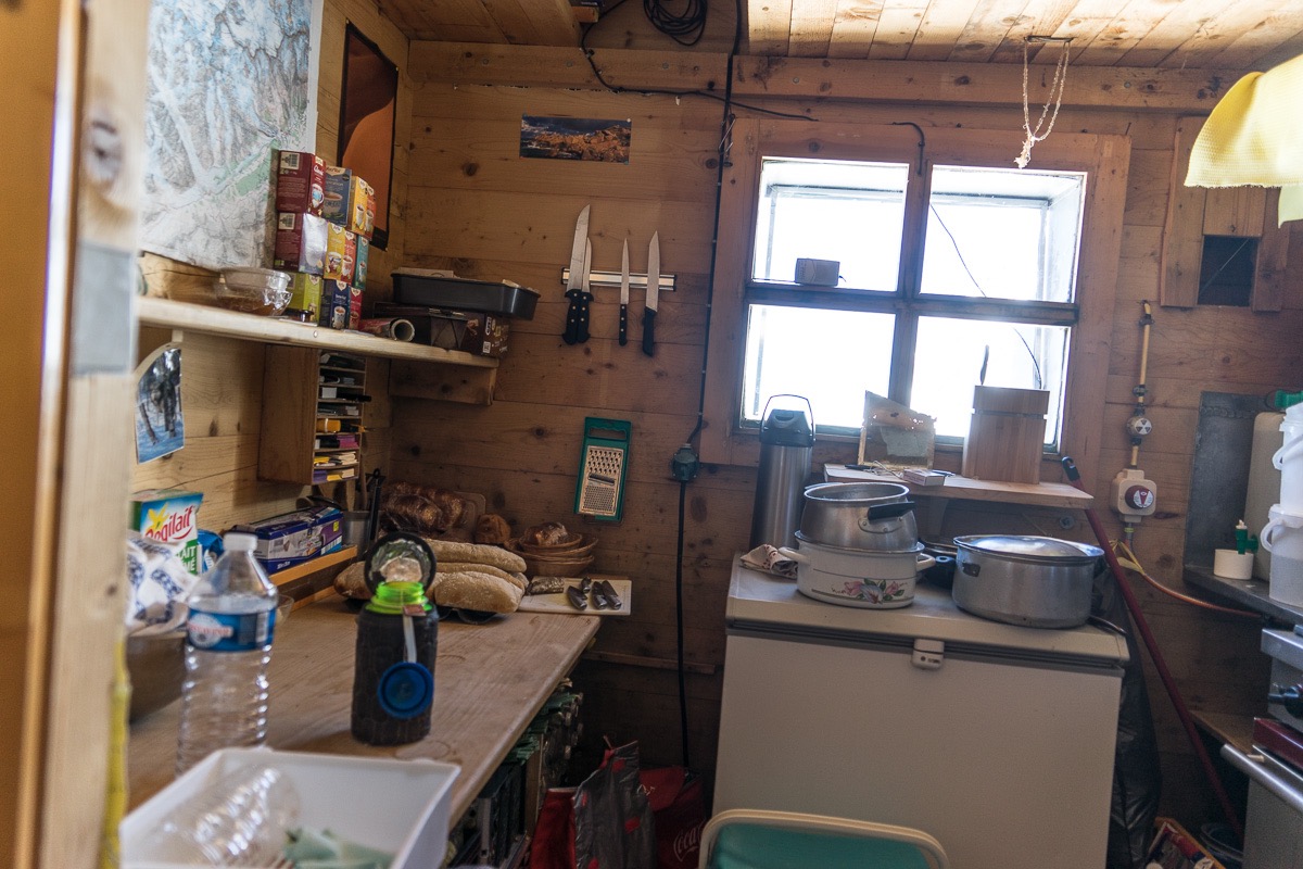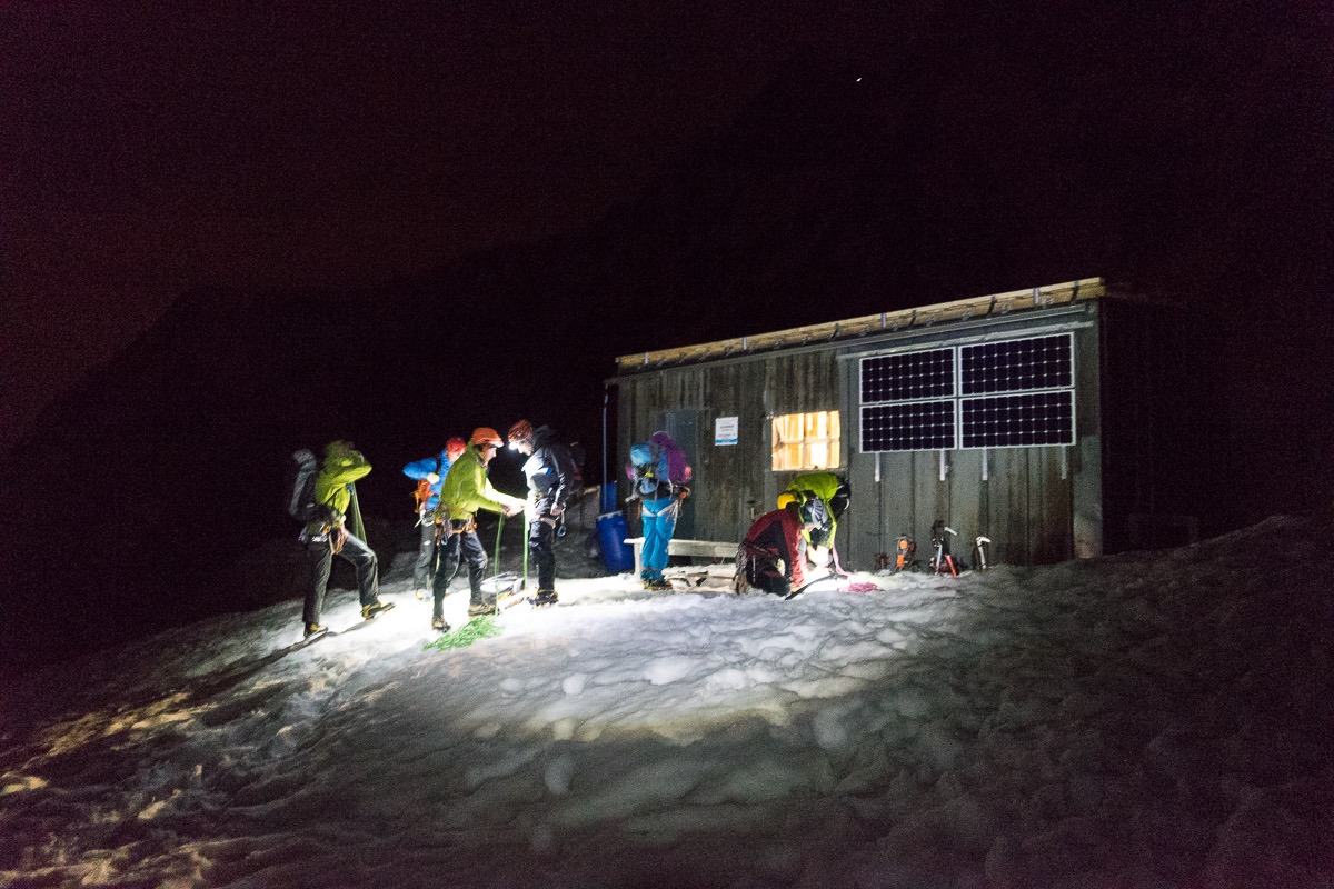 Auf dem einzigen Holztisch mitten im Mini-Verschlag haben nur acht Leute Platz. Wir sind heute überfüllt und essen im Schicht-Betrieb. Weil wir zuerst auf der Hütte ankamen, durften wir auch in der ersten Gruppe Abend essen und frühstücken. Denn spätestens vor der Schlüsselstelle auf die Bionassay käme es ohnehin wieder zu Wartezeiten. Also lässt sie die vermeintlich Schnelleren voran.