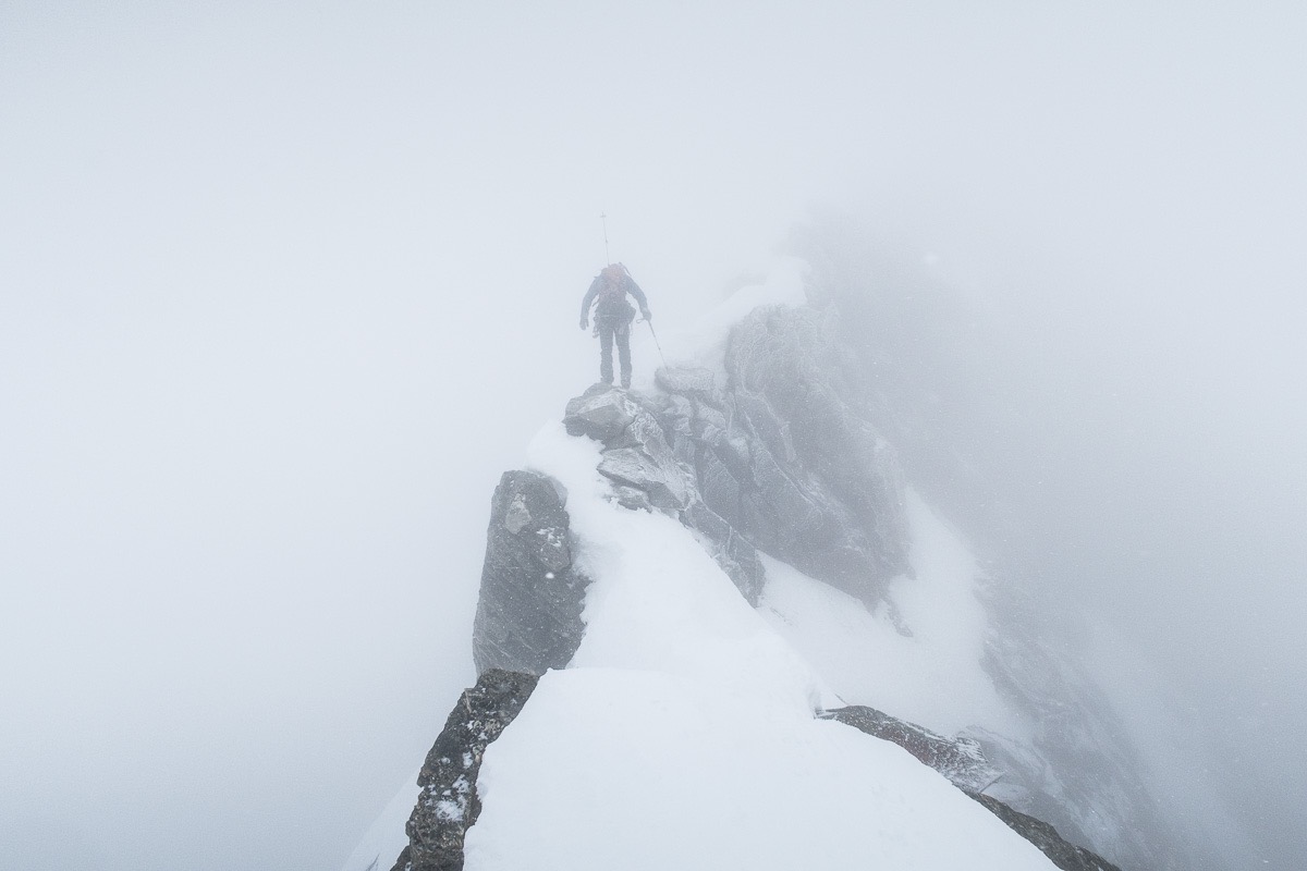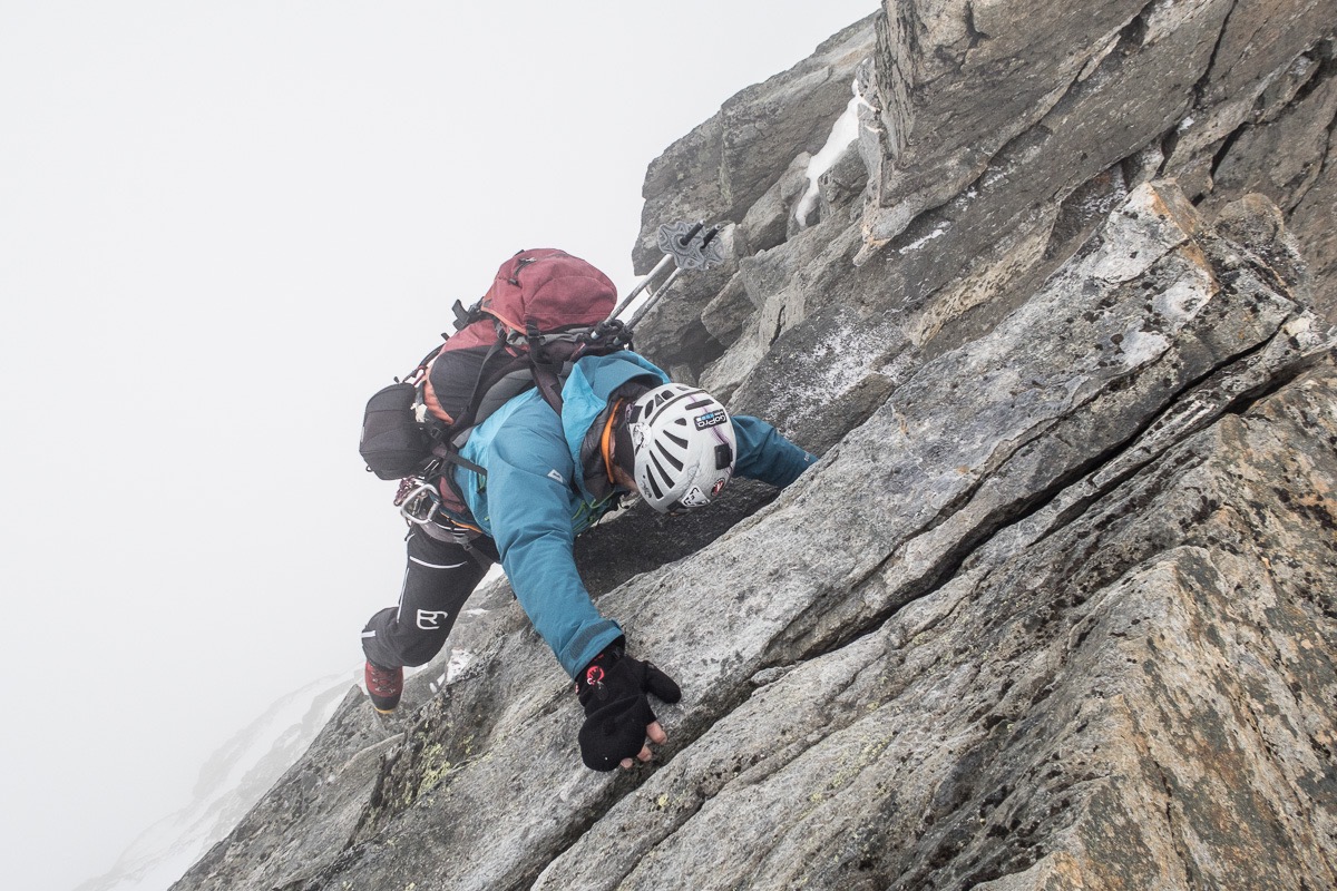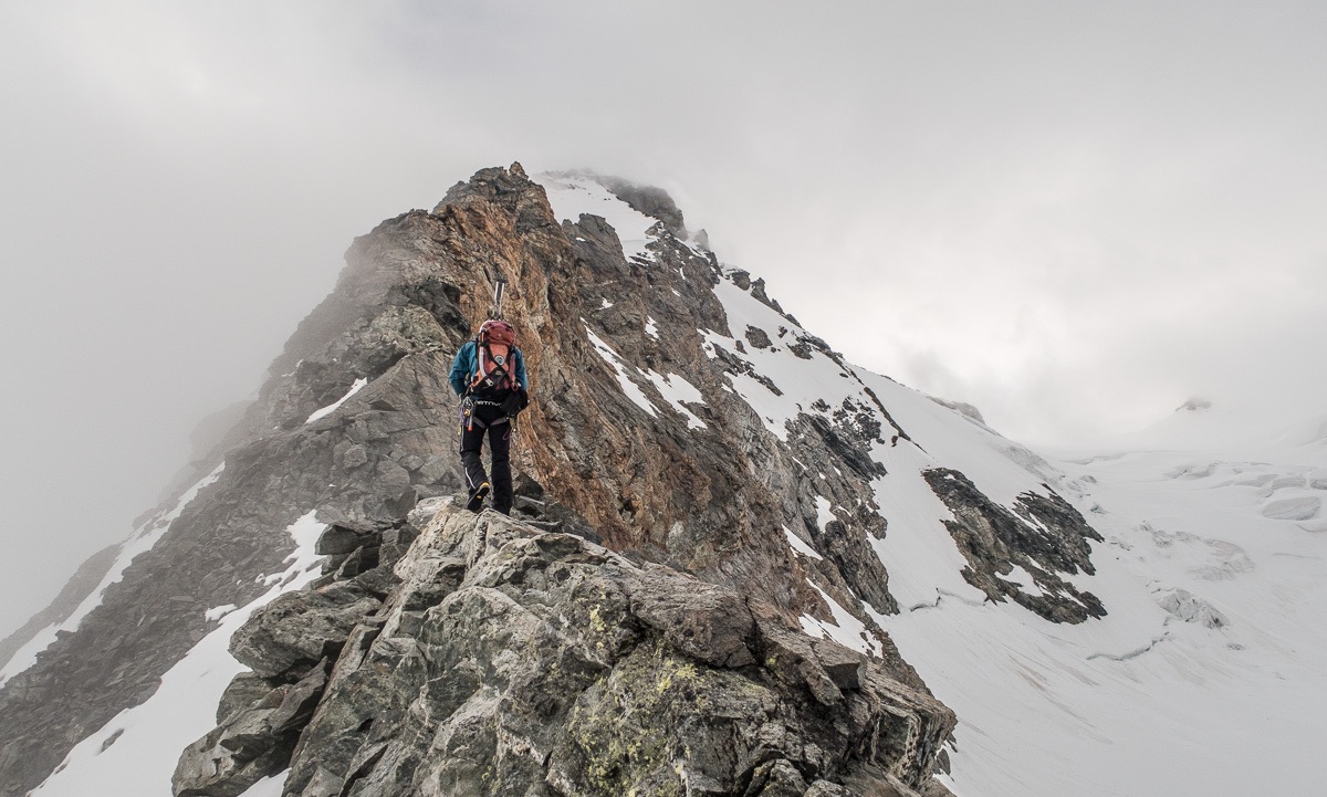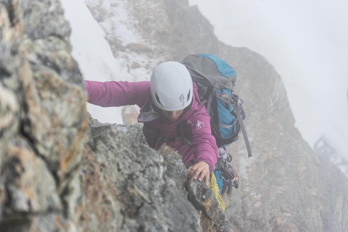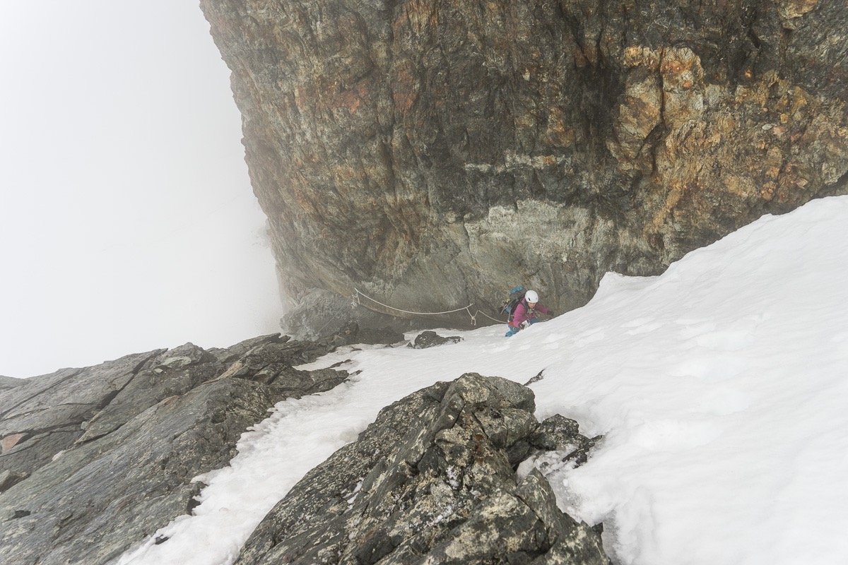 Der Wind ist umwerfend. Aber noch ein paar Schritte, bis wir ins Tiefmattenjoch sehen. Diese berüchtigte und brüchige Einstiegshürde auf den West-Grat. Und siehe da! Zumindest für einen kurzen Augenblick weht der Wind noch stärker, dass er die Schönheit enthüllt und zumindest die Wolken kurz vorbei schiebt. Na gut, noch ein paar Schritte.