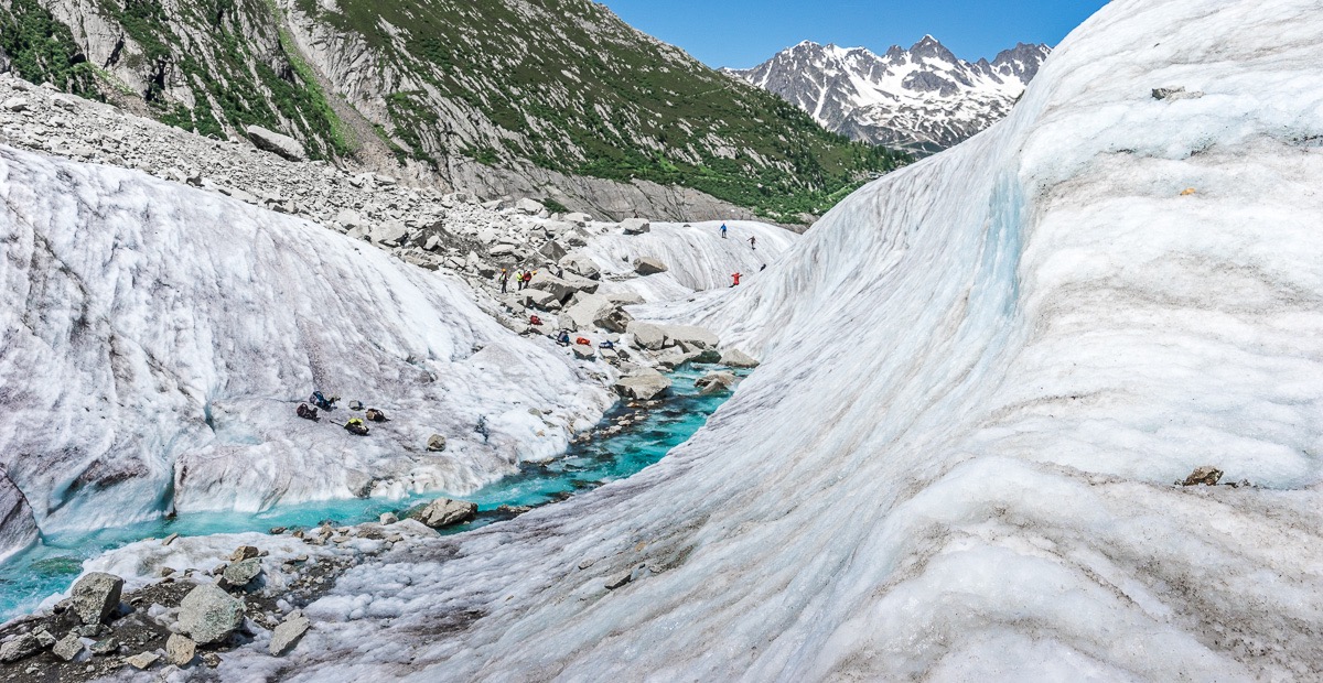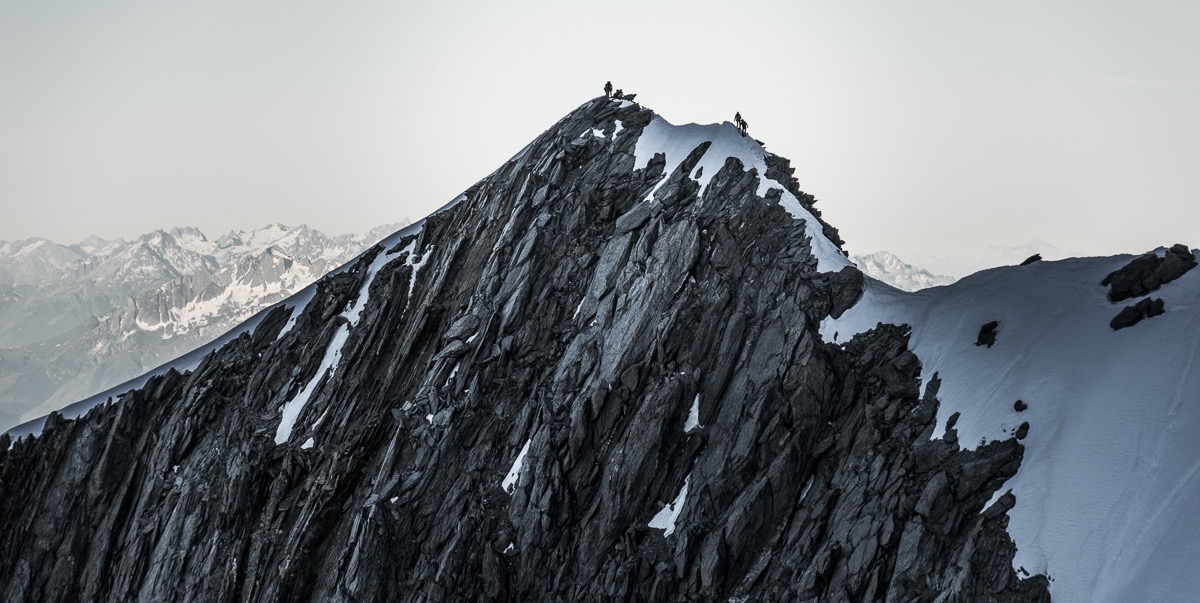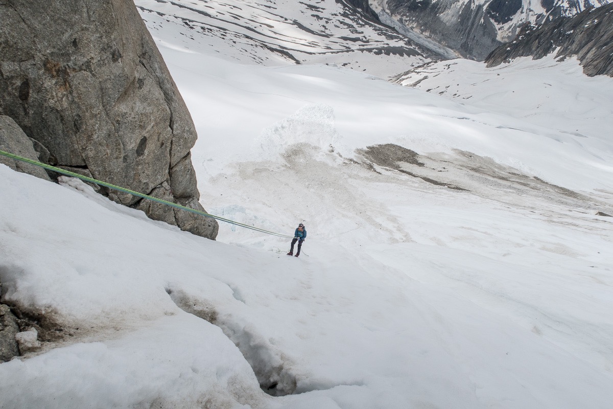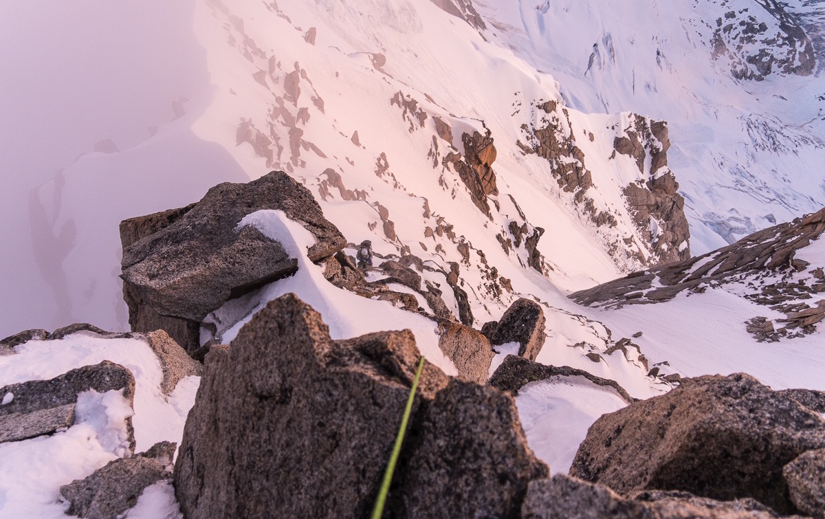 Nach einem halb freihängenden Abseilmanöver sind wir retour im Col de la Grande Rocheuse. Die wenigen Schritte hinüber auf die Aiguille Verte sind atemberaubend und abgrundtief zugleich. Schmal schlängelt sich der Firngrat auf ihren höchsten Punkt. Dort gibt's eine feste Umarmung, die Zeit steht still. Der Blick schweift in alle Himmelsrichtungen. Aber bald wieder zurück in das Couloir. Wir wollen es verlassen haben, ehe die Sonne als Weichspüler einwirkt und die Steine rumpeln lässt. Eine Zweier-Seilschaft überholen wir bei einem von gefühlten zehn Abseilmanövern. Schnelligkeit heißt in diesem Fall Sicherheit.