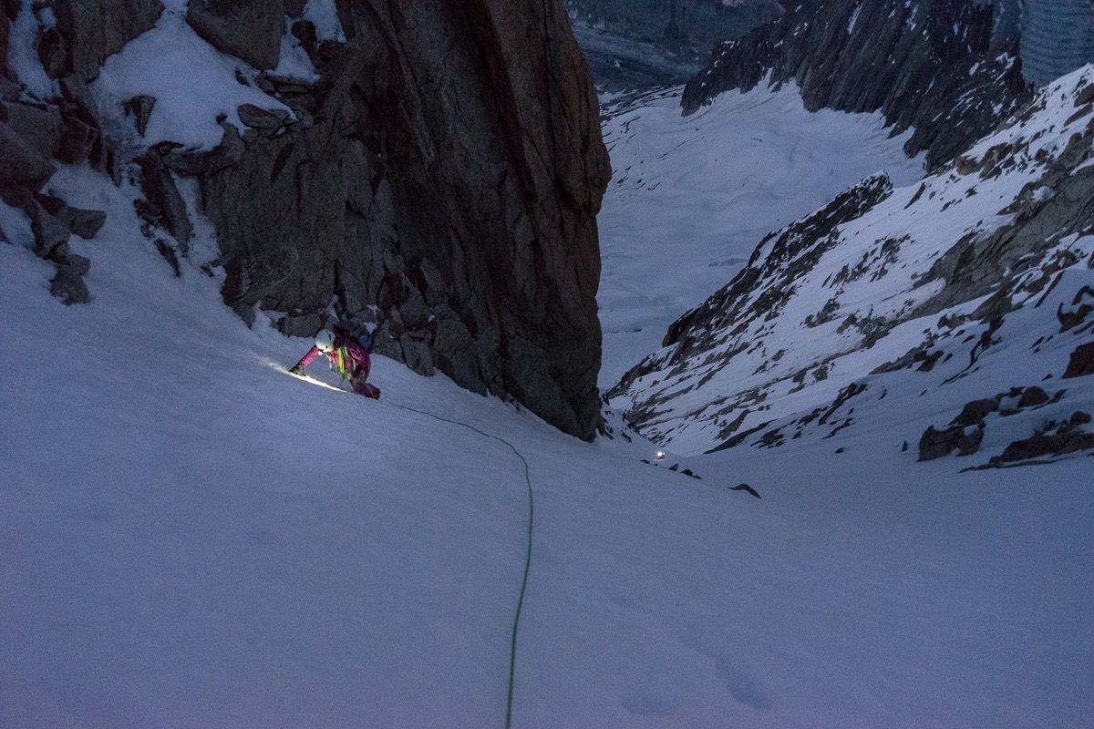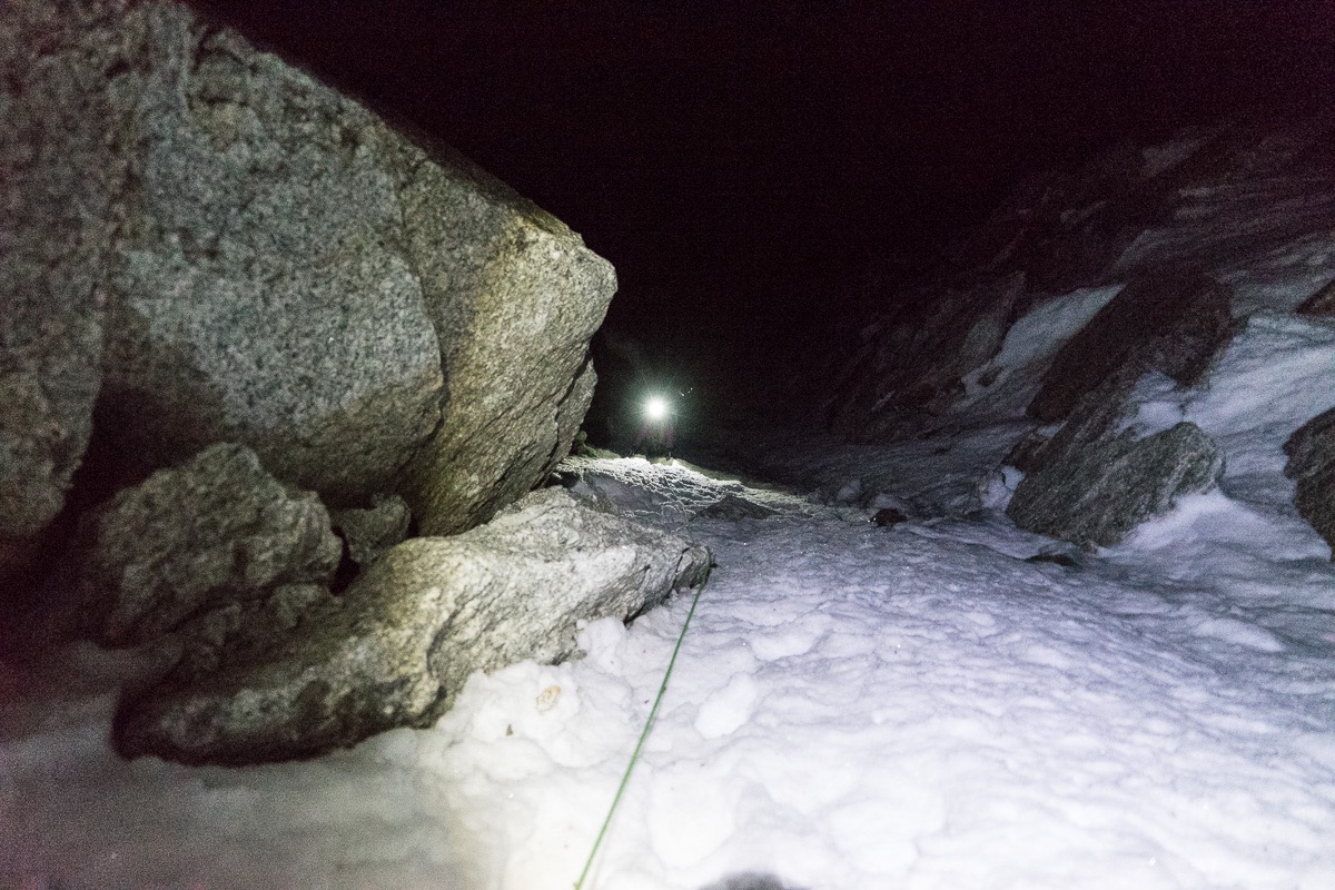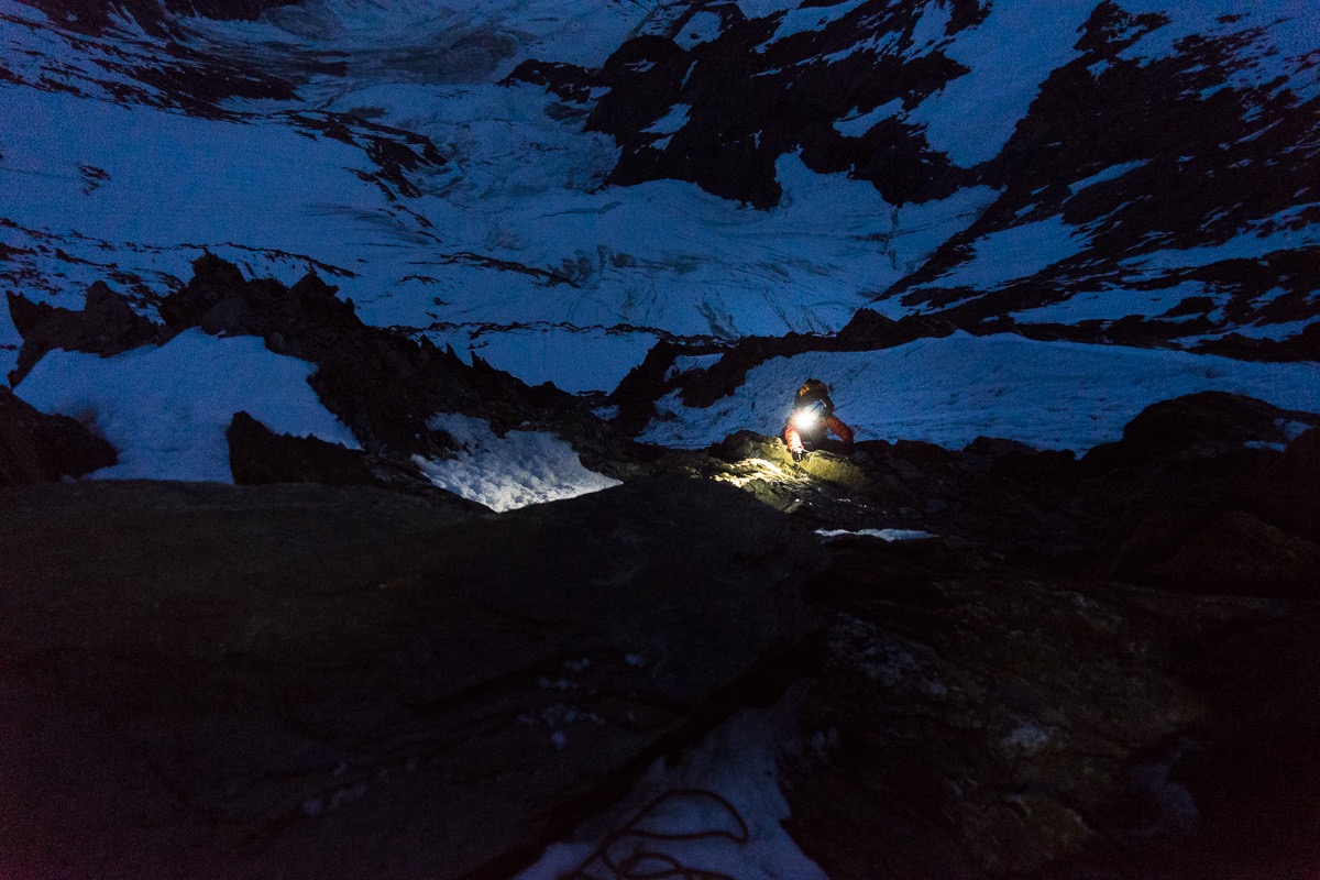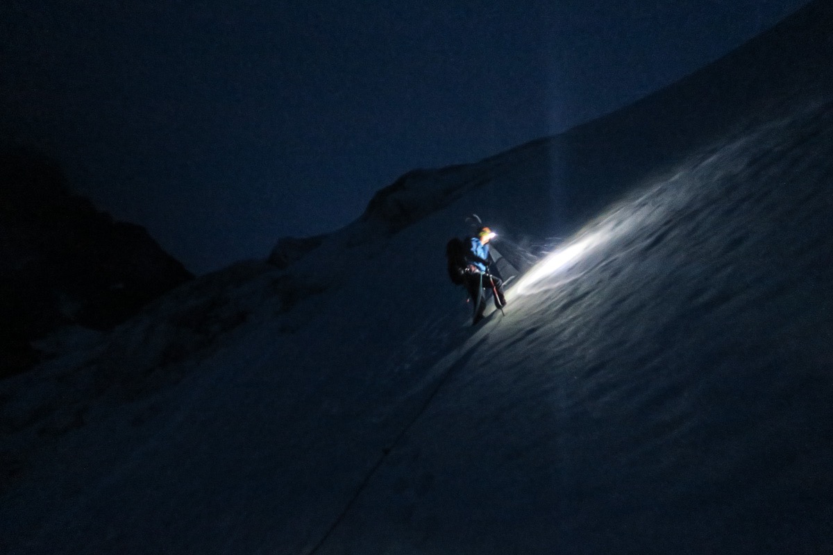 Um Mitternacht zweifeln wir an unserem Verstand. Nur zweieinhalb Stunden nach dem Sonnenuntergang sitzen wir beim Frühstück. Stopfen uns ein paar Bissen Brot in den Mund. Und ziehen verschlafen los im Schein unserer Stirnlampen. Die Dunkelheit ist noch da, als wir uns im Einstieg zum Whymper Couloir befinden. Das ist vielleicht auch gut so, dass wir nicht alles genau sehen. Den wilden Bergschrund. Den Felsaufschwung, mit einer dünnen Eisglasur überzogen.
